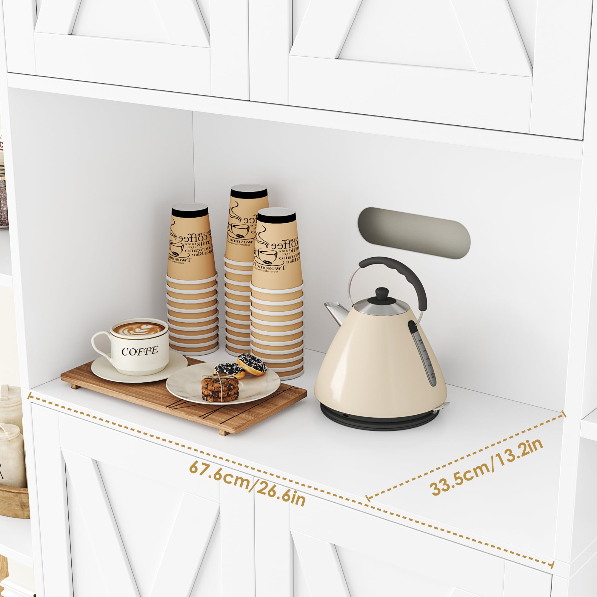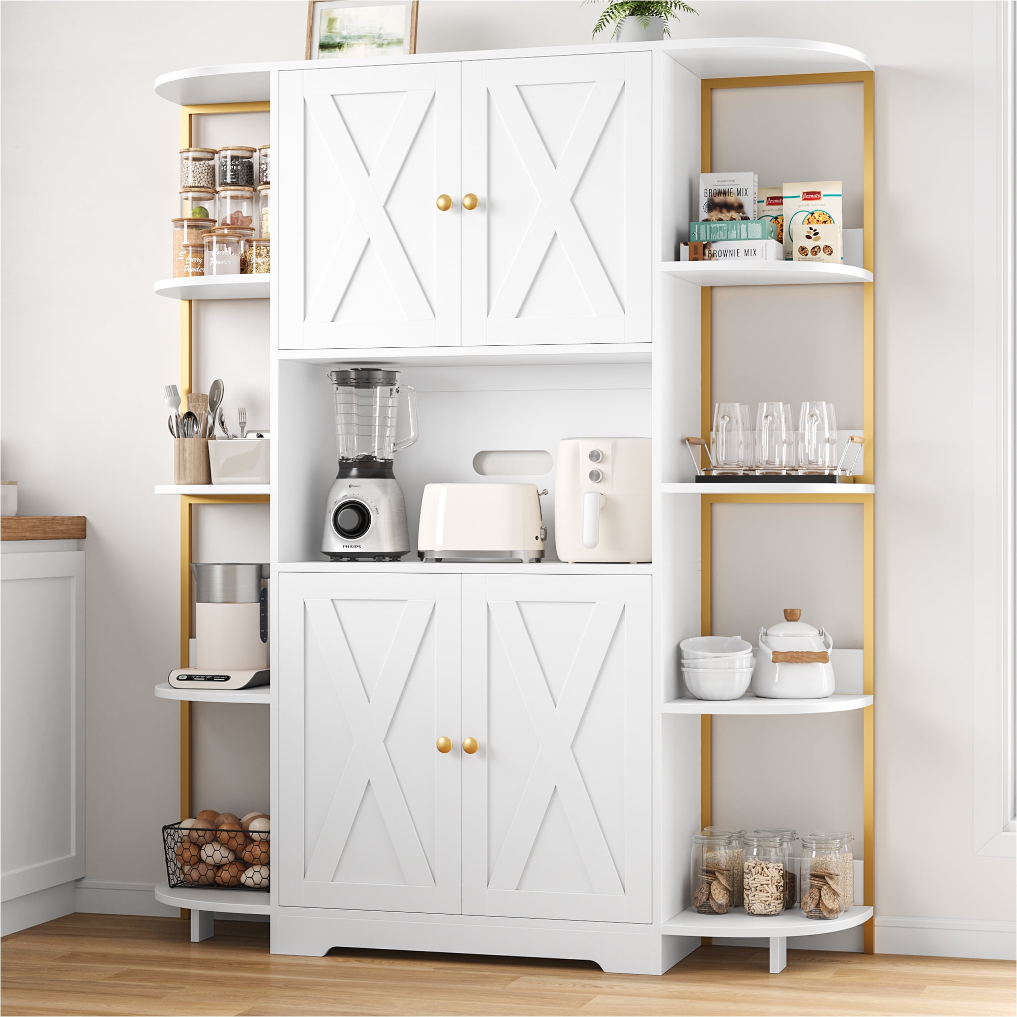 Homfa 67″ Tall Farmhouse Kitchen Pantry Cabinet with Microwave Stand and 8 Shelves, 4 Doors Freestanding Buffet Hutch, White