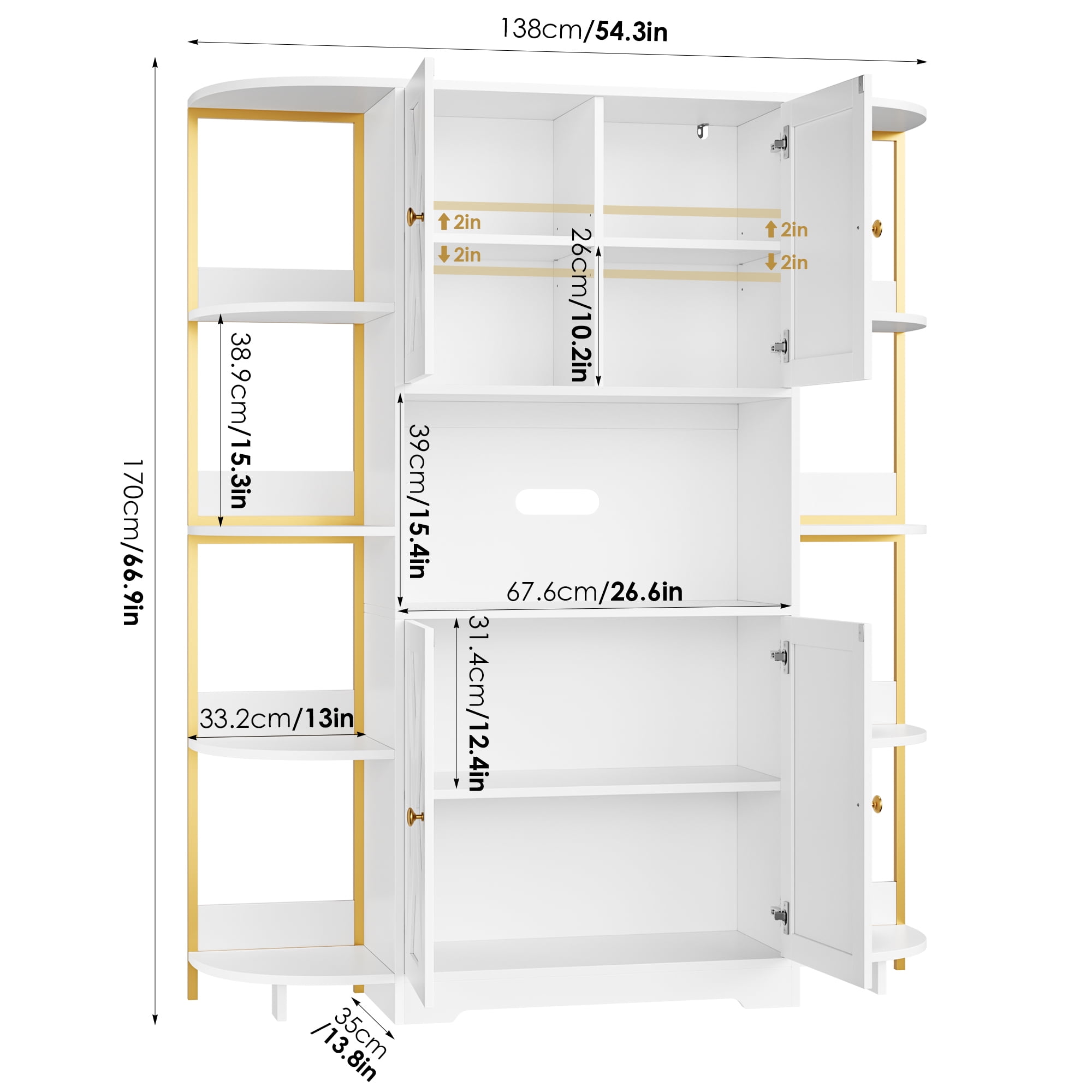 Features 【Upgrade Kitchen Storage Space】The tall kitchen storage cabinet has 8 open compartments, 2 cabinets with door, and a microwave stand for different storage needs. 【Modern Farmhouse Pantry Cabinet】The pantry storage cabinet creates an essential storage space for your pots and pans while adding a pop of rustic glamour to your space. 【Stable & Sturdy】Our kitchen pantry cabinet are rugged and solid, even after prolonged use, without rocking. With stable construction and extra support feet, it can hold up to 60 pounds per shelf. 【Anti-toppling Device】The white pantry cabinet is equipped with anti-tippling device to protect the safety of the family. 【Easy to Assemble】The wooden storage cabinet comes with all mounting hardware and detailed instructions; 2 adults can complete it easily in 1 hour. Quality customer service saves you from the worry of lost and damaged parts. 【24/7 Customer Service】We provide quality customer support. If you have any questions, please email us, and we will reply within 24 hours. Specifications Color: White Material: Manufactured Wood, Iron Overall Size: 67″ H x 54″ W x 13.8″ D Shelf Weight Capacity: 60 lbs Number of Open Compartments: 8 Number of Interior Shelves: 4 Tip over Restraint Device Included: Yes Adult Assembly Required: Yes Packaging Includes 1 x Farmhouse Pantry Cabinet 1 x Assembly Kit 1 x Instructions