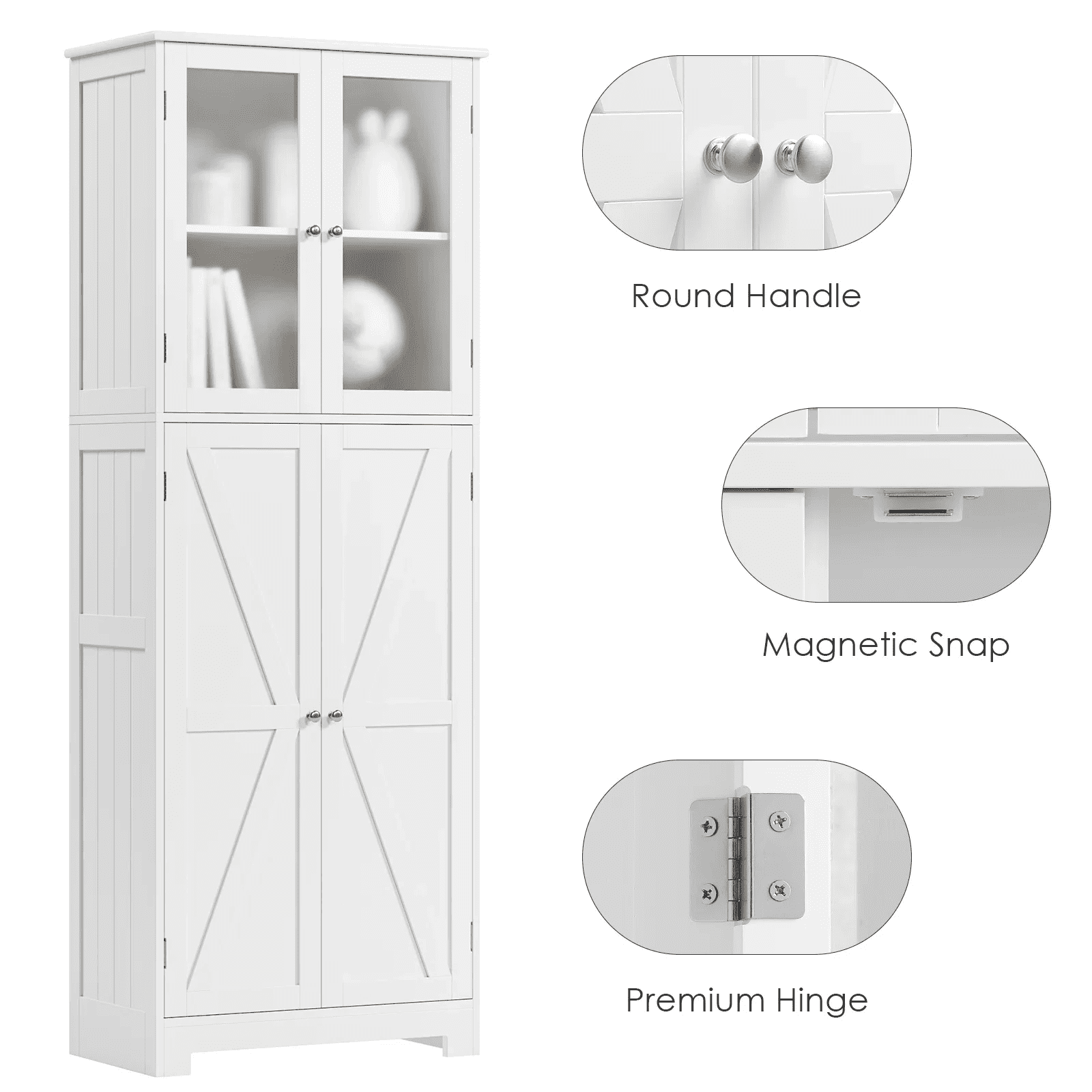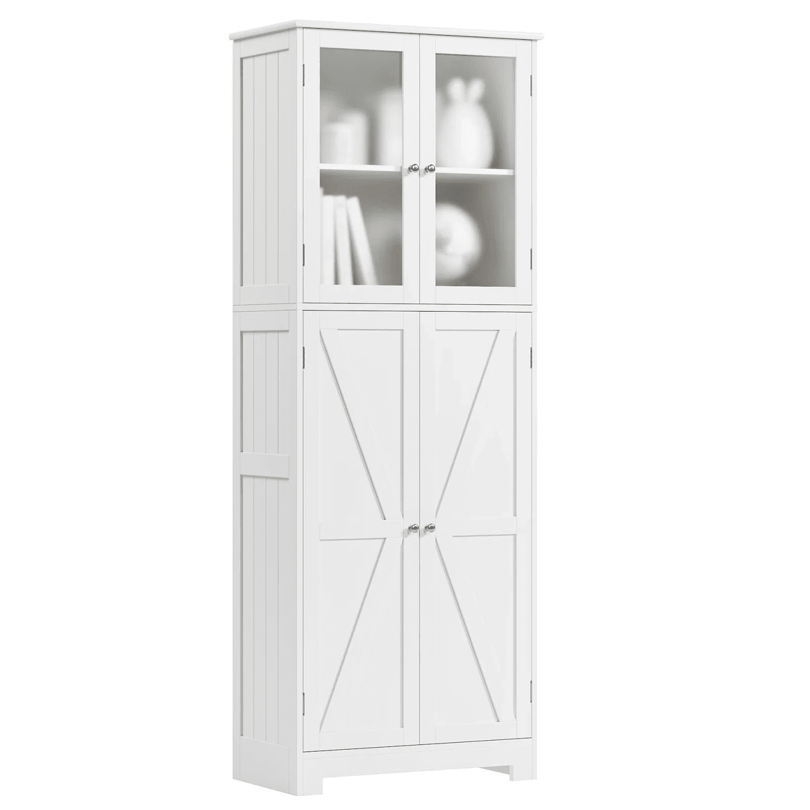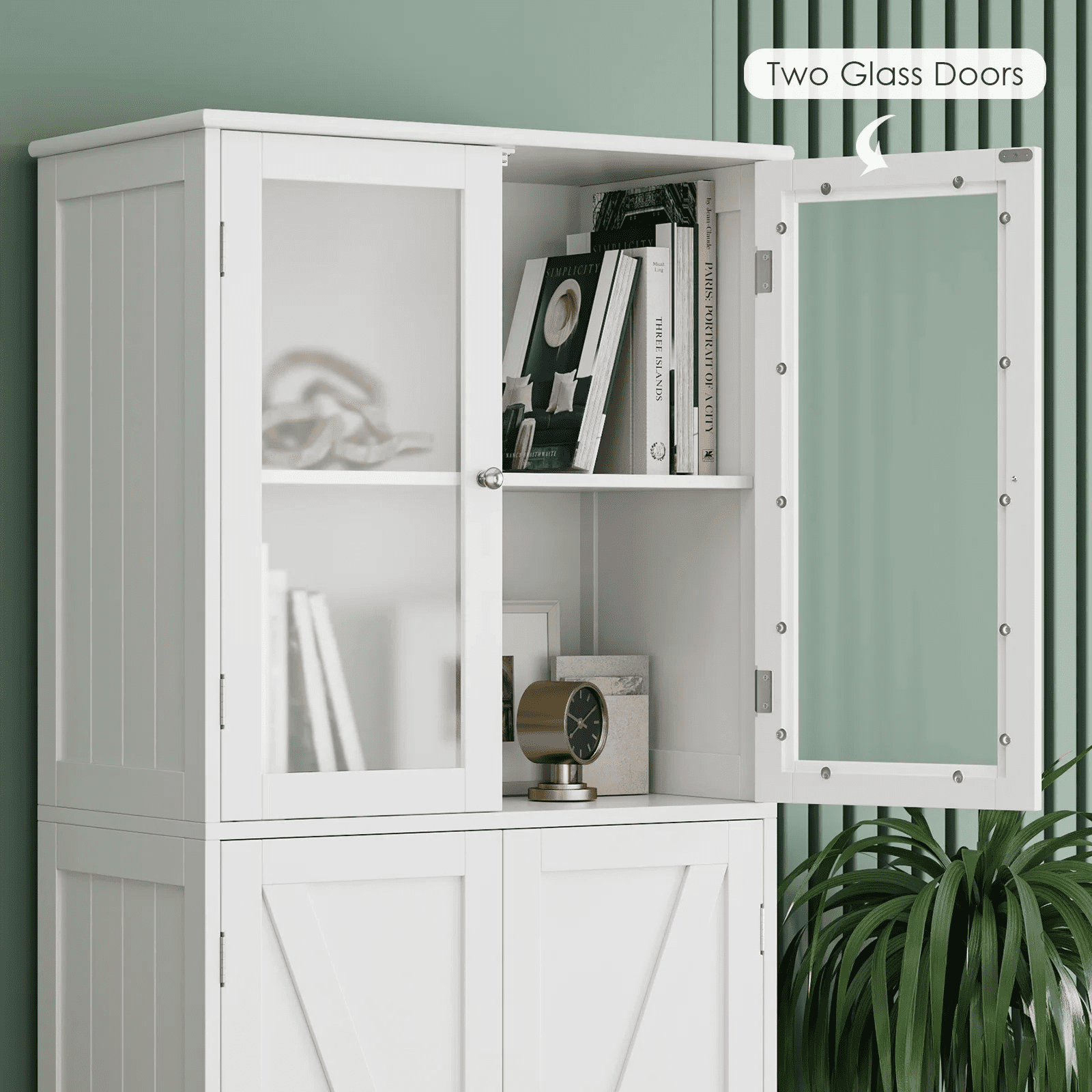 Homfa Farmhouse White Freestanding Bathroom Storage Cabinet with Glass Door: 【White Farmhouse Bathroom Cabinet】White clean straight lines and glass door make this white bathroom storage cabinet more elegant and beautiful, which can easily blend in various decoration styles. 【Plenty of Storage Space】67 inch bathroom cabinet with 5-tier shelves and 6 divided storage spaces, you can place anything in this cabinet. 【Multi-Occasion Use & Easy to Clean】Elegant and simple appearance, this white tall farmhouse cabinet will be suitable for various home decorations such as bathroom, living room, office, kitchen and hallway. Painted finish will be easy to daily clean keeping. 【Safety Anti-tip Device】This tall farmhouse bathroom cabinet is equipped with an anti-tip device, which makes this cabinet more stable in an upright position and can protect your family’s safety. 【Easy to Assemble】With the numbered parts and step-by-step instructions, even one person can easily assemble this white bathroom cabinet in just 1 hour. 【24/7 Customer Service】We provide quality customer support, if you have any questions with this white bathroom storage cabinet, please email us and we will reply within 24 hours. Specifications: Color: White Material: MDF Finish: White Painted Assembly Required: Yes Overall Dimension: 66.9 “L x 23.6 “W x 11.8 “H Packaging Includes: 1 x Bathroom Storage Cabinet 1 x Accessory Kit 1 x Manuals