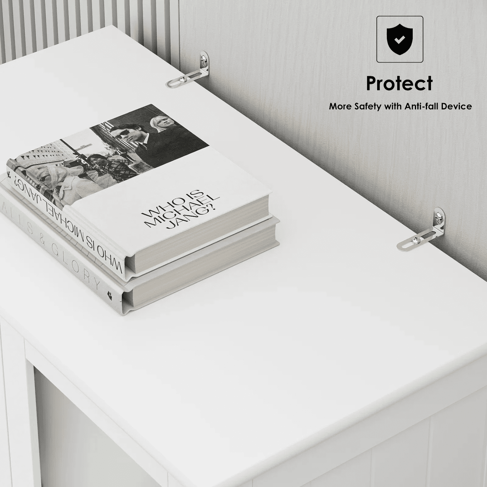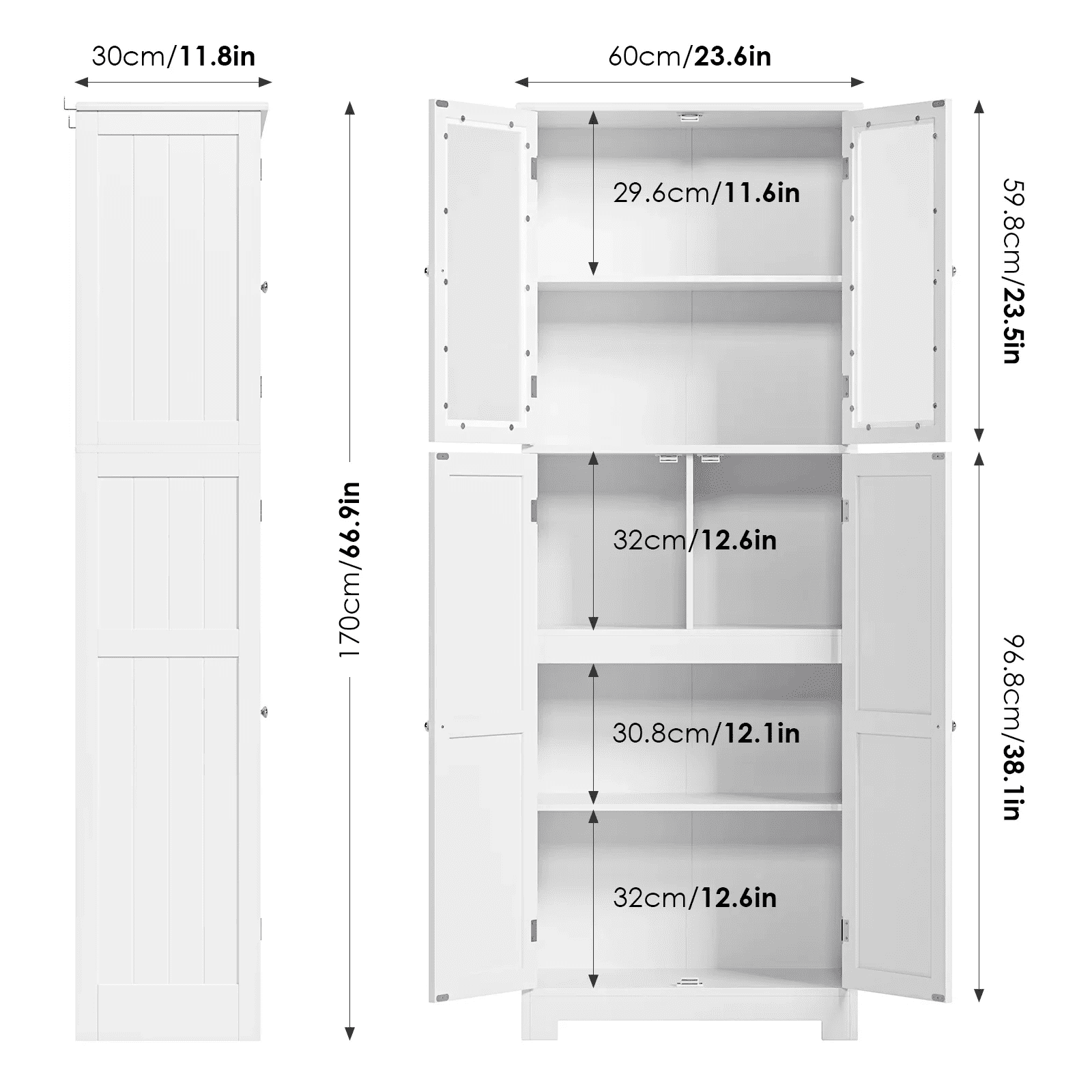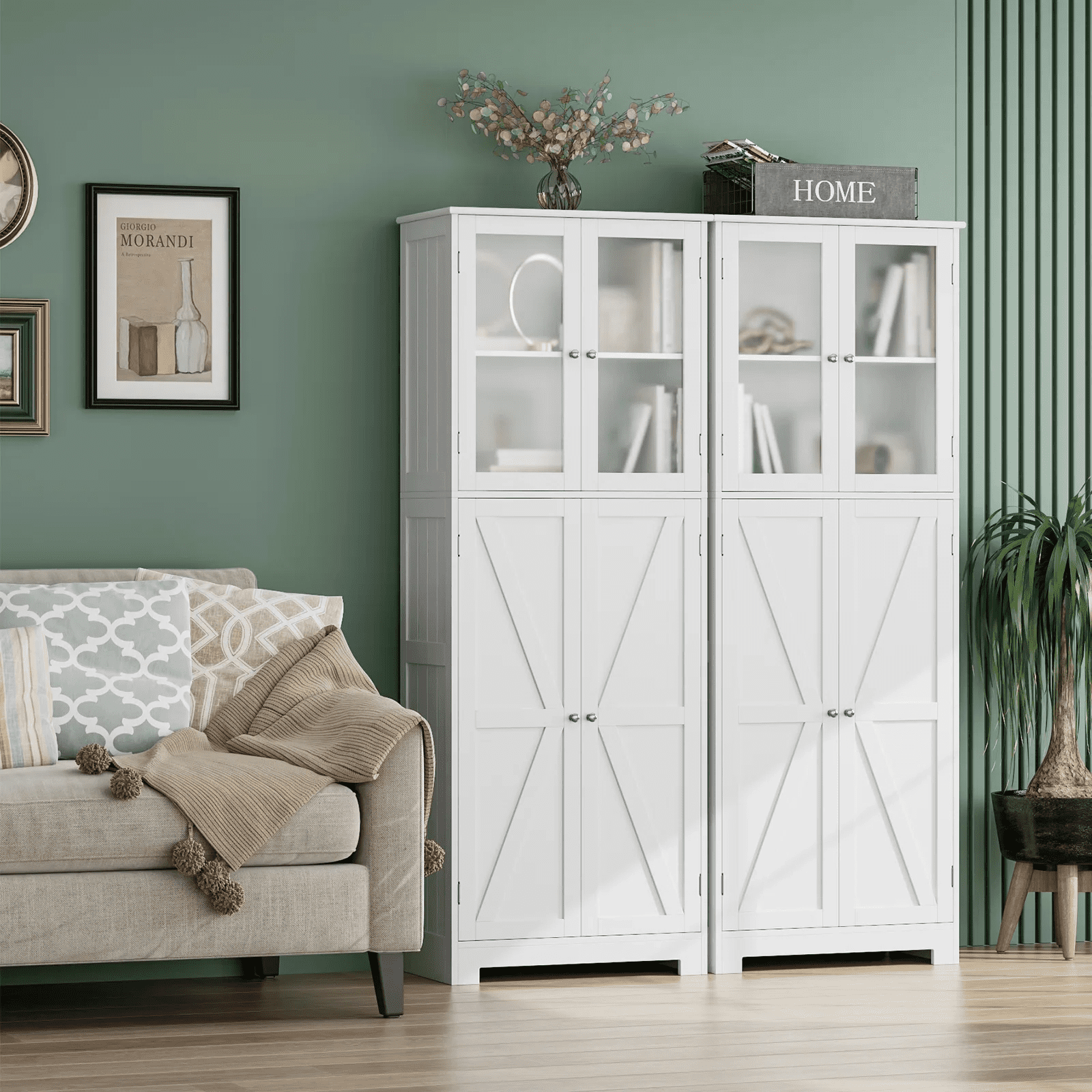 Homfa Farmhouse White Freestanding Bathroom Storage Cabinet with Glass Door: 【White Farmhouse Bathroom Cabinet】White clean straight lines and glass door make this white bathroom storage cabinet more elegant and beautiful, which can easily blend in various decoration styles. 【Plenty of Storage Space】67 inch bathroom cabinet with 5-tier shelves and 6 divided storage spaces, you can place anything in this cabinet. 【Multi-Occasion Use & Easy to Clean】Elegant and simple appearance, this white tall farmhouse cabinet will be suitable for various home decorations such as bathroom, living room, office, kitchen and hallway. Painted finish will be easy to daily clean keeping. 【Safety Anti-tip Device】This tall farmhouse bathroom cabinet is equipped with an anti-tip device, which makes this cabinet more stable in an upright position and can protect your family’s safety. 【Easy to Assemble】With the numbered parts and step-by-step instructions, even one person can easily assemble this white bathroom cabinet in just 1 hour. 【24/7 Customer Service】We provide quality customer support, if you have any questions with this white bathroom storage cabinet, please email us and we will reply within 24 hours. Specifications: Color: White Material: MDF Finish: White Painted Assembly Required: Yes Overall Dimension: 66.9 “L x 23.6 “W x 11.8 “H Packaging Includes: 1 x Bathroom Storage Cabinet 1 x Accessory Kit 1 x Manuals