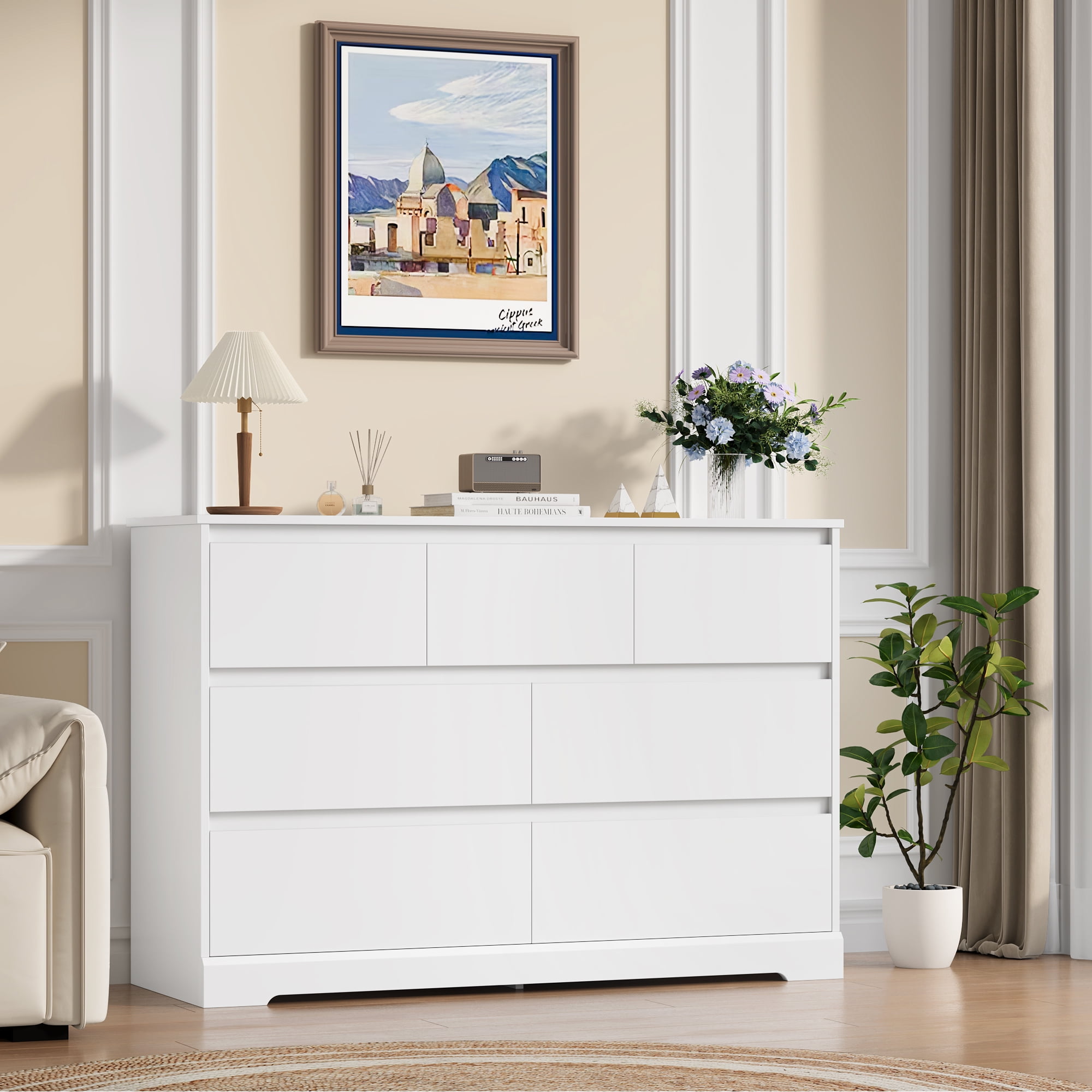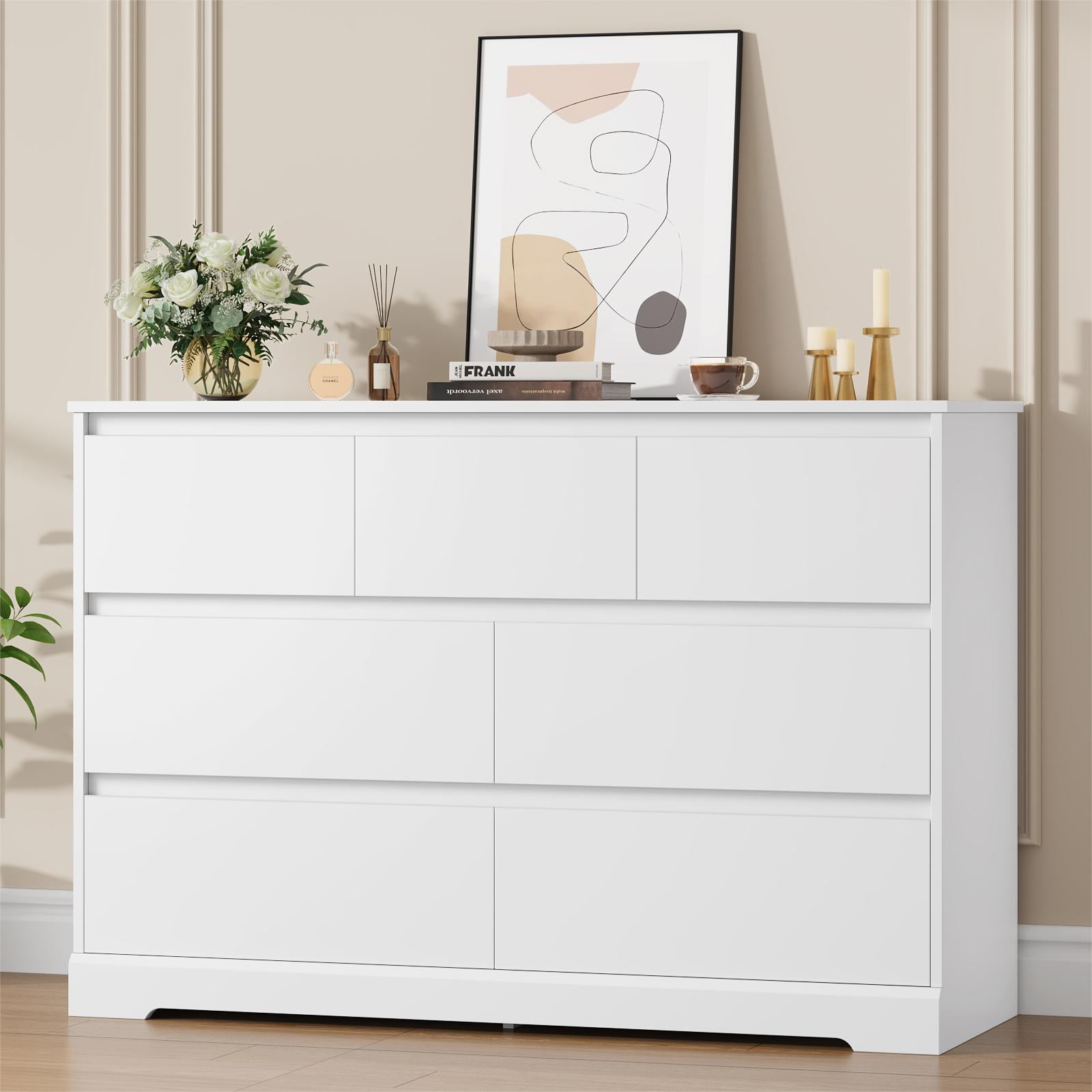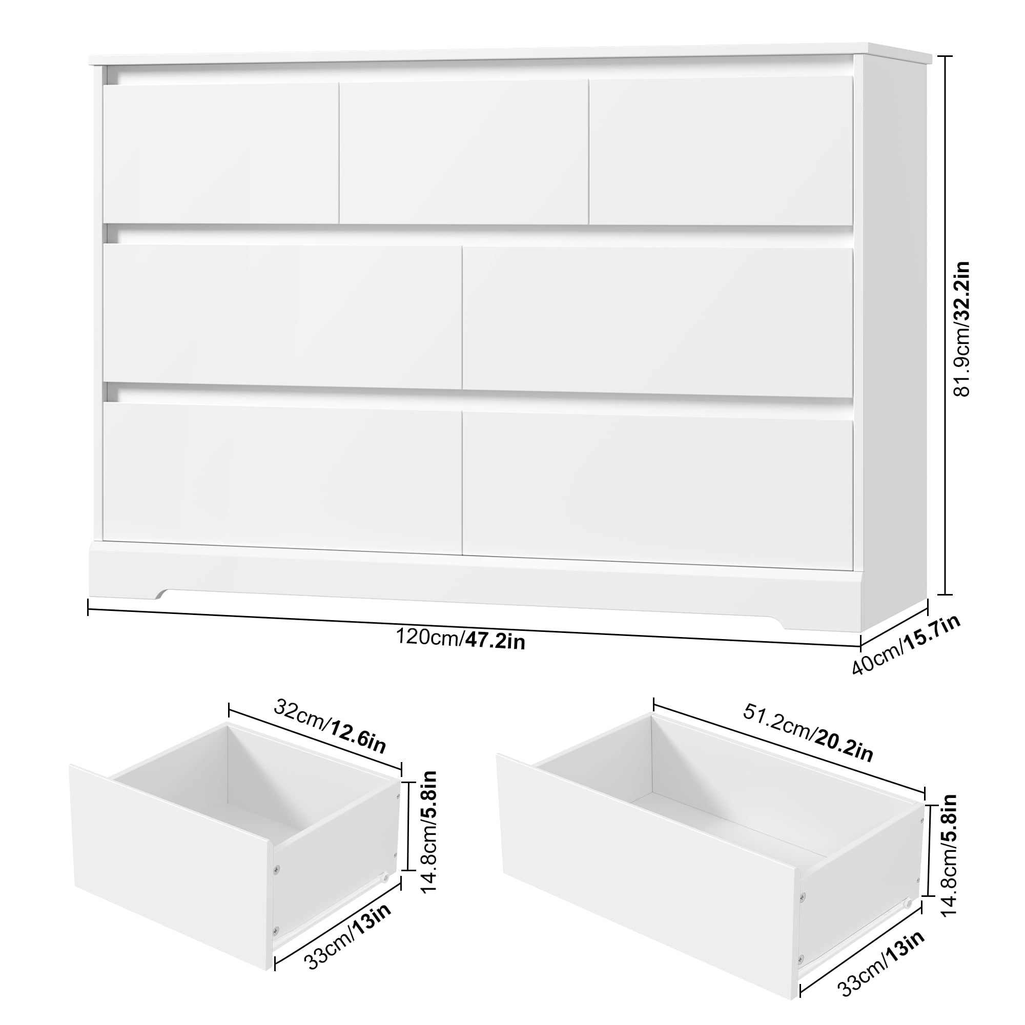 Homfa 7 Drawer Double Dresser: 7 Drawers in 2 Different Sizes – 7 drawers in different sizes and wide top surface of this white dresser for bedroom provide as much storage space as possible, clearly categorize different items such as toys, books, etc. to meet multiple storage needs. Contemporary White Dresser Appearance – Pure white dresser appearance bringing the ultimate minimalist style can be adapted to a variety of decorations. Simple Hidden Handles – Hidden handle-less chute drawers make our 7 drawer chest dresser more simple, focusing on practicality while creating a minimalist style home. Sturdy Structure + Anti-Falling Device=More Safety – Scientific assembly design and carefully selected wood ensure the stability and durability of this chest of drawers. 1 Anti-tip device prevents the wood dresser from tipping over! Protect your family. Durable & Easy-to-Clean – This 7 drawer dresser is made of high quality material, easy to daily clean and durable, the surface is finely crafted, dust and scratch resistant. Easy Assembly – Everything needed for assembly comes collected in a package sent to you. The 7 drawer white dresser could be easily assembled in less than 1 hour by 2 adults with the instructions. 24/7 Customer Service – We provide quality customer support, if you have any questions with this dresser, please email us and we will reply within 24 hours. Specifications: Material: MDF Wood + Metal Color: White Overall Size: 32.3” H x 47.2” W x 15.7” D Overall Product Weight: 135 lb. Number of Drawers: 7 Assembly Required: Yes Package Including: 1 x 7 Drawer Double Drawer 1 x Accessory Kit 1 x Instructions