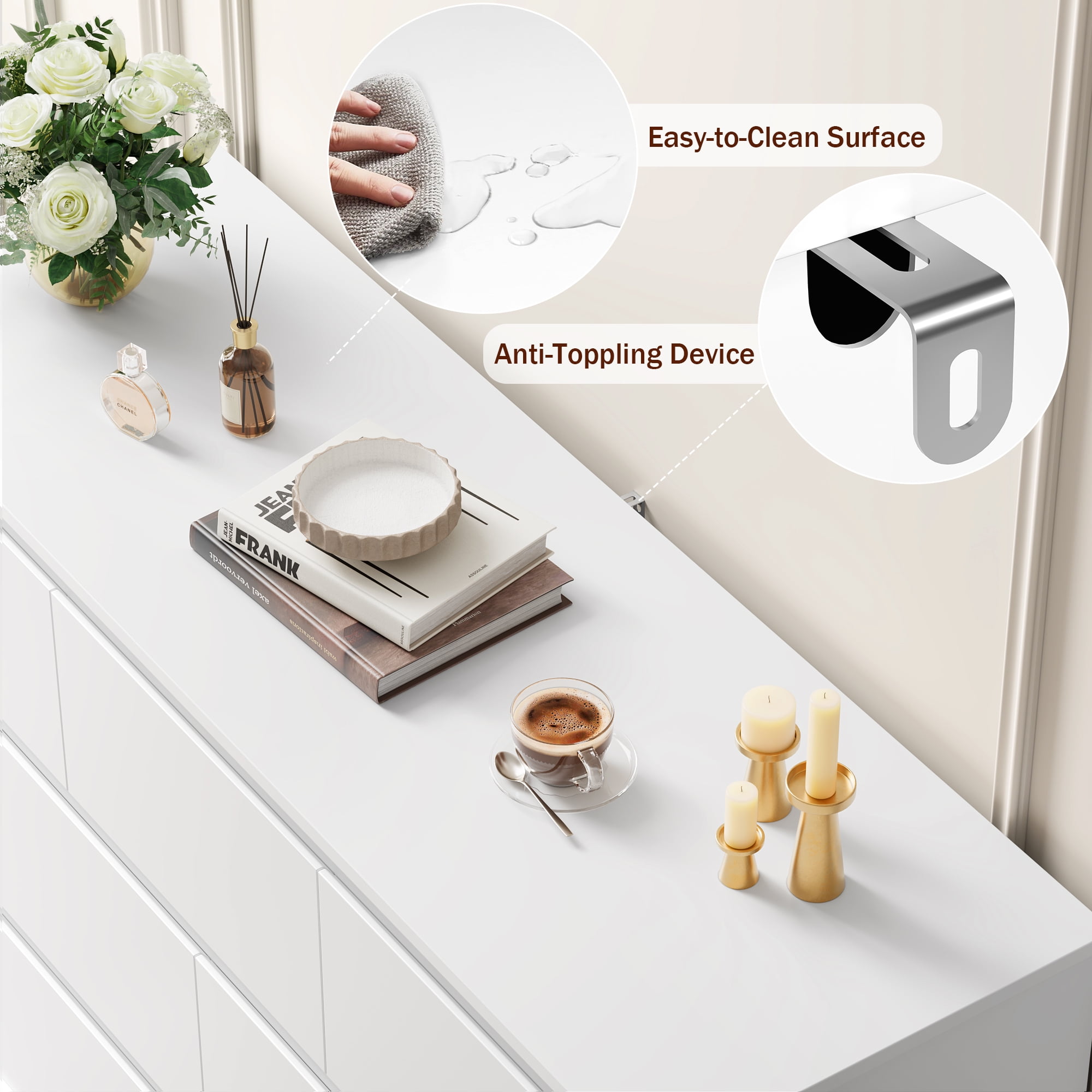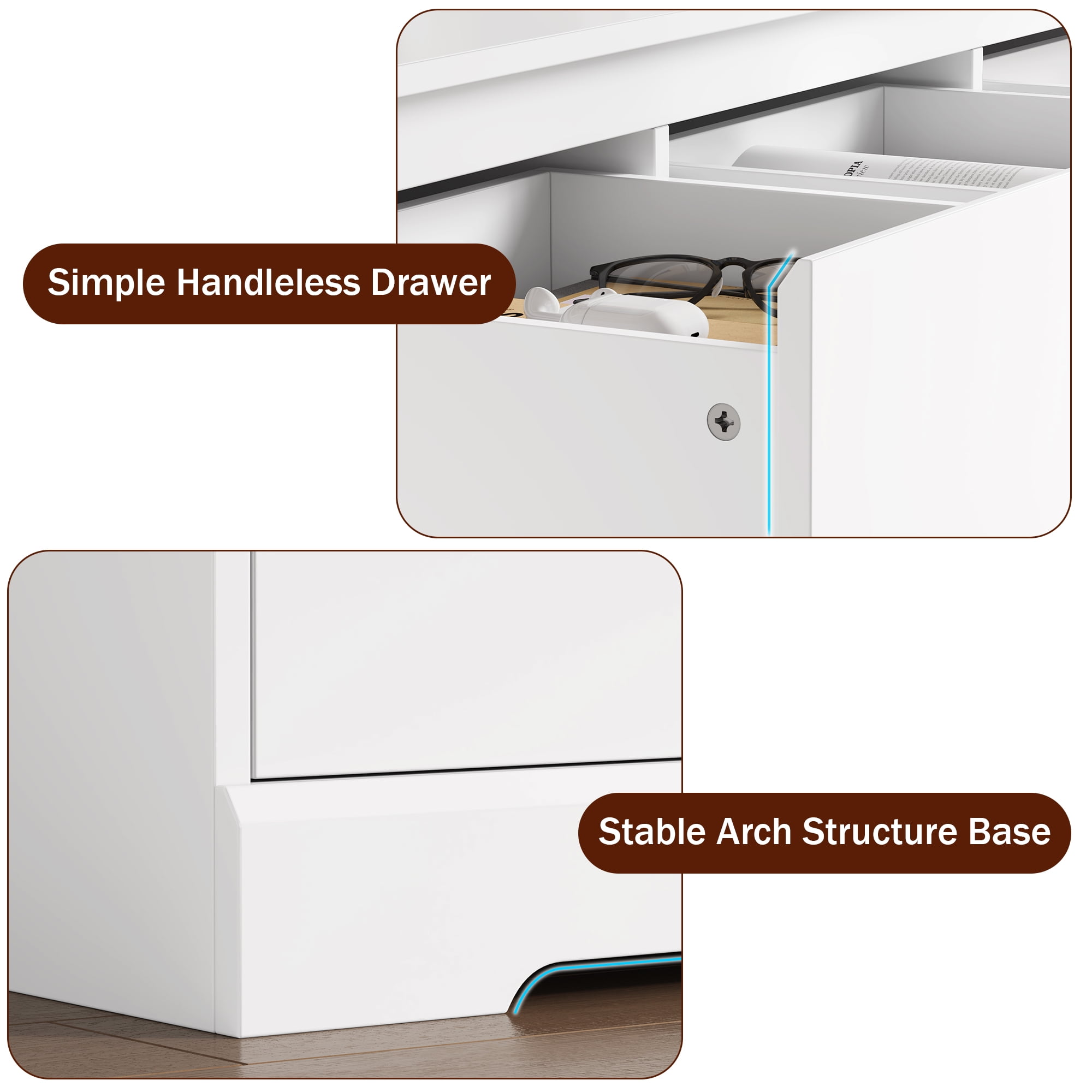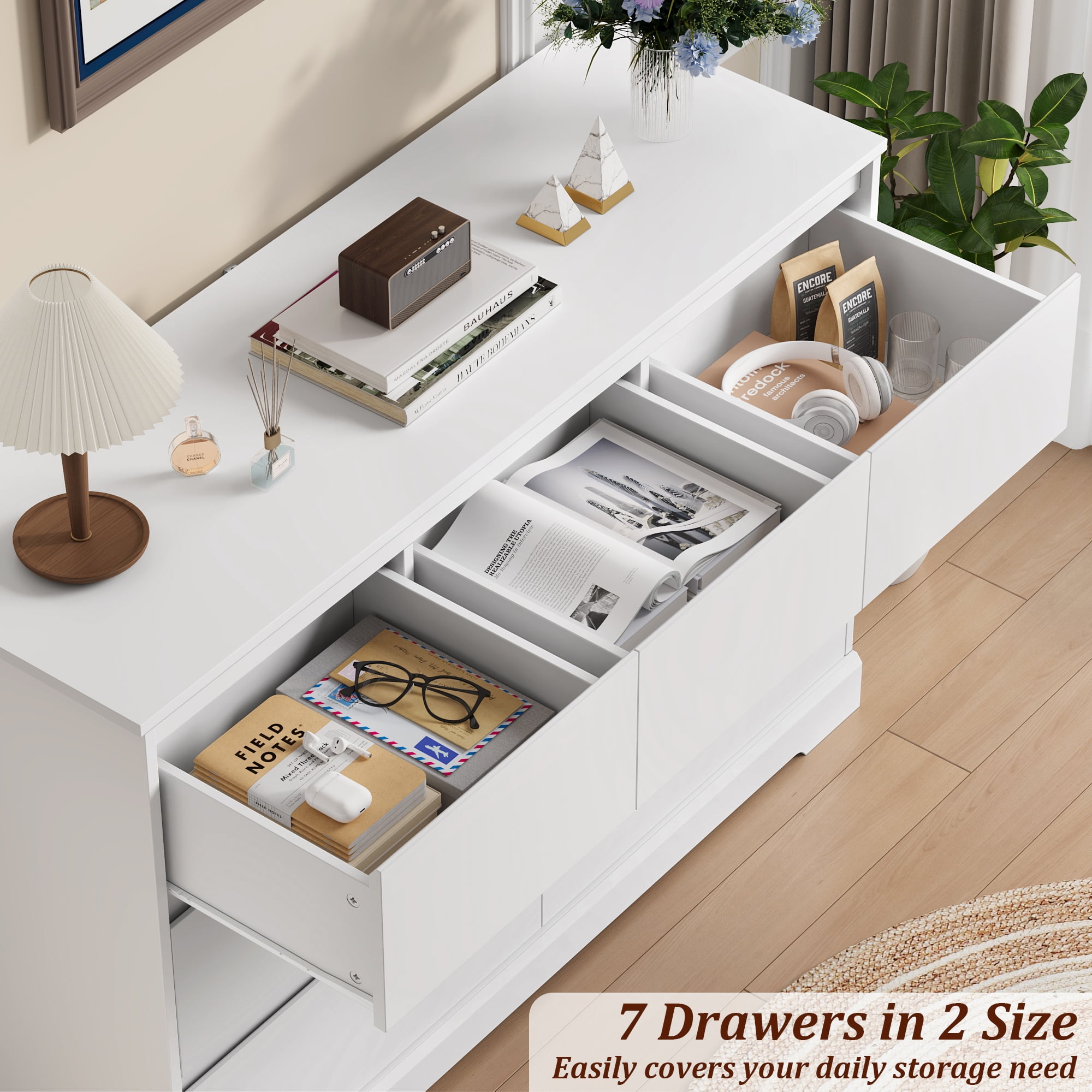 Homfa 7 Drawer Double Dresser: 7 Drawers in 2 Different Sizes – 7 drawers in different sizes and wide top surface of this white dresser for bedroom provide as much storage space as possible, clearly categorize different items such as toys, books, etc. to meet multiple storage needs. Contemporary White Dresser Appearance – Pure white dresser appearance bringing the ultimate minimalist style can be adapted to a variety of decorations. Simple Hidden Handles – Hidden handle-less chute drawers make our 7 drawer chest dresser more simple, focusing on practicality while creating a minimalist style home. Sturdy Structure + Anti-Falling Device=More Safety – Scientific assembly design and carefully selected wood ensure the stability and durability of this chest of drawers. 1 Anti-tip device prevents the wood dresser from tipping over! Protect your family. Durable & Easy-to-Clean – This 7 drawer dresser is made of high quality material, easy to daily clean and durable, the surface is finely crafted, dust and scratch resistant. Easy Assembly – Everything needed for assembly comes collected in a package sent to you. The 7 drawer white dresser could be easily assembled in less than 1 hour by 2 adults with the instructions. 24/7 Customer Service – We provide quality customer support, if you have any questions with this dresser, please email us and we will reply within 24 hours. Specifications: Material: MDF Wood + Metal Color: White Overall Size: 32.3” H x 47.2” W x 15.7” D Overall Product Weight: 135 lb. Number of Drawers: 7 Assembly Required: Yes Package Including: 1 x 7 Drawer Double Drawer 1 x Accessory Kit 1 x Instructions