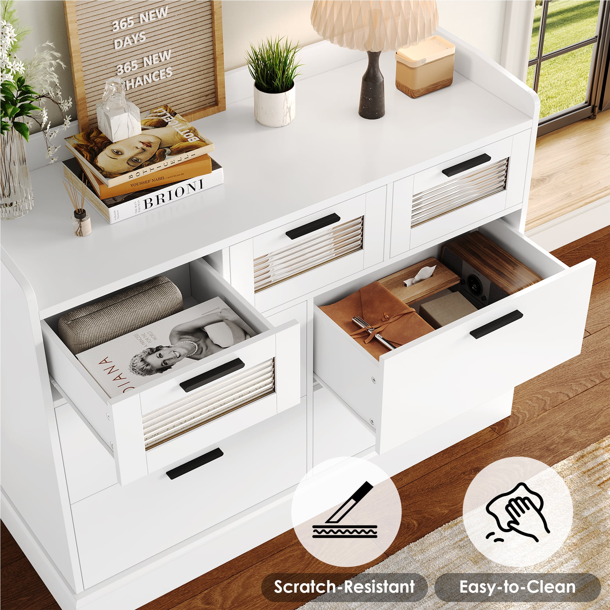 Homfa – Create a comfortable life! This Homfa 7 Drawer White Dresser is made of high quality high density MDF board, doing great in durability, of which the white dresser surface is convenient to daily clean! The fresh looking combination of white dresser body and glass drawer, no matter what kind of decor style, with its participation, the beauty and charm are only increased, definitely suitable for you with extraordinary taste, as a nice storage dresser! The right 31.5 inch chest of dressers height makes it easy to reach your items. Cabinet top with barrier will provide your collections a more safe display stage. The combination of 7 drawers chest in 3 different sizes will provide you with exactly enough space and freedom to place a wide variety of items. Smooth slides plus easy-to-pull gold metal handles, this white chest of drawers can be easily opened and closed even if filled with items.