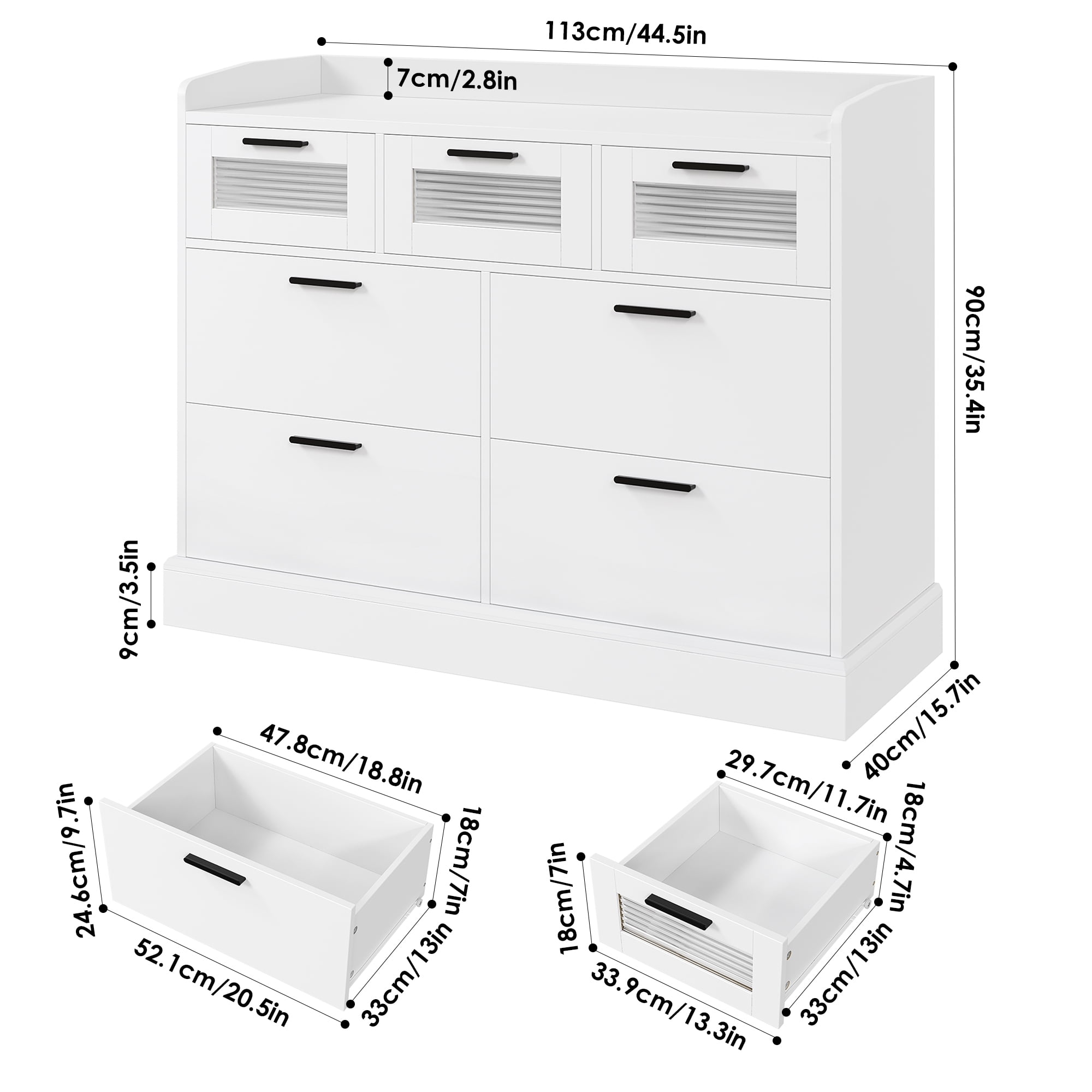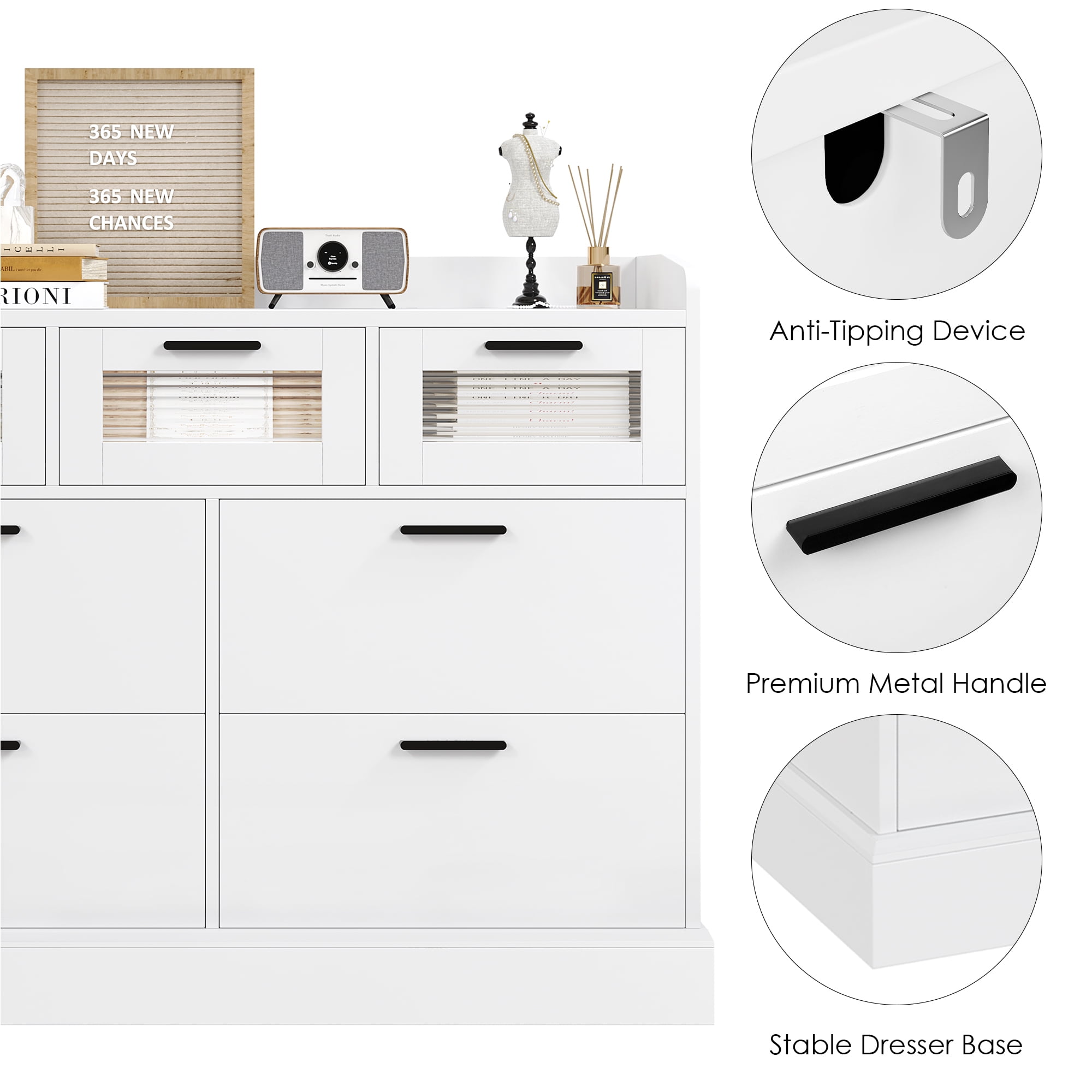 Features: 【Smart Space for Multiple Storage Needs】7 drawers in 3 sizes and a wide dresser top surface with a barrier provide not only safe but also as much storage space as possible for a wide range of storage needs. 【Multipurpose Dresser Cabinet with Simple Look】Simple appearance matches well with the decoration no matter where it is. This white 7 drawer dresser can not only keep your kitchen utensils, but also play the role of your perfect storage assistant in your Bedroom living room, dining room and other places, saving your valuable space. 【Shinning Elegant Glass Drawer Panel】Decorating modern bedroom, meanwhile adding more vivid sense, this homfa 7 drawer dresser will be a nice choice. 【Sturdy Structure + Anti-Falling Device=More Safety】The steady construction of this 7 drawers white dresser consists of scientific assembled design and carefully picked wood. More importantly, this homfa wood dresser includes 1 anti-falling device to prevent the cabinet from falling over! 【Durable & Easy-to-Clean】Consisting of material of high quality, this Homfa 7 drawer dresser will do good job in long lasting, while the surface is convenient to your daily clean, such a sweet storage cabinet. 【Easy Assembly】Everything needed for assembly comes collected in a package sent to you. The 7 drawer dresser could be easily assembled in less than an hour by 2 people with the instructions. 【Easy Assembly & 24/7 Customer Service】We provide quality customer support, if you have any questions, please email us and we will reply within 24 hours. Specifications: Material: MDF Wood Color: White Overall Size: 44.5″L x 15.7″W x 35.4″H Overall Product Weight: 128 lb Number of Drawers: 7 Package Contents: 1 x 7 Drawer Dresser 1 x Accessory Kit 1 x Instructions Manual