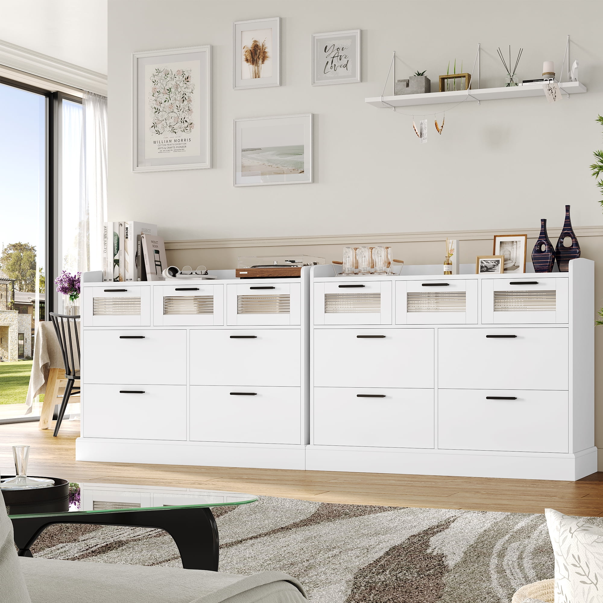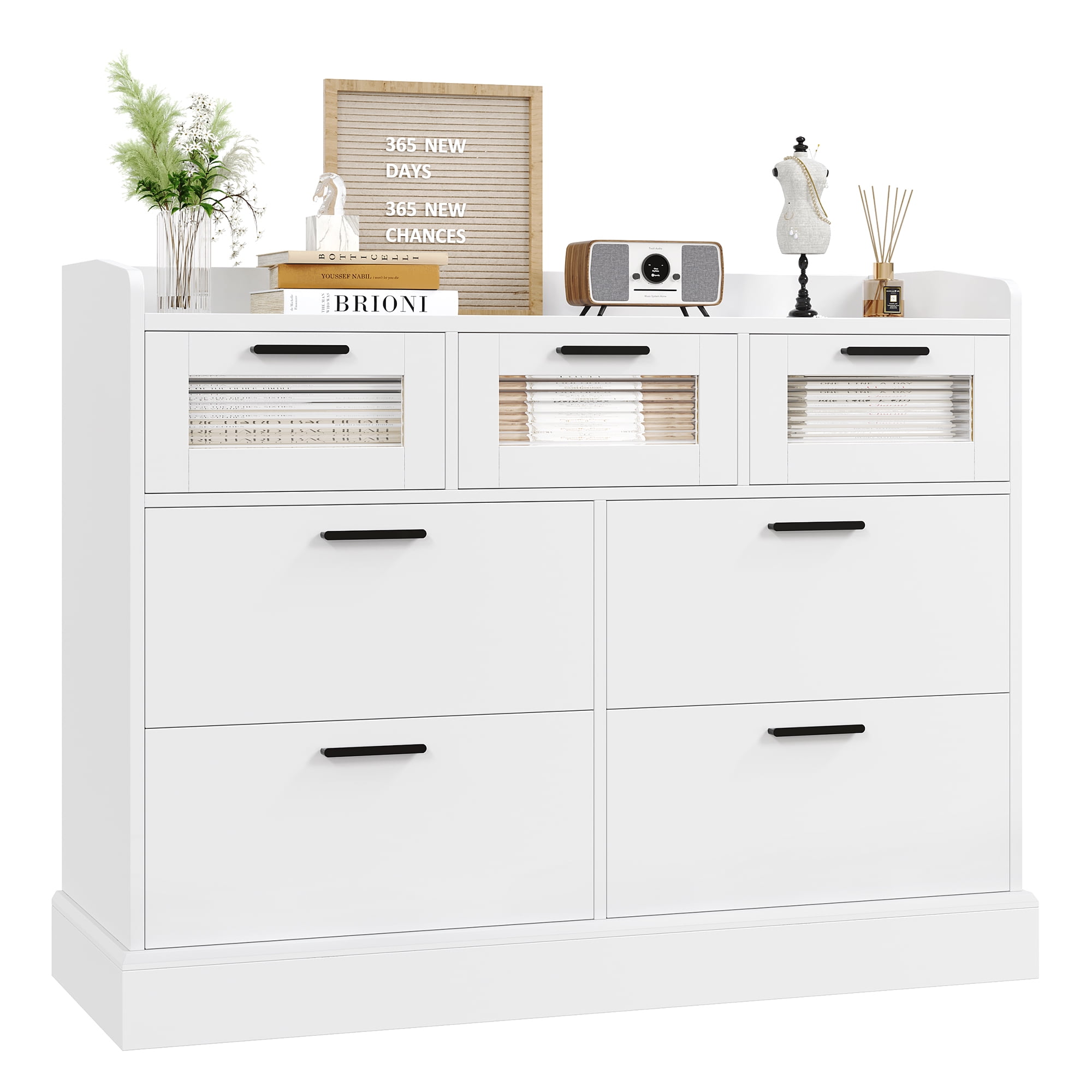 Homfa 7 Drawer White Dresser for Bedroom, Glass Panel Wood Storage Cabinet for Living Room Dining Room