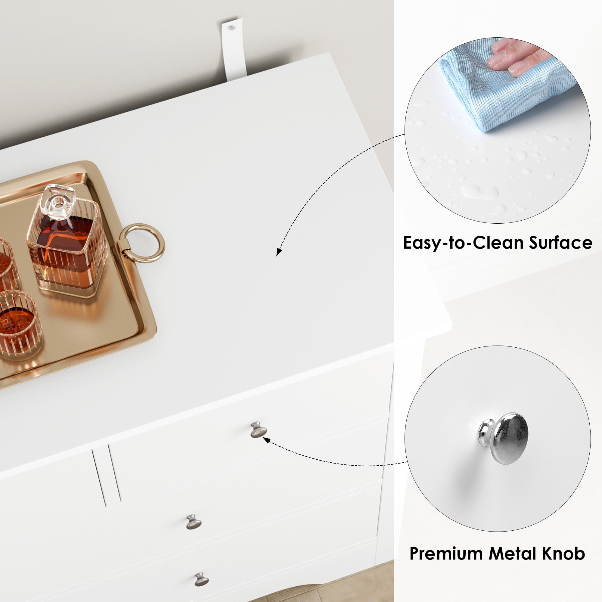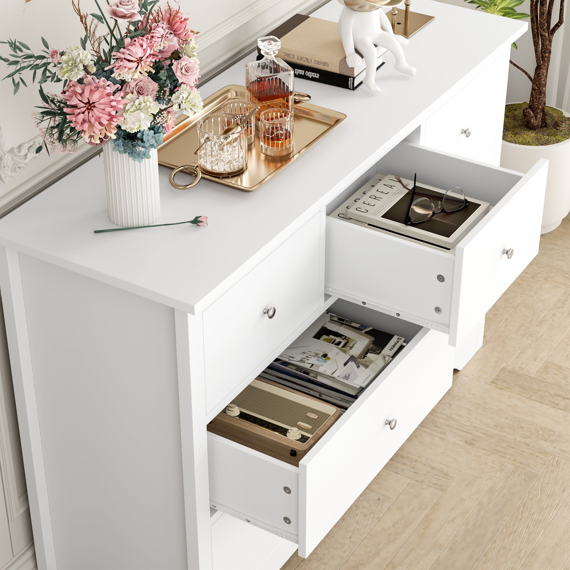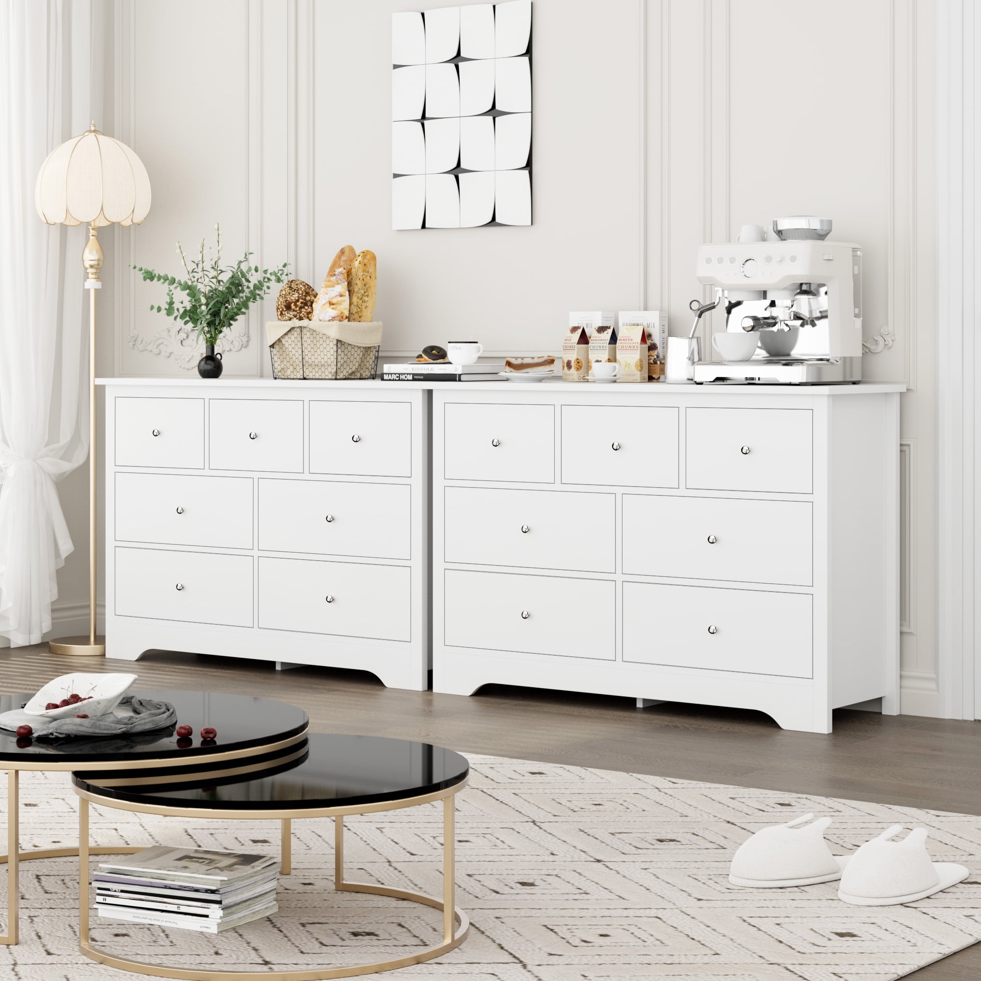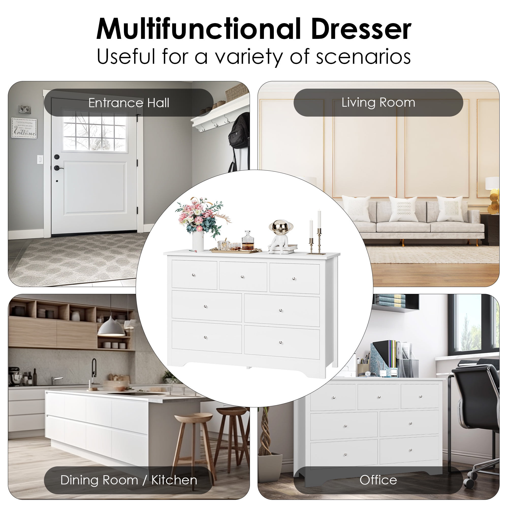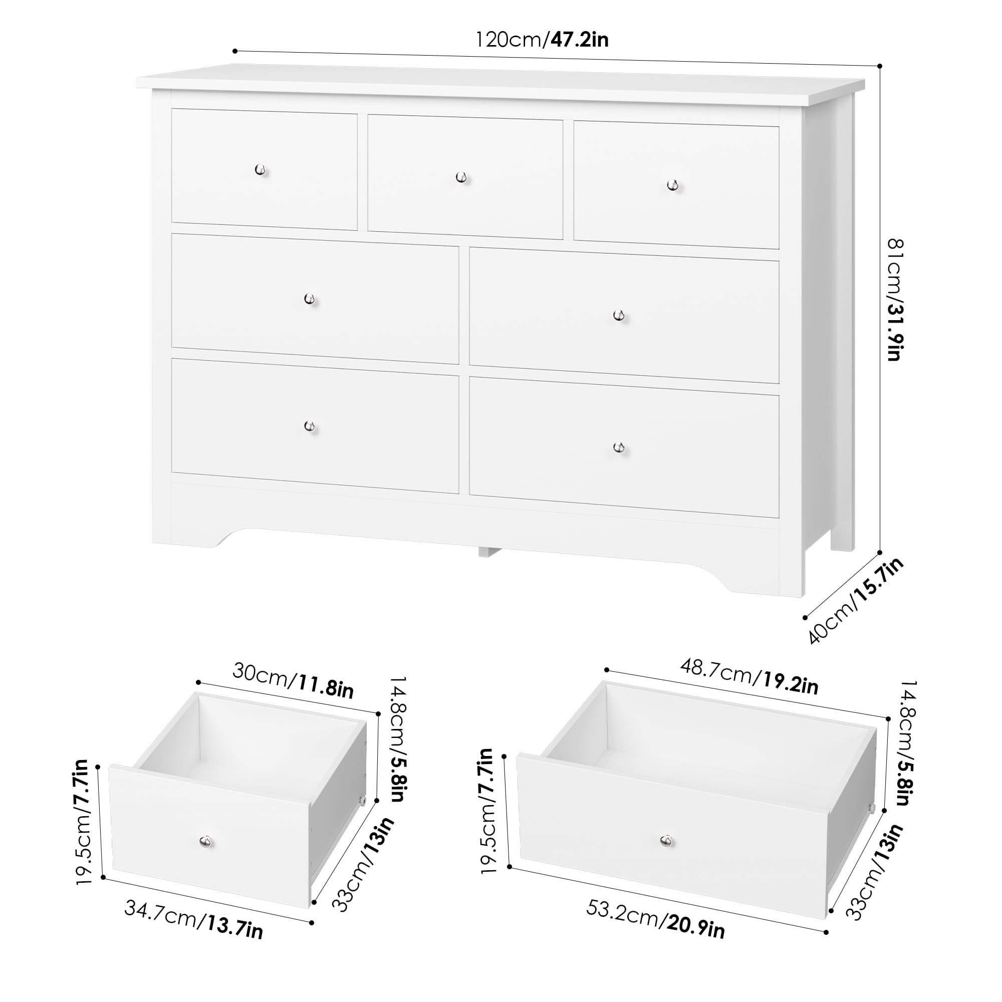Features: 【Ample Space for Multiple Storage Needs】7 drawers in 2 sizes and a wide cabinet top surface of this drawer dresser provide as much storage space as possible for a wide range of storage needs. 【More than A Dresser】This chest of drawers can not only keep your kitchen utensils in your dining room, but also play the role of your perfect storage assistant as a bedroom dresser, or in living room, office and other places, updating your valuable space. 【Modern White Style Appearance】Simple appearance of this dresser matches well with the decoration style no matter where it is. Exquisite silver metal knobs also polish your atomosphere more elegantly. 【Sturdy Structure + Anti-Falling Device=More Safety】The steady construction of this white dresser consists of scientific assembled design and carefully picked wood. More importantly, this homfa wood storage cabinet includes 1 anti-falling device to prevent the cabinet from falling over! Protect your kids or families. 【Durable & Easy-to-Clean】Consisting of material of high quality, this 7 drawer dresser is easy to have daily clean and long lasting, while the surface is well done for dust and scratch resistance. 【24/7 Customer Service】We provide quality customer support, if you have any questions, please email us and we will reply within 24 hours. Specifications: Material: MDF Wood + Metal Color: White Overall Size: 47.2″L x 15.7″W x 31.9″H Drawer Size 1: 19.2″L x 13″W x 5.8″D Drawer Size 2: 11.8″L x 13″W x 5.8″D Overall Product Weight: 114 lb. Number of Drawers: 7 Assembly Required: Yes Package Contents: 1 x 7 Drawer Dresser 1 x Accessory Kit 1 x Instructions