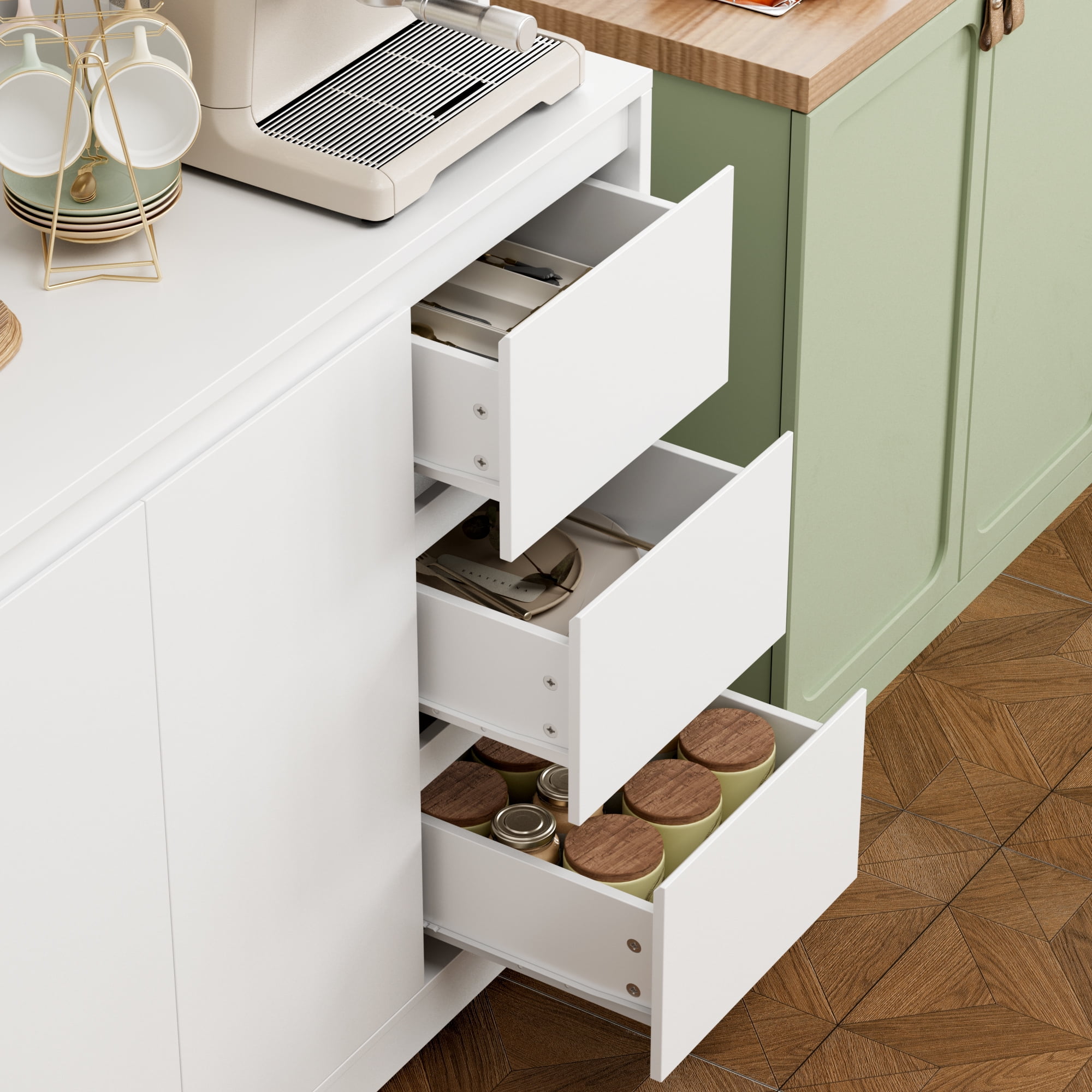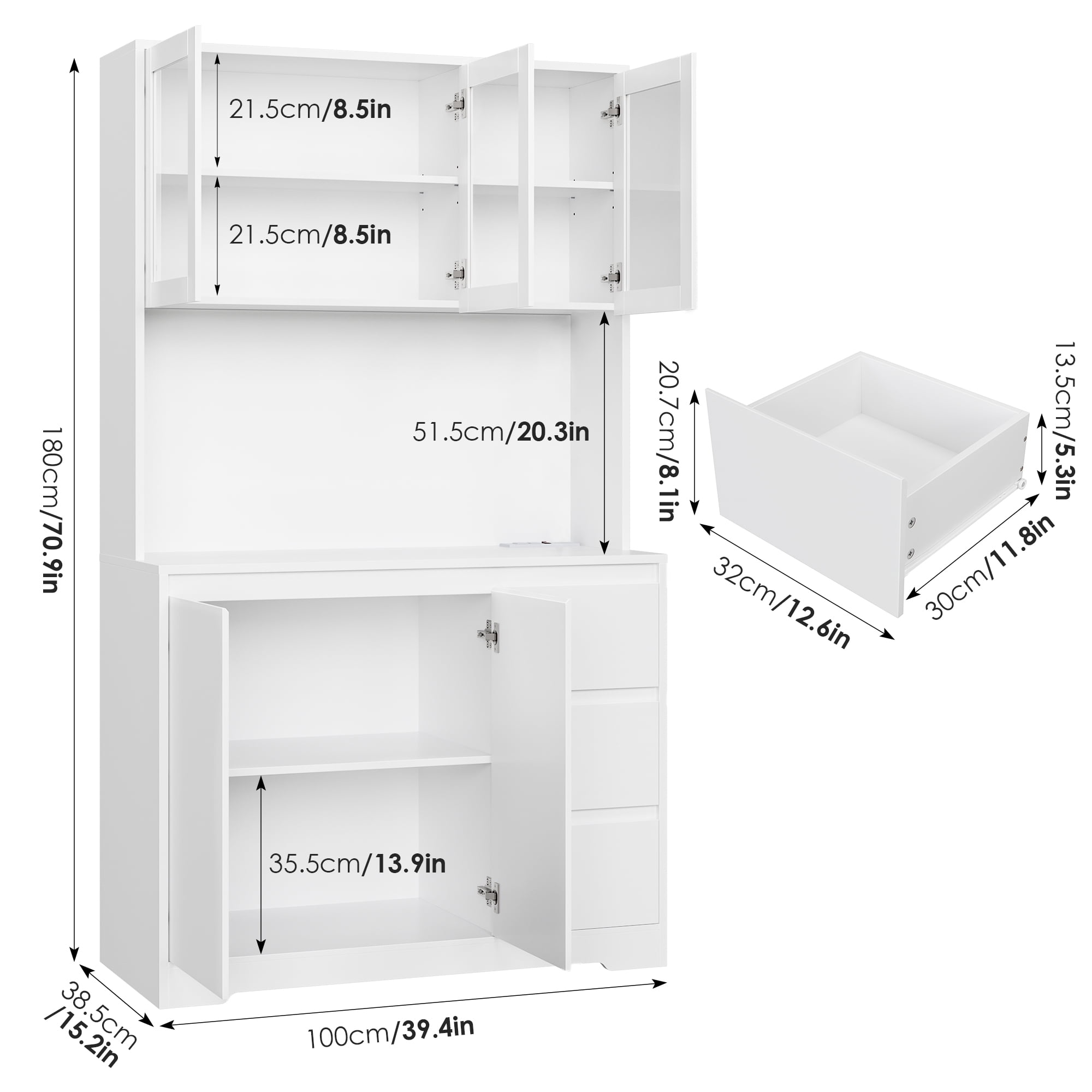 Features: 【LED Pantry Cabinet 】This pantry storage cabinet with yellow LED light not only is convenient for you to prepare food or taking tableware at night, but also creates a warmer atmosphere for your home. 【Standard Power Outlet】Homfa kitchen pantry is equipped with the power outlet including the USB port for LED light, which abandons the traditional wire hole and is very convenient for your small appliances. 【 Ample Storage Space 】This white pantry cabinet has a spacious countertop, 3 drawers and 6 shelves, providing the large abundant storage space for your kitchen and dinning room. 【 Easy to Clean】Featuring the smooth surface, the storage pantry cabinet is waterproof and easy to clean, which can easily maintain and serve you for years. 【 Modern Style 】Smooth white finishes and sleek lines create an elegant modern kitchen cabinet. The handleless design makes it more personal. And 3 glass doors not only looks distinctive, but also clearly displays the items in the cabinet, which is easy to access. 【 Sturdy & Durable 】The buffet cabinet with drawers is selected the high quality and sturdy wood, featuring a excellent stability and sturdiness. The curved thick base not only prevents the cabinet from being moisture, but also ensures its stability. 【Adjustable Shelves】You can adjust the heights of the shelves of the glass doors cabinets up or down for your daily needs. 【 Anti-tipping Device 】With the anti-tipping device, the Homfa storage cabinet can fixed stably to the wall to prevent it from tipping over. 【Easy to Assemble】According to the detailed instructions, 2 adults can easily assemble the pantry cabinet with drawers. 【24/7 Customer Service 】We provide quality customer support, if you have any questions with Homfa pantry, please email us and we will reply within 24 hours. Specification Color: White Material:Particle board Overall Size: 70.9” H x 39.4” W x 15.2” D Drawers Size: 12.6”L x 11.8” W x 8.15”H Overall Product Weight: 129 lb. Number of Drawers: 3 Number of Doors: 5 Adjustable Shelves:Yes Tip over Restraint Device Included: Yes Assembly Required: Yes Package Contents: 1 x Pantry Cabinet 1 x Assembly Kit 1 x Instructions
