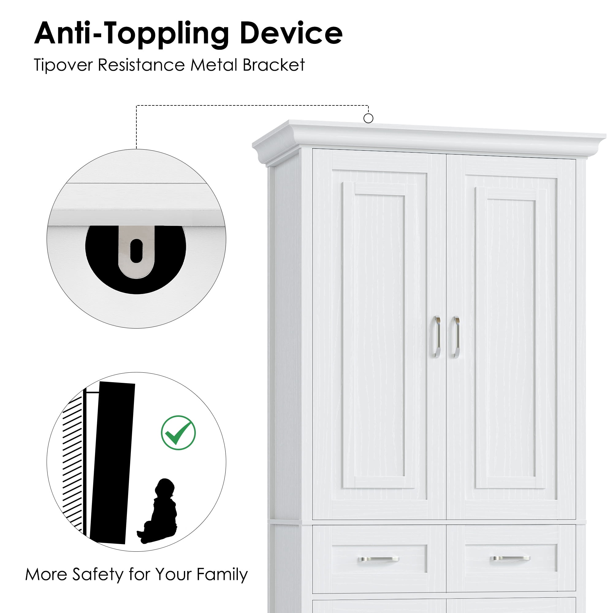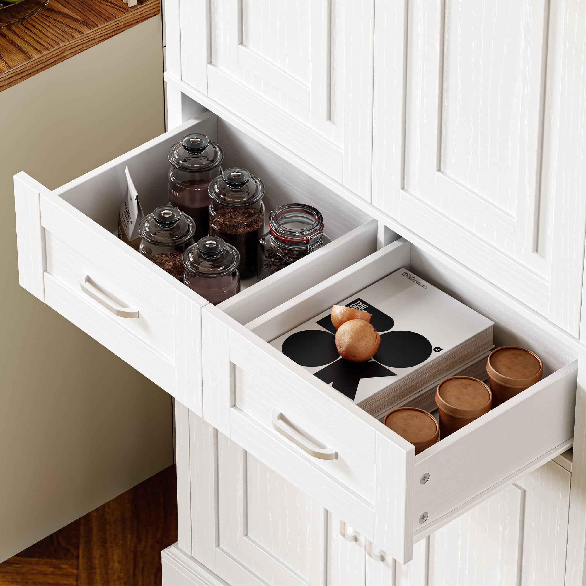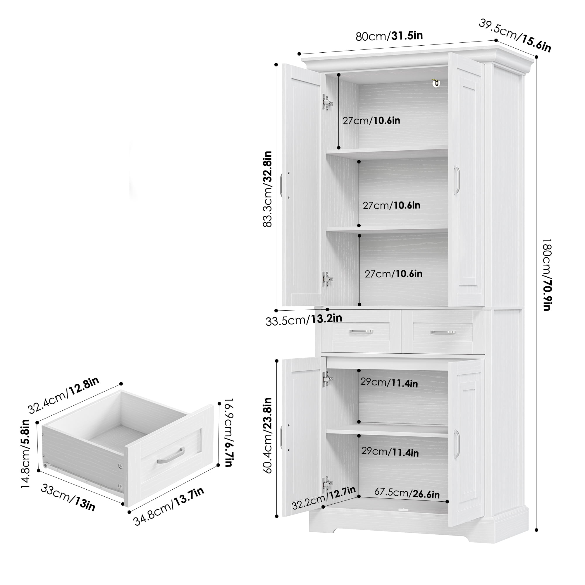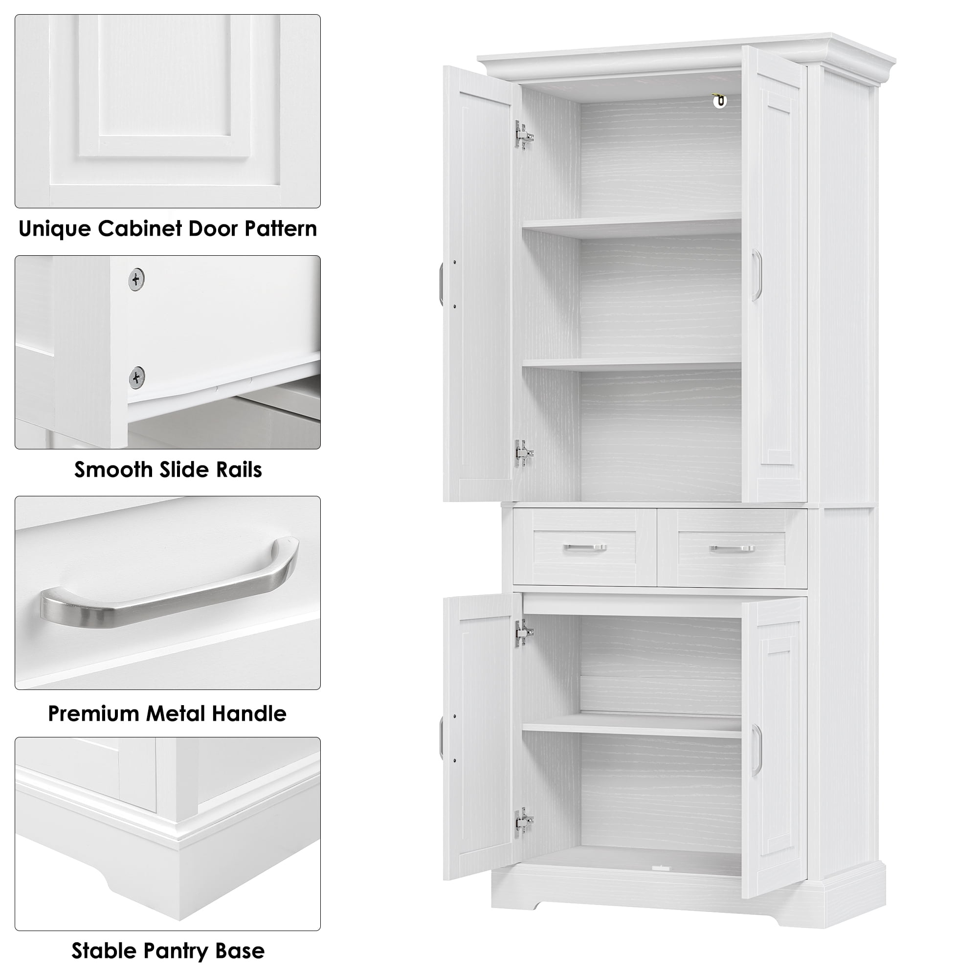 Features: 【Ample Space + Smart Storage Arrangement】With 5 tier interior shelves and 2 central storage drawers, this pantry storage cabinets will provide as much space as possible for a wide range of storage needs. 【Modern Style Cabinet Door】Pantry storage cabinet doors featuring modern style pattern brings a fresh and clean solution to your daily storage in an elegant way. 【Elegant Textured Wood Grain】Textured wood grain faintly shining on the white pantry finish, making this freestanding tall cabinet more elegant and unique. 【Multipurpose Cabinet】This white kitchen pantry cabinet in a moderate size can play your perfect storage assistant role in your kitchen, entryway, living room, dining room, office, etc. 【Anti-Toppling Device】Equipped with anti-toppling device, this pantry cabinets for kitchen storage will give you enough convenience and safety. 【Easy Assembly】Everything needed for assembly comes collected in a package sent to you. The Homfa kitchen pantry cabinet could be easily assembled in less than an hour by 2 people with the instructions. 【24/7 Customer Service】We provide quality customer support, if you have any questions, please email us and we will reply within 24 hours. Specifications: Material: MDF Wood & Metal Color: White Overall Size: 70.9” H X 31.5” W X 15.6” D Drawer Size: 12.8” L X 13” W X 5.8” D Overall Product Weight: 118 lb. Number of Shelf: 5 Number of Drawer: 2 Is Assembly Required: Yes Package Contents: 1 x Pantry Storage Cabinet 1 x Accessory Kit 1 x Instructions Manual