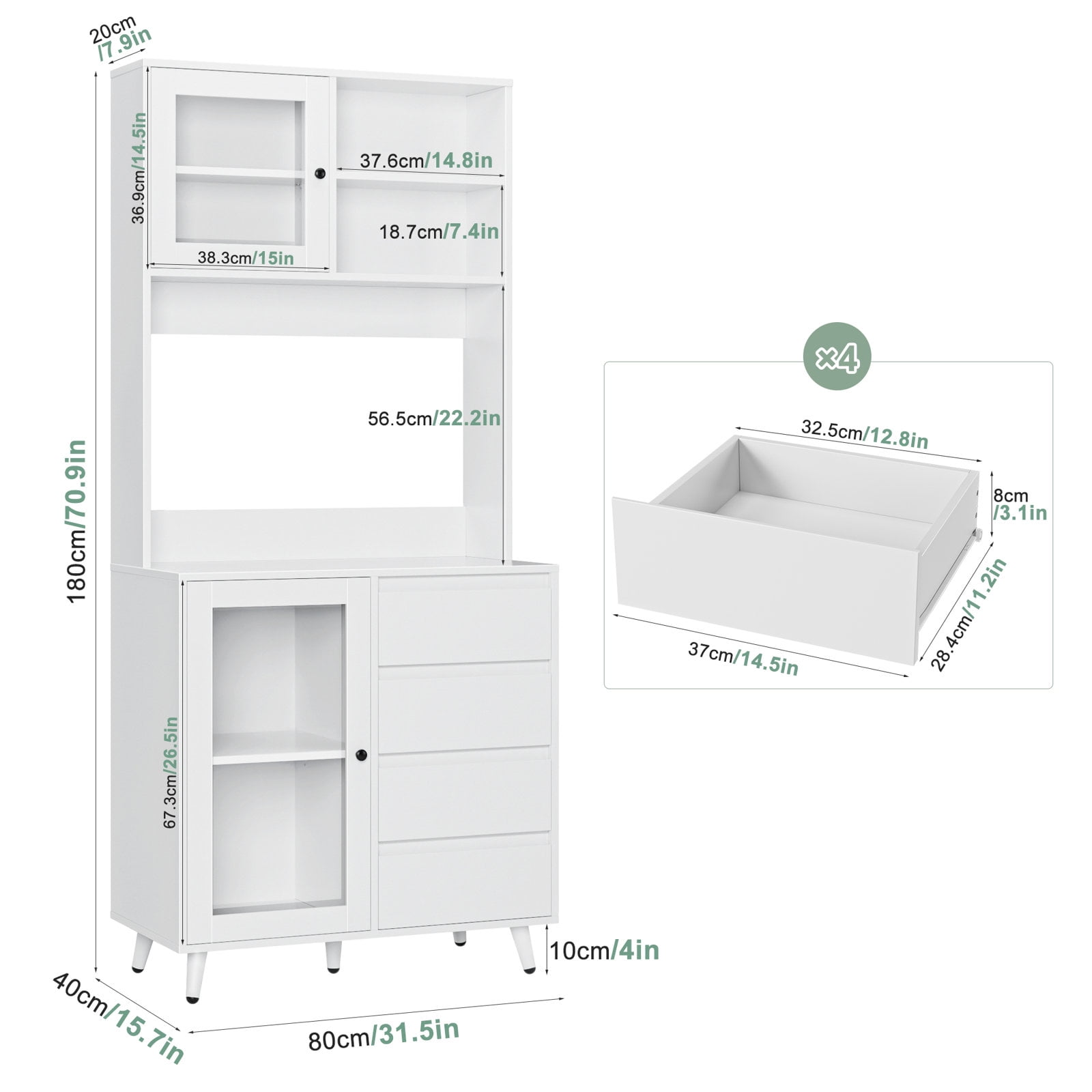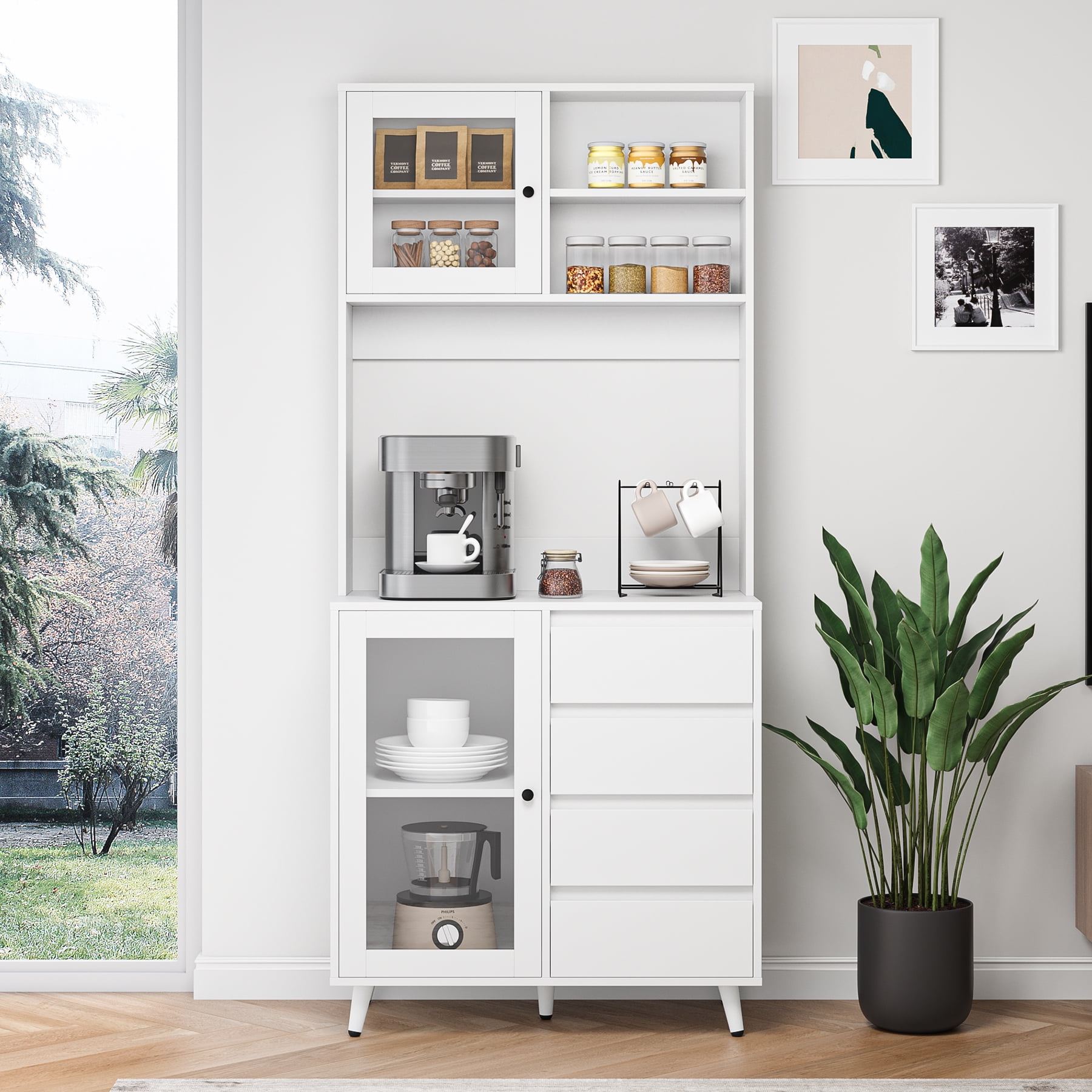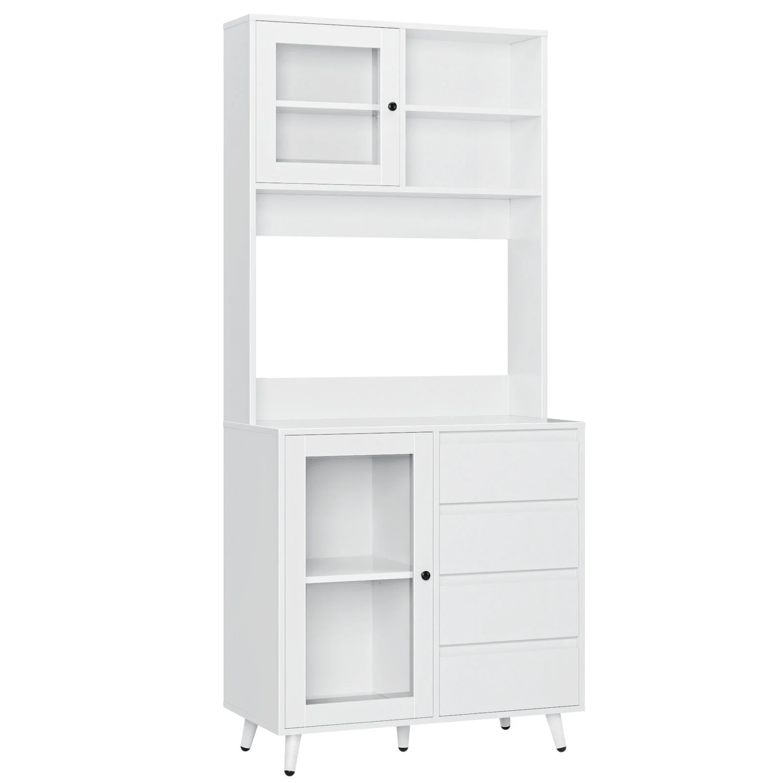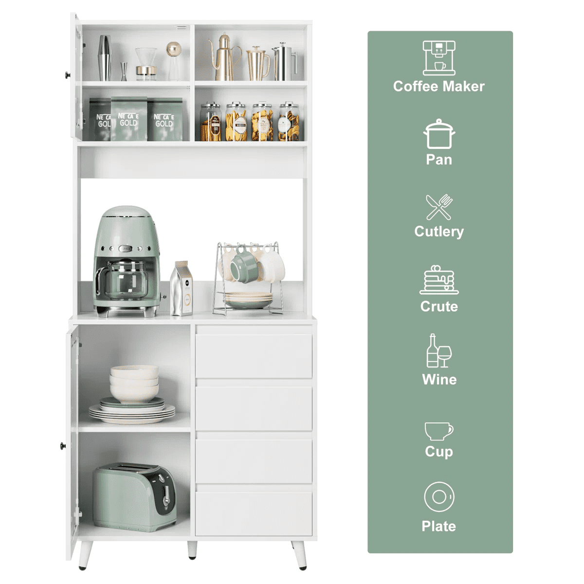 Features 【Multiple Storage Options】You’ll love this kitchen pantry cabinet. 1 open cabinet, 1 wide countertop, 2 closed cabinets with adjustable shelves, and 4 hidden drawers for all your kitchen essentials storage needs. 【Practical Kitchen Design】The microwave oven, coffee maker and toaster can be placed at will on the countertop, with the center back panel cutout for easy appliance insertion. The inner dividers inside the glass doors are all adjustable and can also be taken out according to actual needs, DIY cabinet space. 【Stylish Food Pantry】With its white finish and clear lines, this tall kitchen buffet hutch cabinet can be the perfect centerpiece for any kitchen that needs functional storage and extra counter space for small to medium sized kitchen appliances. 【Anti-tip Device】This microwave cabinet is equipped with an anti-tip device that makes the entire cabinet more stable in an upright position to protect your family’s safety. 【Easy Installation】It is very easy to assemble this buffet cabinet with detailed step-by-step assembly instructions and numbered accessories, and you can assemble this storage cabinet in 1 hour. 【24/7 Customer Service】We provide excellent customer support, if you have any questions, please email us and we will reply within 24 hours. 【Warm Note】If you receive the package without assembly instruction, please contact customer service once time. Thanks! Specifications: Material:Manufactured Wood Color: White Overall Size:70.9” H X 31.5” W X 15.7” D Drawer Interior:3.1” H X 12.8” W X 11.2” D Overall Product Weight:95.46 lb. Number of Shelves:6 Removable Shelves:2 Number of Drawers:4 Weight Capacity:330 lb. Package Contents: 1x Kitchen Pantry Cabinet 1x Accessory 1x Instruction
