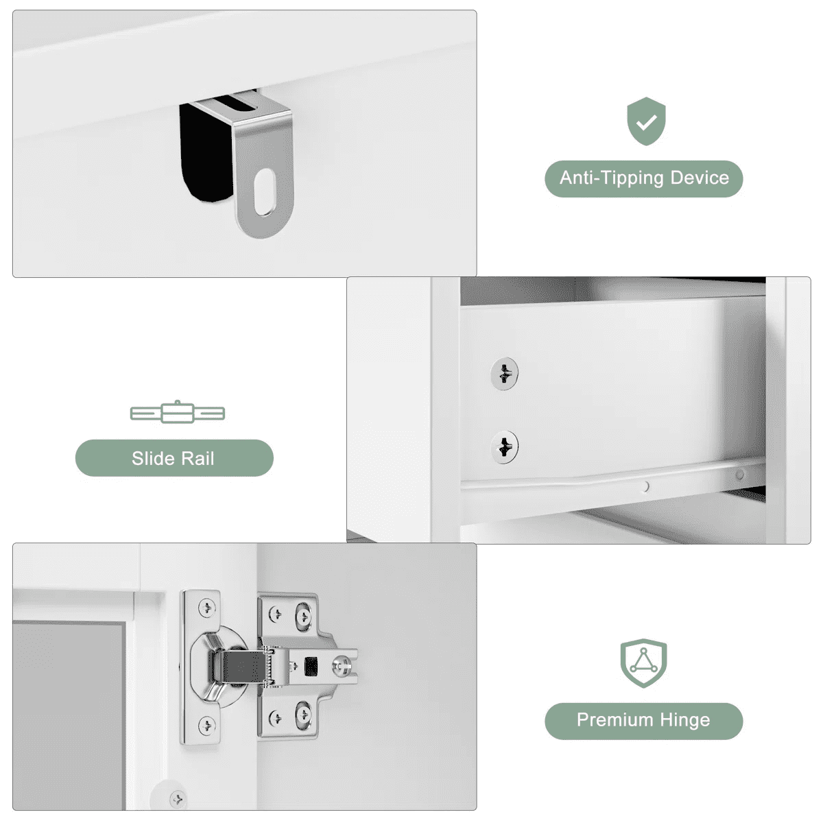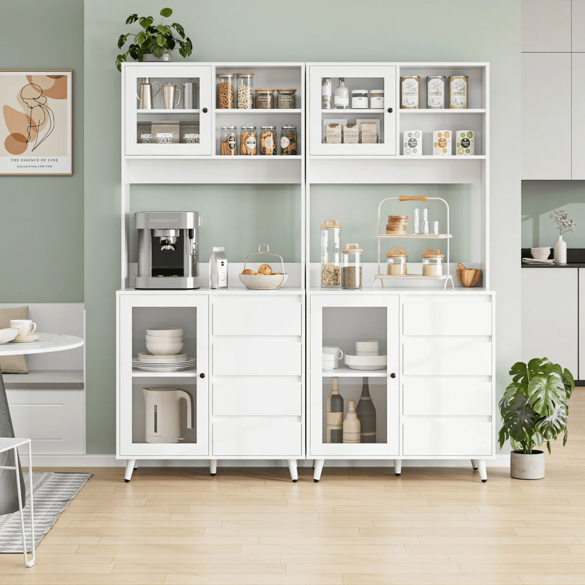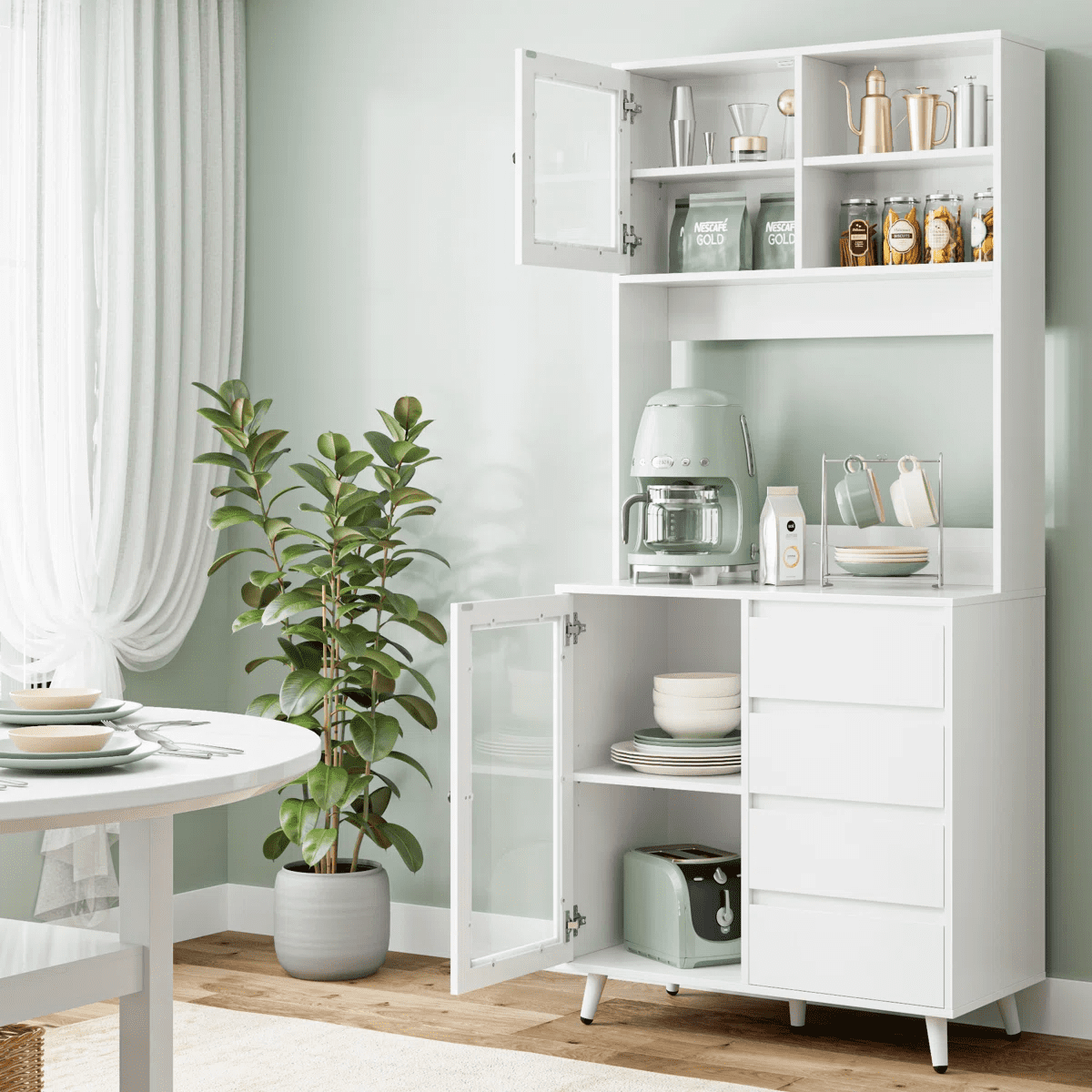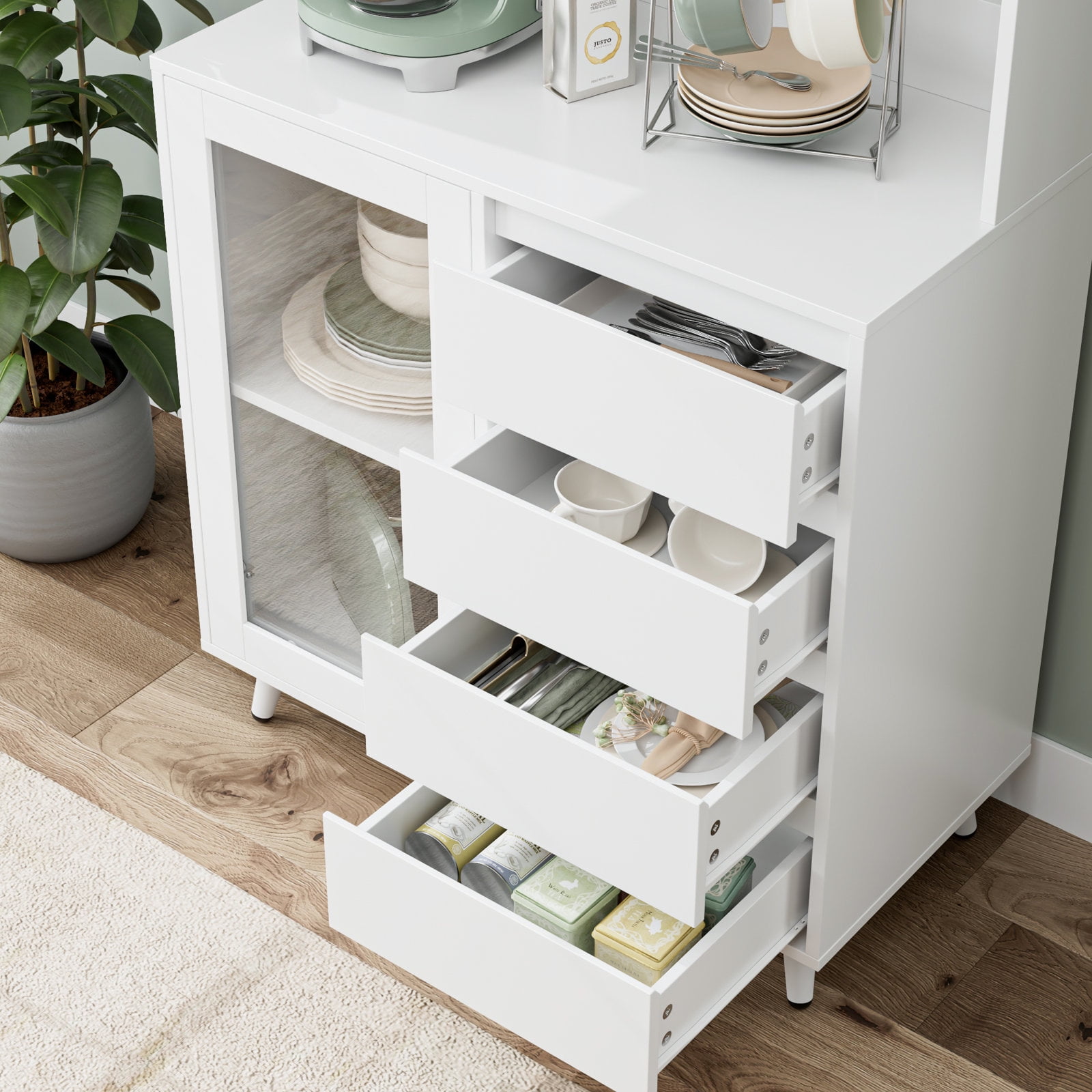Features 【Multiple Storage Options】You’ll love this kitchen pantry cabinet. 1 open cabinet, 1 wide countertop, 2 closed cabinets with adjustable shelves, and 4 hidden drawers for all your kitchen essentials storage needs. 【Practical Kitchen Design】The microwave oven, coffee maker and toaster can be placed at will on the countertop, with the center back panel cutout for easy appliance insertion. The inner dividers inside the glass doors are all adjustable and can also be taken out according to actual needs, DIY cabinet space. 【Stylish Food Pantry】With its white finish and clear lines, this tall kitchen buffet hutch cabinet can be the perfect centerpiece for any kitchen that needs functional storage and extra counter space for small to medium sized kitchen appliances. 【Anti-tip Device】This microwave cabinet is equipped with an anti-tip device that makes the entire cabinet more stable in an upright position to protect your family’s safety. 【Easy Installation】It is very easy to assemble this buffet cabinet with detailed step-by-step assembly instructions and numbered accessories, and you can assemble this storage cabinet in 1 hour. 【24/7 Customer Service】We provide excellent customer support, if you have any questions, please email us and we will reply within 24 hours. 【Warm Note】If you receive the package without assembly instruction, please contact customer service once time. Thanks! Specifications: Material:Manufactured Wood Color: White Overall Size:70.9” H X 31.5” W X 15.7” D Drawer Interior:3.1” H X 12.8” W X 11.2” D Overall Product Weight:95.46 lb. Number of Shelves:6 Removable Shelves:2 Number of Drawers:4 Weight Capacity:330 lb. Package Contents: 1x Kitchen Pantry Cabinet 1x Accessory 1x Instruction