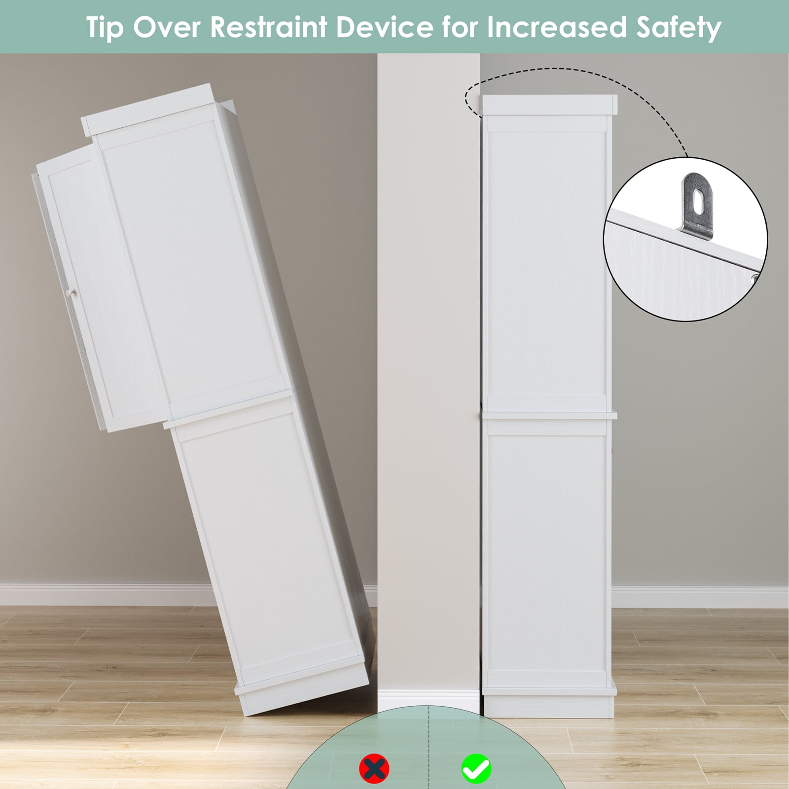 Features: 【Extra Storage Space Provider】Homfa tall kitchen storage pantry cabinet (Size: 72.4” H x 30.1” W x 15.7” D) with 5 interior compartments and 1 large capacity storage drawer provides ample storage space. 【Modern Farmhouse Pantry Style】Elegant white pantry storage cabinet style, decorated with slightly textured surface, this homfa white pantry storage cabinet could easily help your room more delicate. 【Anti-Toppling Device & Fixed Interior】Anti-toppling device is suitable for preventing this tall storage cabinet with doors from topping in the process of using, creating a safe environment for your family. Arranged with 5 fixed interior shelf space, adding more safe and stable feature, even could be a nice kitchen pantry. 【Sturdy & Durable】High quality material and reliable craft details give this white pantry storage cabinet double guarantee, durable, stable. 【Multi-Occasion Use】Simple pantry look and practical space design, this homfa white pantry storage cabinet is suitable for various home decorations such as living room, study, bedroom, kitchen and hallway. 【Easy to Assemble】With the help of all mounting hardware and detailed instructions, 2 people can complete it easily in 1 hours. Quality customer service saves you from the worry of lost and damaged parts. 【24/7 Customer Service】We provide quality customer support, if you have any questions with this homfa kitchen pantry furniture, please email us and we will reply within 24 hours. Specification Color: White Overall Size: 72.4” H x 30.1” W x 15.7” D Overall Product Weight: 102.7 lb Weight Capacity: 200 lb Shelf Weight Capacity: 44.1 lb Base Material: Manufactured Wood, Iron Drawer Glide Material:Metal Number of Drawers: 1 Tip over Restraint Device Included: Yes Adjustable Interior Shelves: No Adult Assembly Required: Yes Packaging Includes: 1 x Pantry Storage Cabinet 1 x Accessory Kit 1 x Manuals