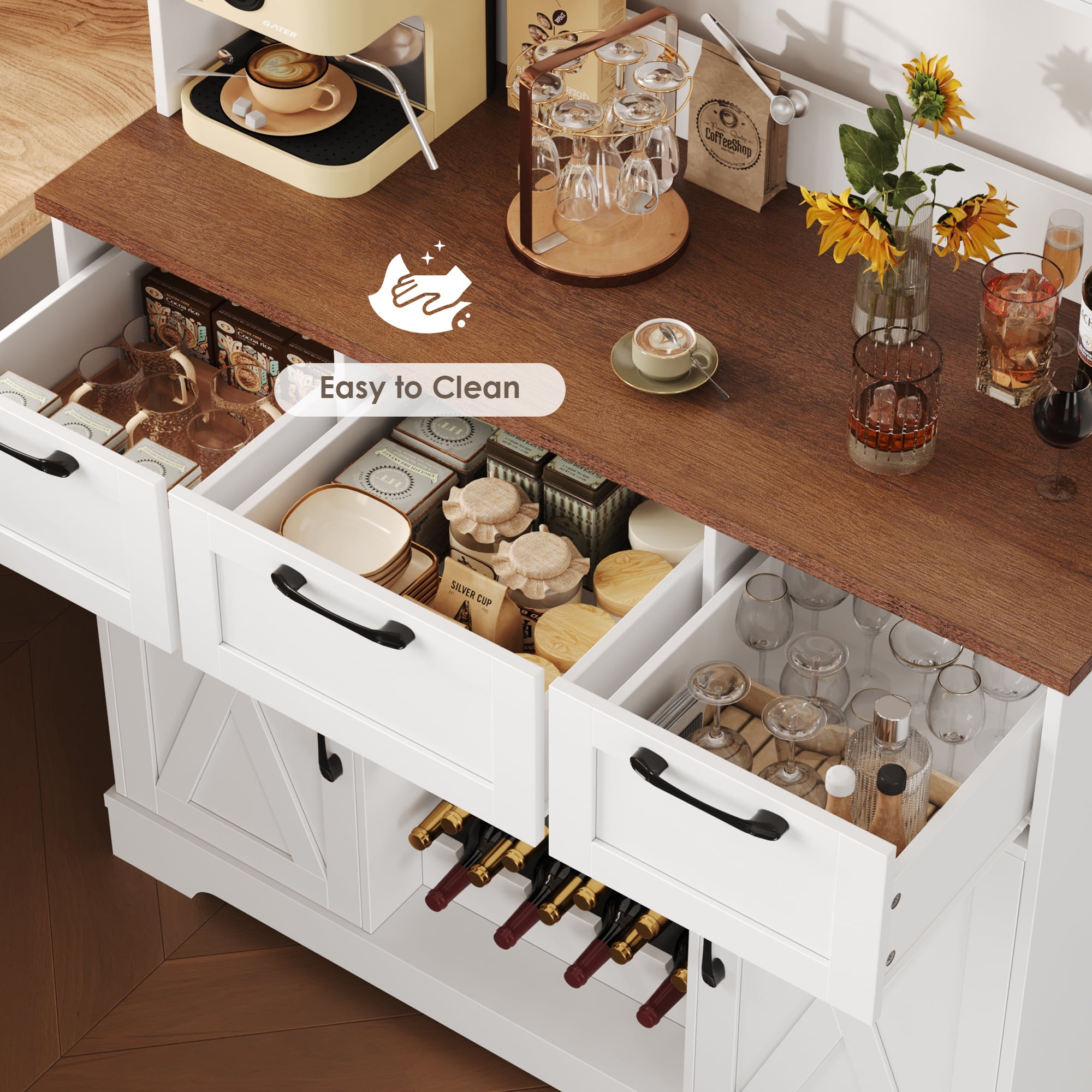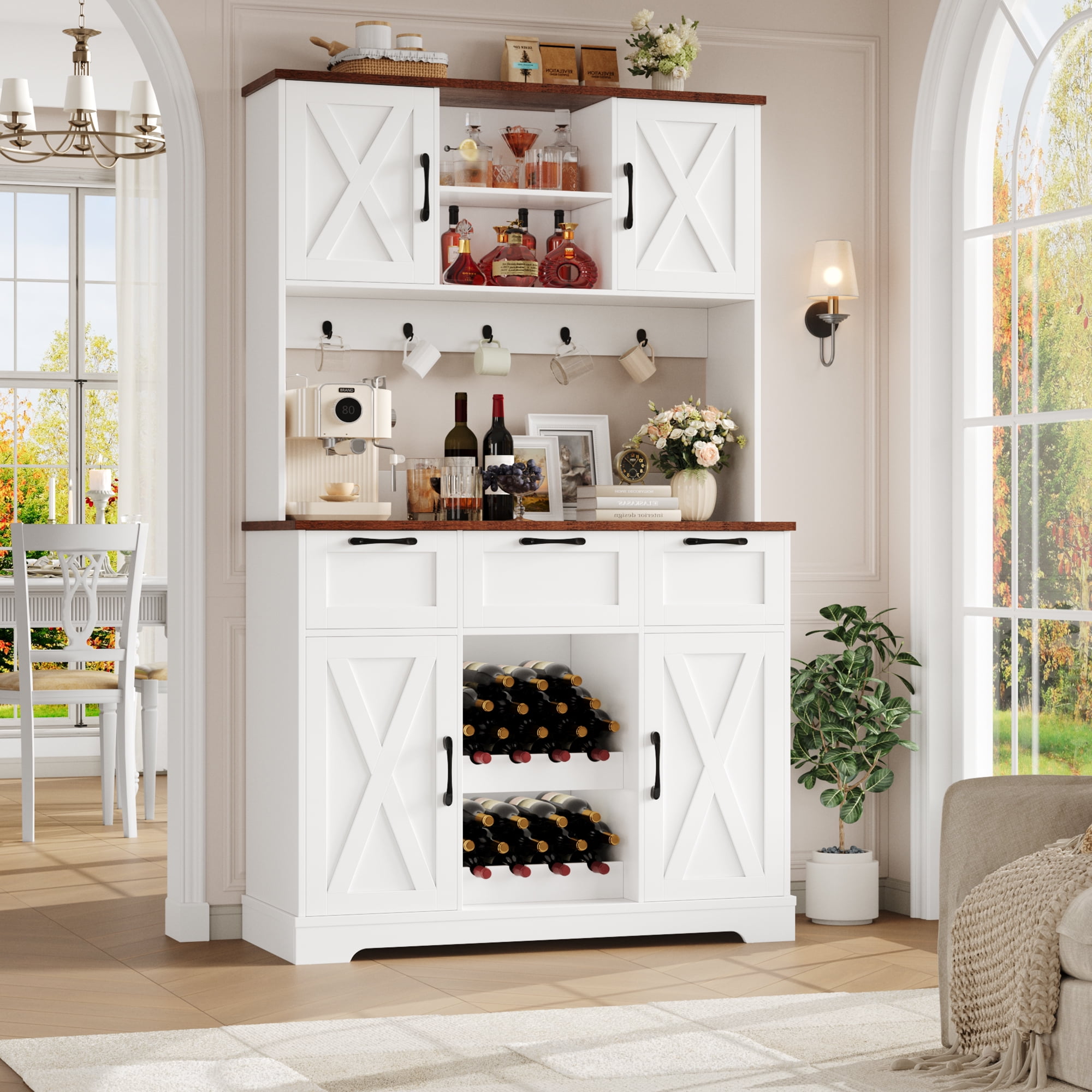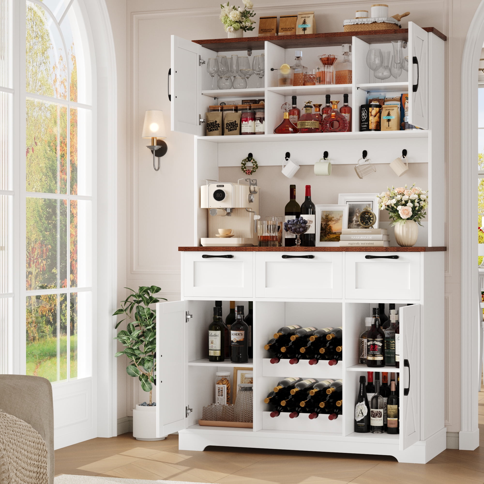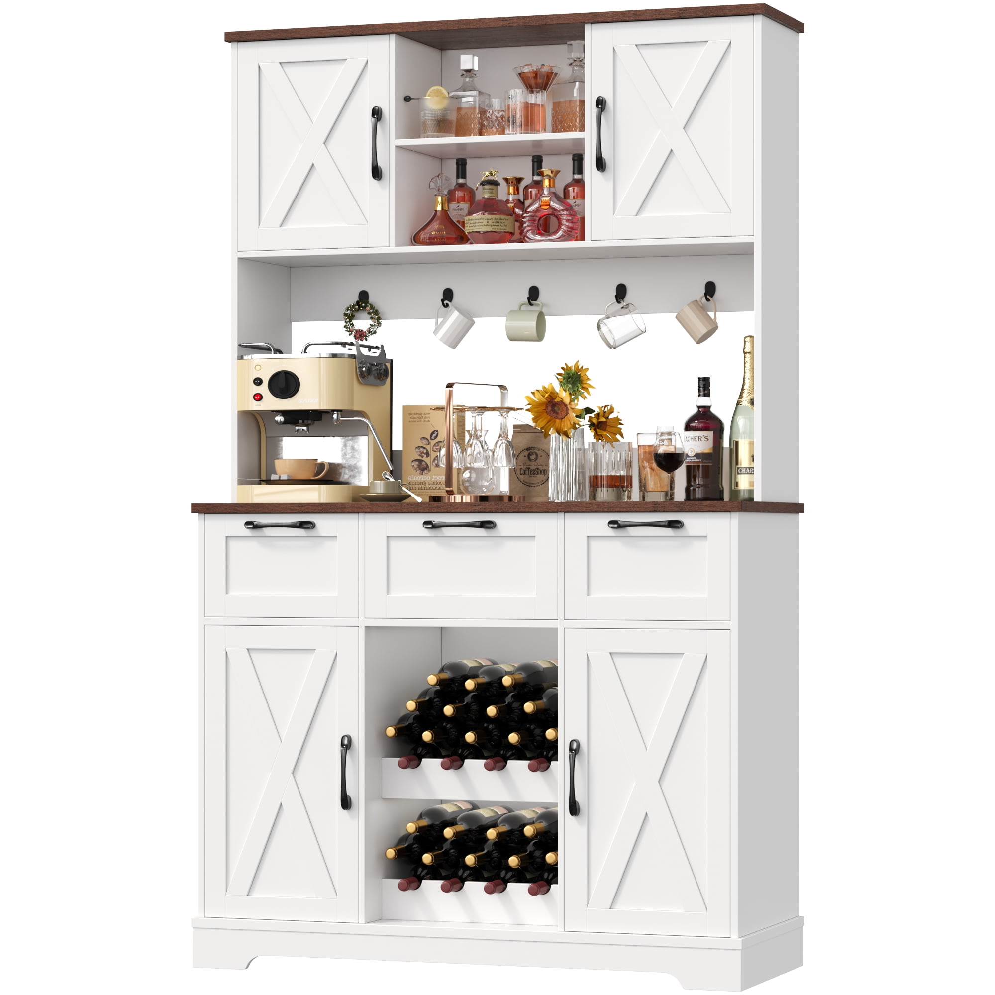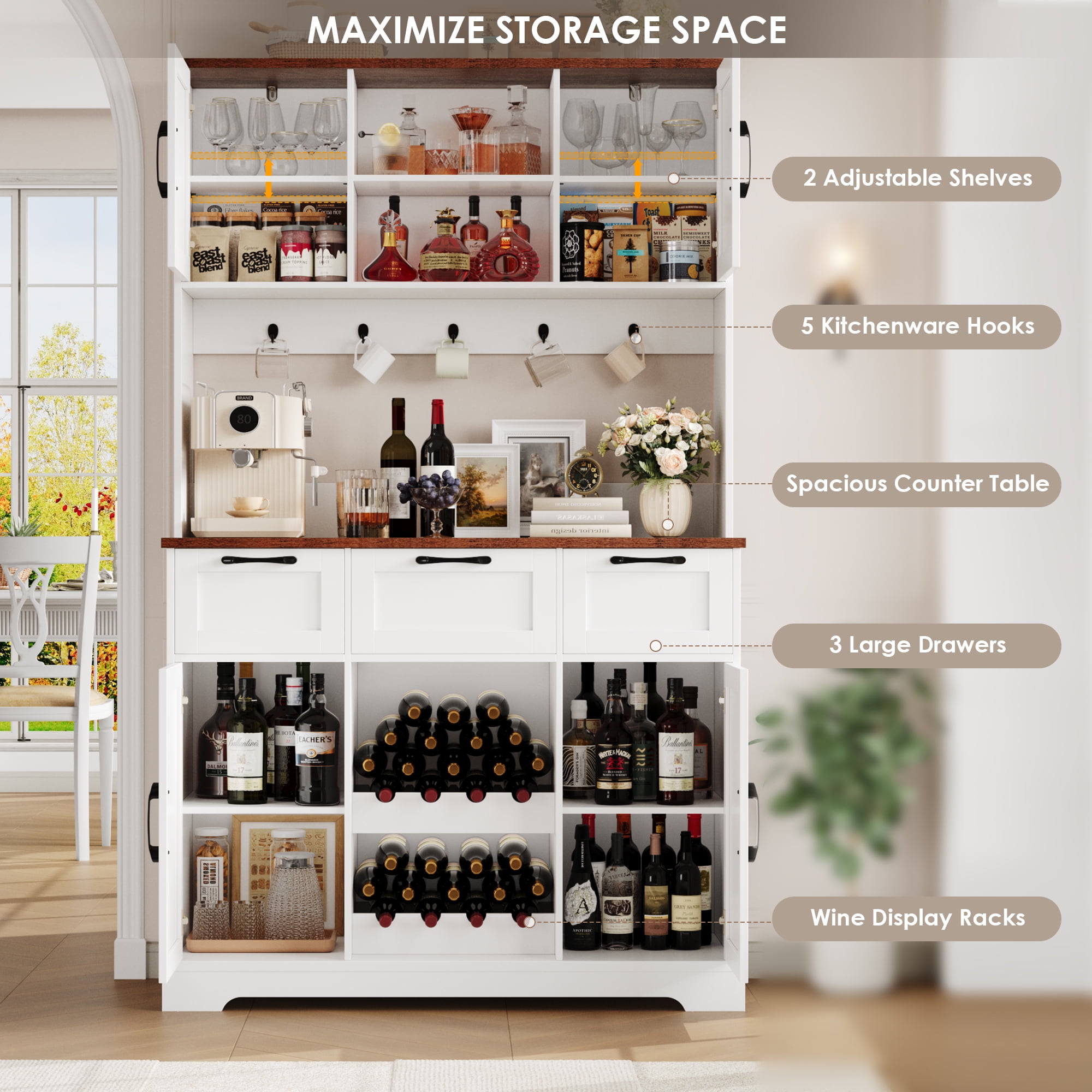 Homfa 71” Tall Wine Bar Cabinet with Storage Hutch & 3 Drawers, Farmhouse Coffee Bar Cabinet Wine Rack with Adjustable Shelves for Kitchen Dining Room, White