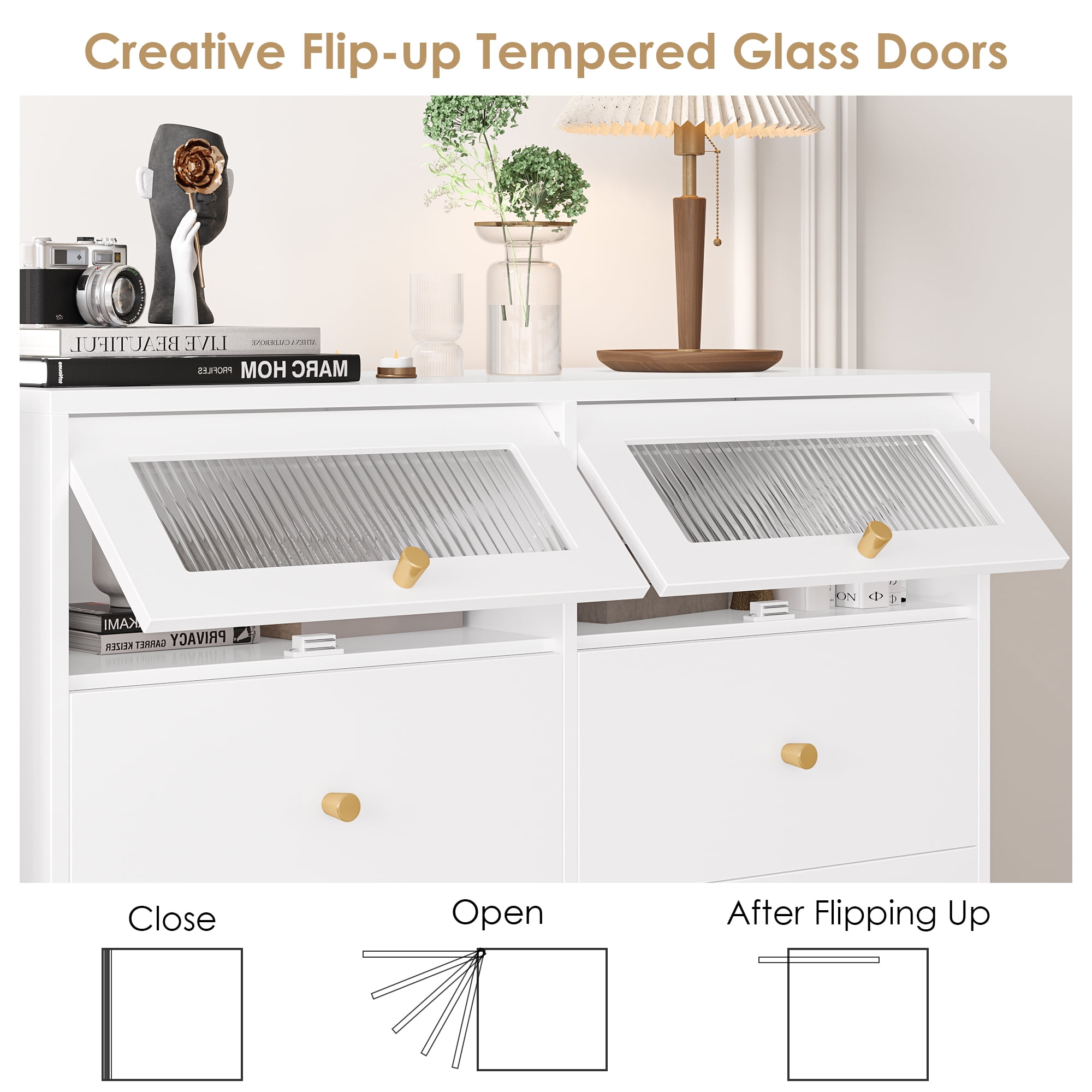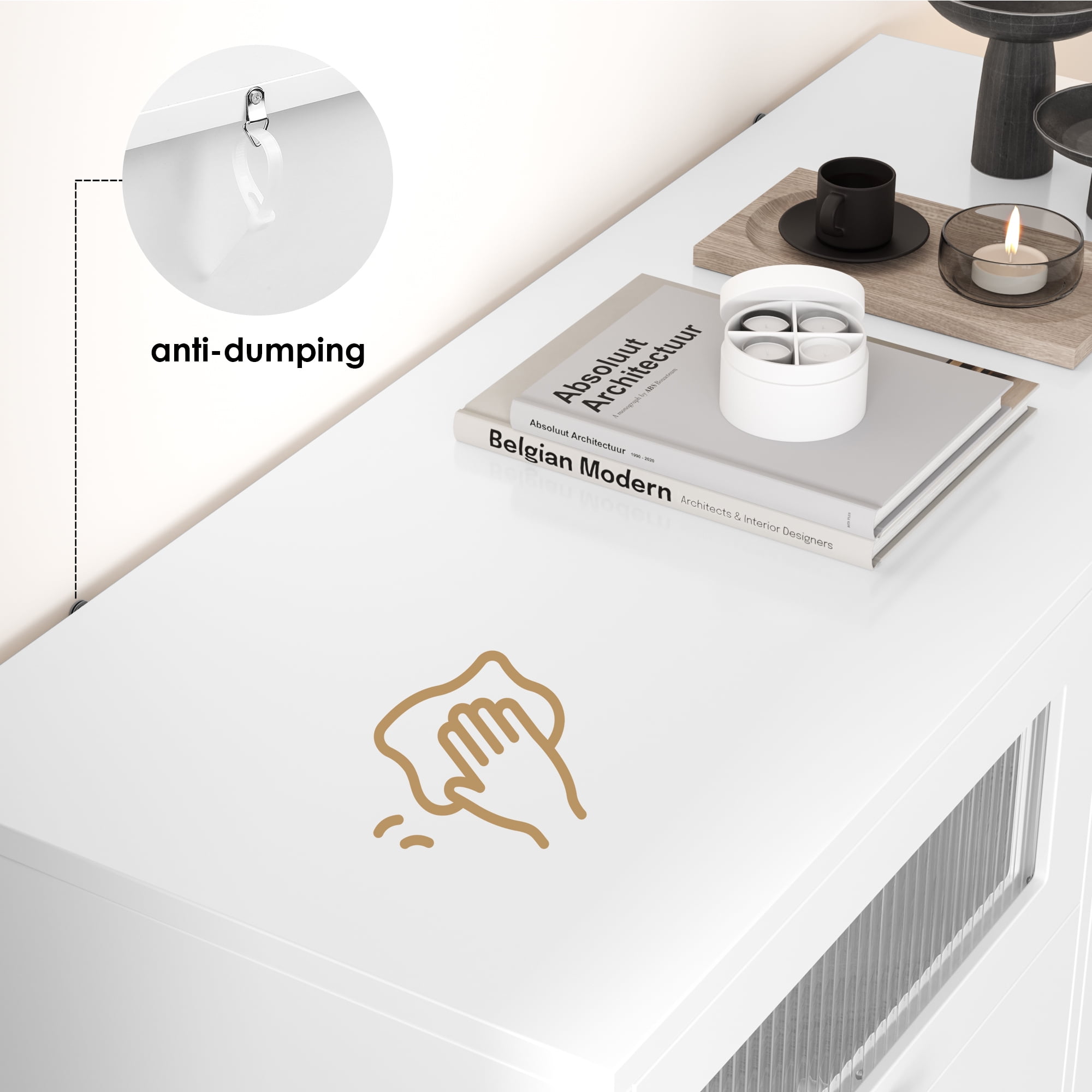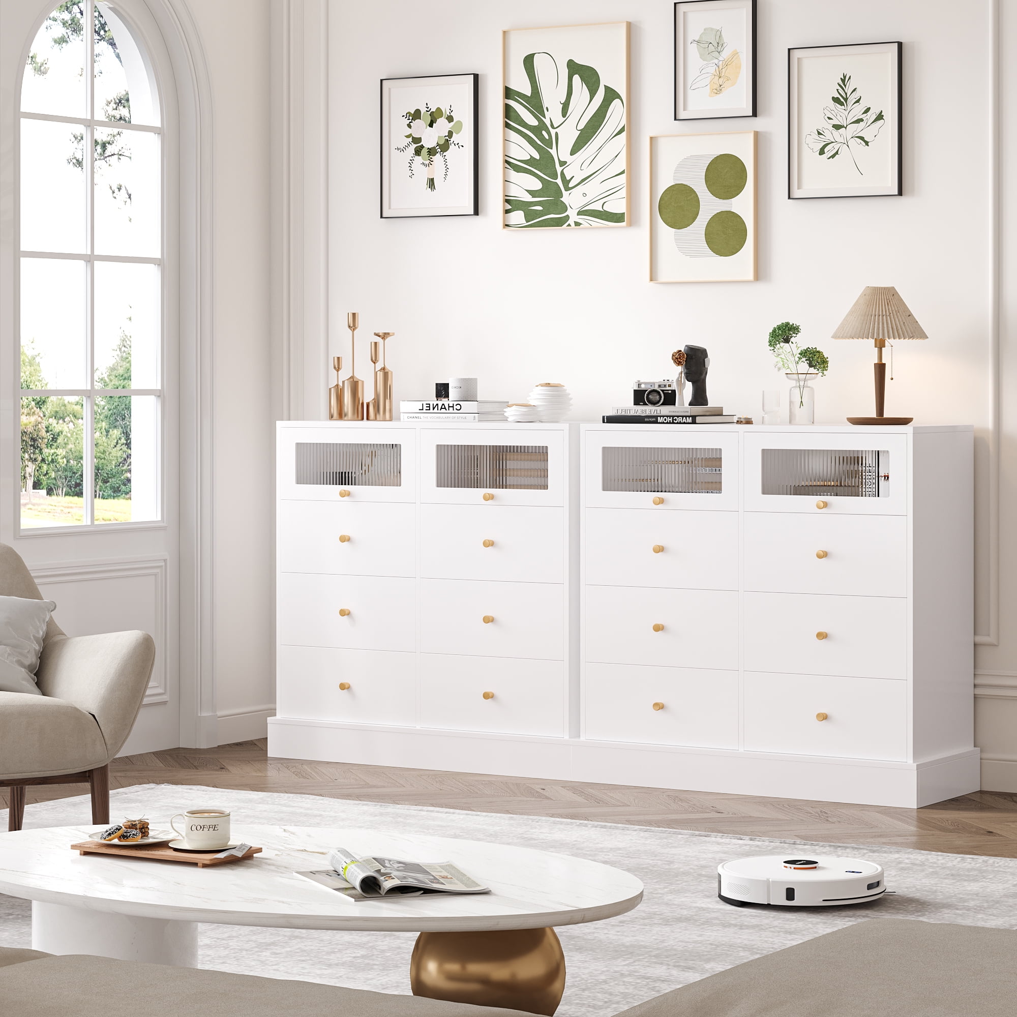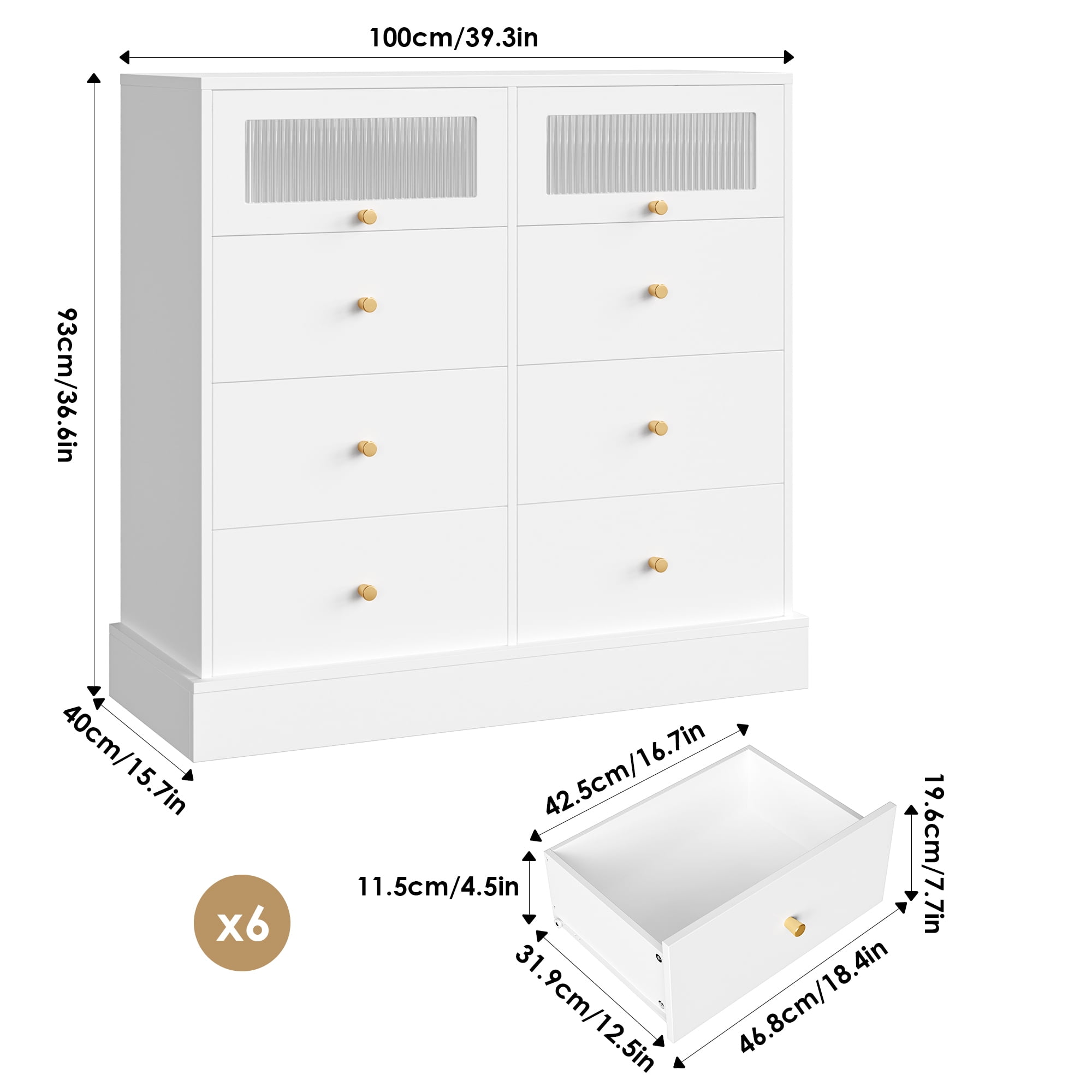 Features: 【8 Drawer Bedroom Dresser】This 8 drawers dresser offers you plenty of storage space for your bedroom, living room, hallway. You can place lamp and laptop on the top, store jewelry in the double dresser’s drawers. 【2 Flip Up Glass Doors】The flip-up opening and closing design can be almost completely vertically stored in the storage cabinet after flipping up 90°, which can save nearly 20% of the space, and is more suitable for rooms with small spaces. 【Sturdy Upgraded Base】Consist of high-quality wood and stable frame structure with multiple plates combined with each other, Upgraded version of heighted base provides more stability.This wood chest of drawers can hold more weight by using plenty of years. 【Modern Style】The modern style is suitable for you who want to live a refined life. The white surface and clear lines can be matched with many different decoration styles. Accented with sleek golden handles for a trend-forward finishing touch. 【Easy Assembly】All parts are numbered and detailed assembly instruction is provided, you can finish the white dresser assembly within 1 hour by 2 adults. 【24/7 Customer Service】We provide quality customer support, if you have any questions, please email us and we will reply within 24 hours. Specifications: Material:Manufactured Wood,Glass Color: White Overall Size:39.3” W X 36.6” H X 15.7” D Drawer Size:12.5*16.7*4.5in Overall Product Weight:94.9 lb. Number of Drawers:8 Number of Glass Doors: 2 Package Contents: 1x Chest of 8 Drawers 1 x Assembly Kit 1 x Instruction