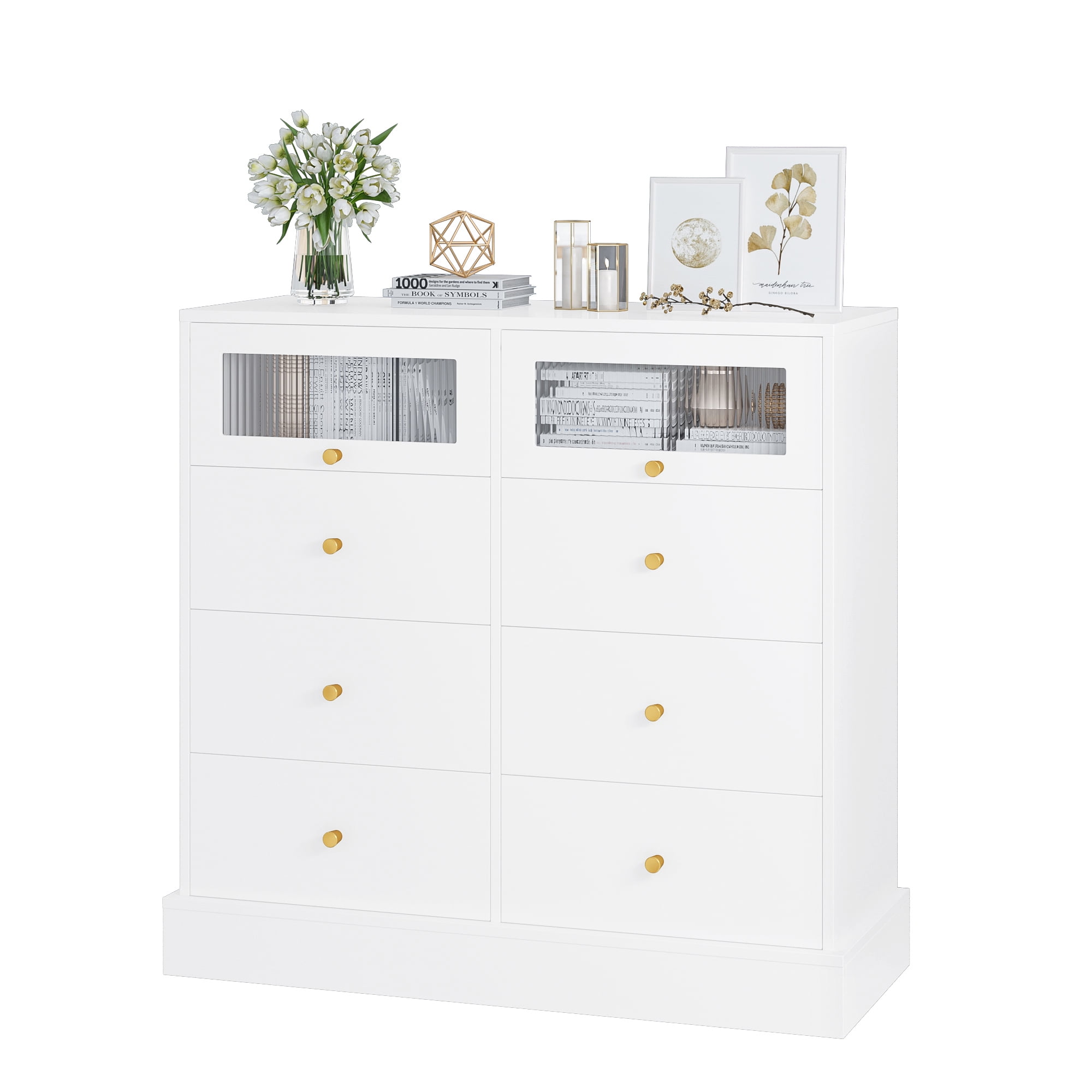 Homfa 8 Drawer Double Dresser for Bedroom, Wood Chest of Drawers Storage Cabinet with 2 Glass Doors & Sturdy Base, White