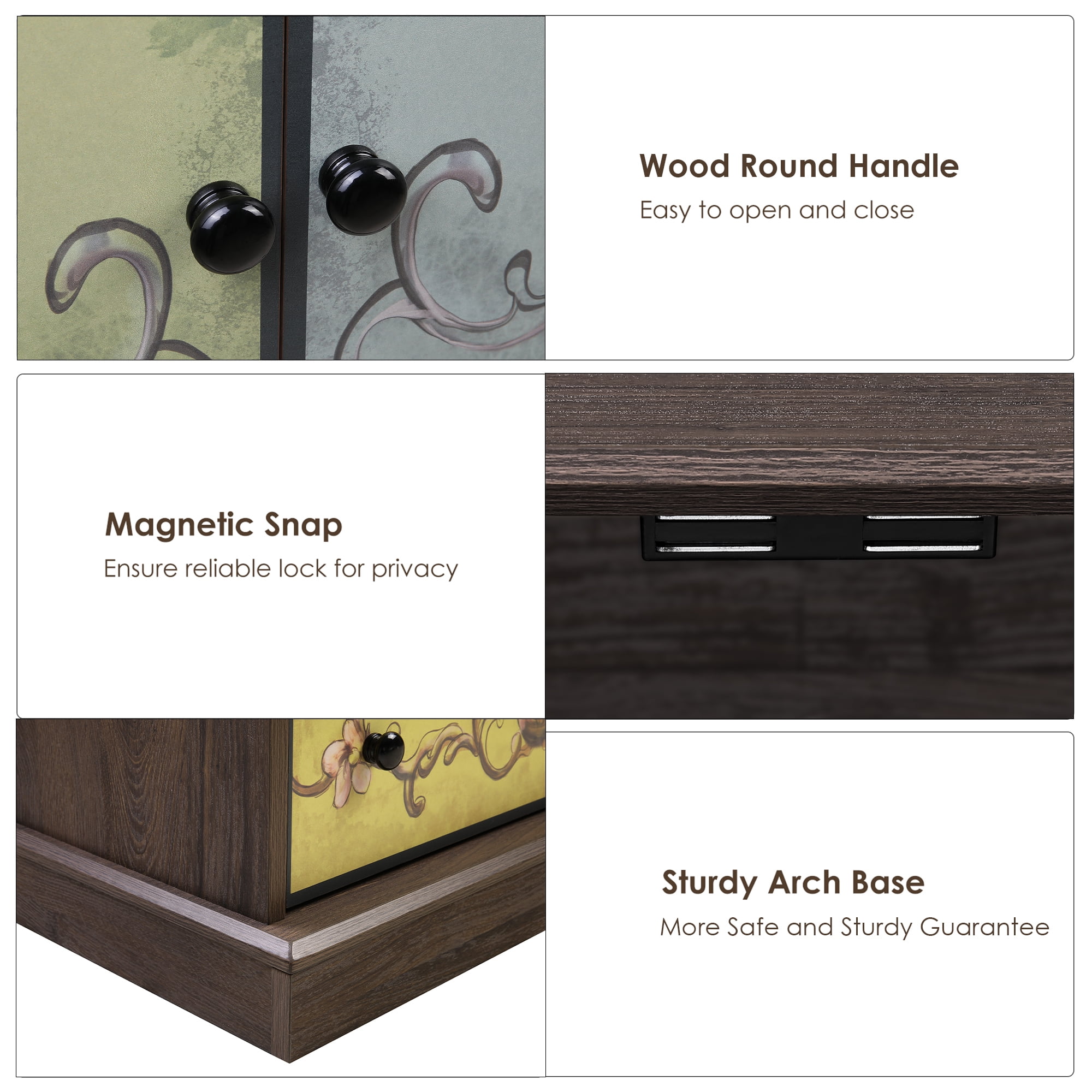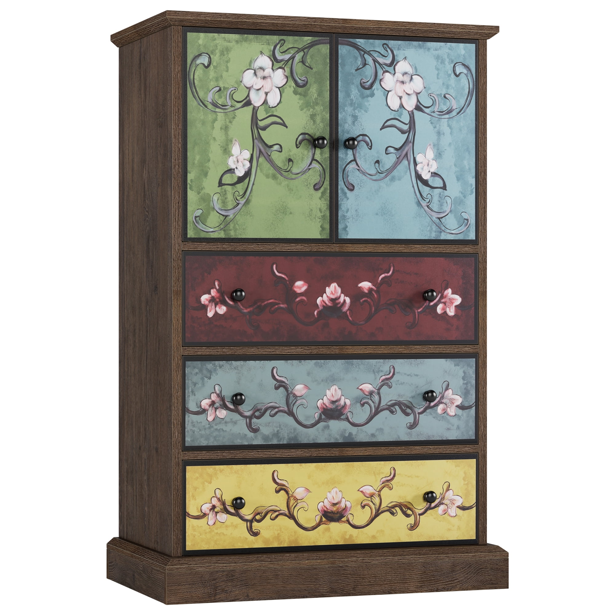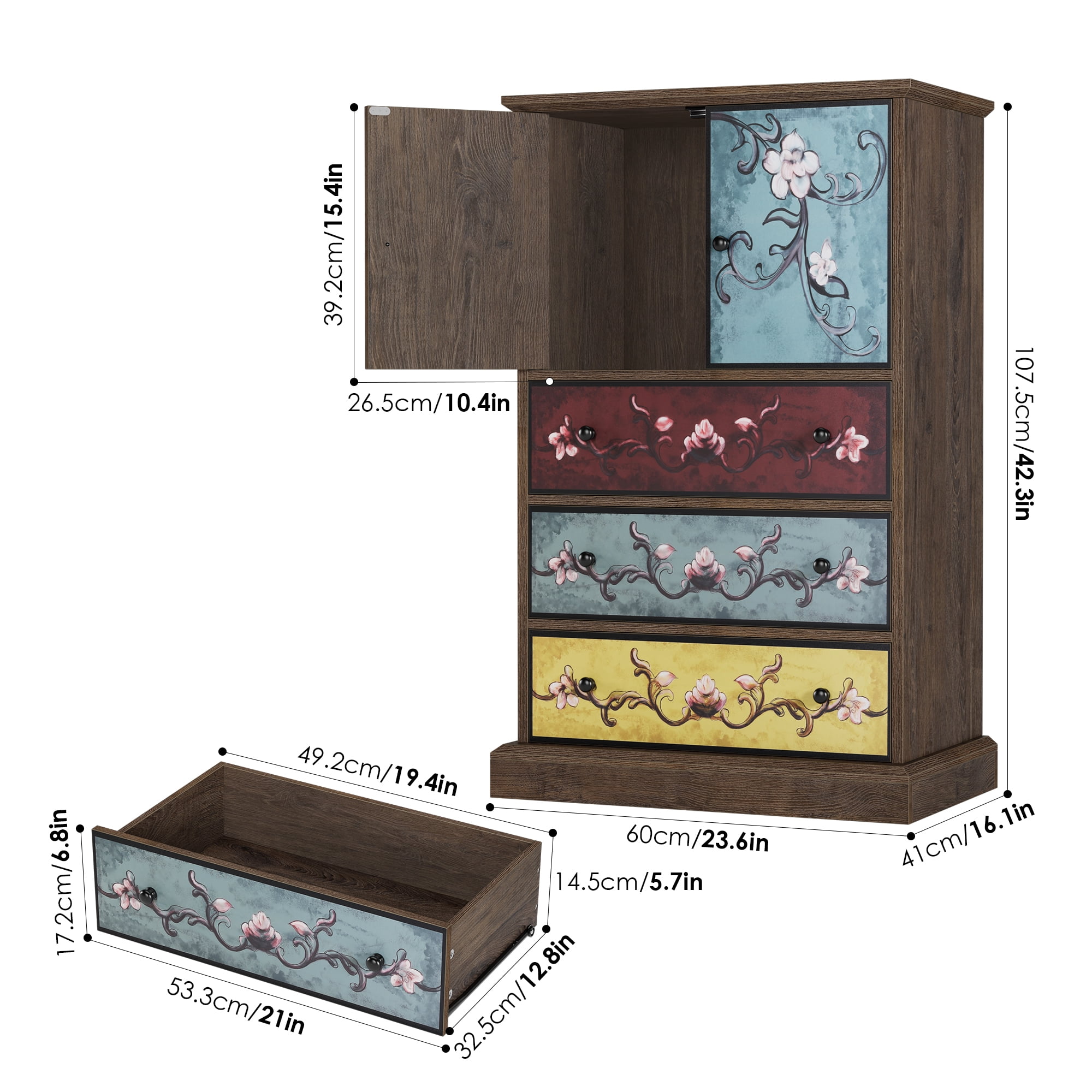 Features: 【Retro Boho Flower Pattern Cabinet Style】The flower painting surface makes this homfa accent cabinet a stand-out from other ordinary furniture, and become popular among women, also will bring your room a unique looking. 【Ample Space for Multiple Storage Needs & Small Room】Dimensions of this Homfa accent cabinet: 29.1″L x 15.3″W x 43.7″H. 3 large capacity drawers plus a 2-cabinet-door shelf and a wide top surface provide as much storage space as possible for a wide range of storage needs, saving your valuable room space. 【Sturdy Structure & Anti-Falling Device】The steady construction of scientific assembled design and carefully picked wood make sure this boho accent cabinet can accompany your family for a long time. Besides, 1 anti-falling device to prevent the cabinet from falling over! 【Easy Assembly】 Everything needed for assembly comes collected in a package sent to you. This homfa accent cabinet with 2 doors & 3 drawers could be easily assembled in less than an hour by 2 people with the instructions. 【24/7 Customer Service】We provide quality customer support, if you have any questions with this homfa bedroom storage cabinet, please email us and we will reply within 24 hours. Specifications: Overall Dimension: 23.6″L x 16″W x 42.3 “H Storage Cabinet Color: Brown, Green, Yellow Handle Color: Black Number of Drawers: 3 Large Capacity Drawers Tip over Restraint Device Included: Yes Assembly Required: Yes Warranty: 1-year Limited Manufacturer Packaging Includes: 1 x Storage Cabinet 1 x Accessory Bag 1 x Instruction Manual