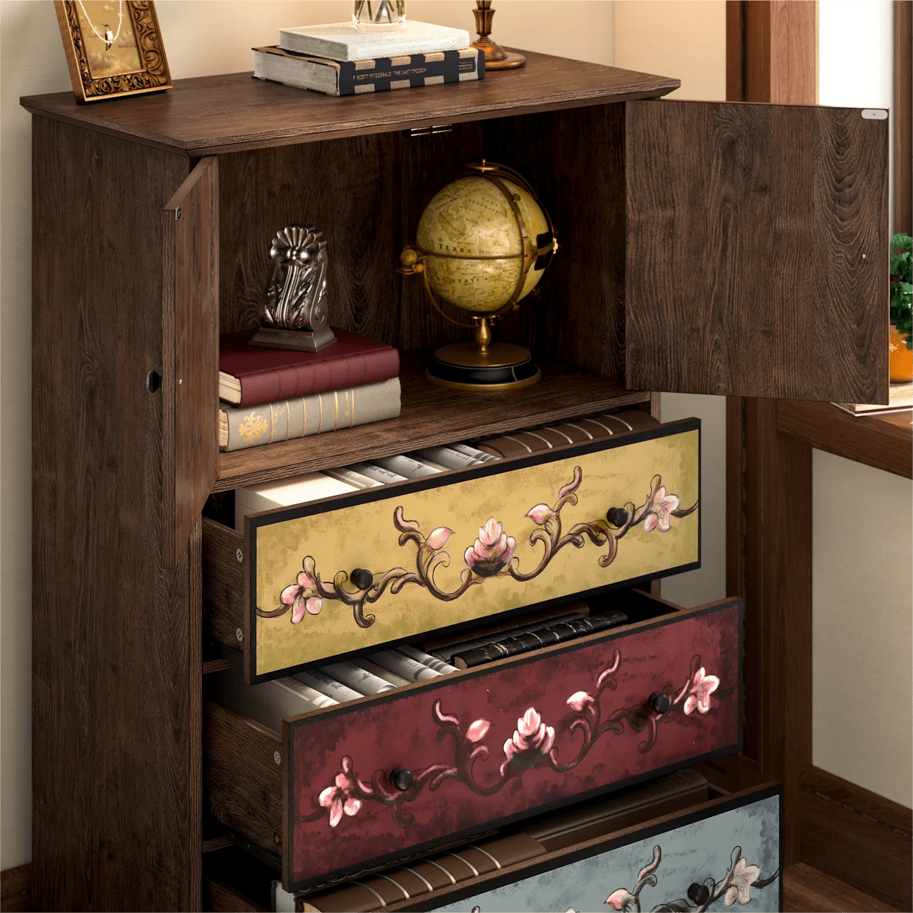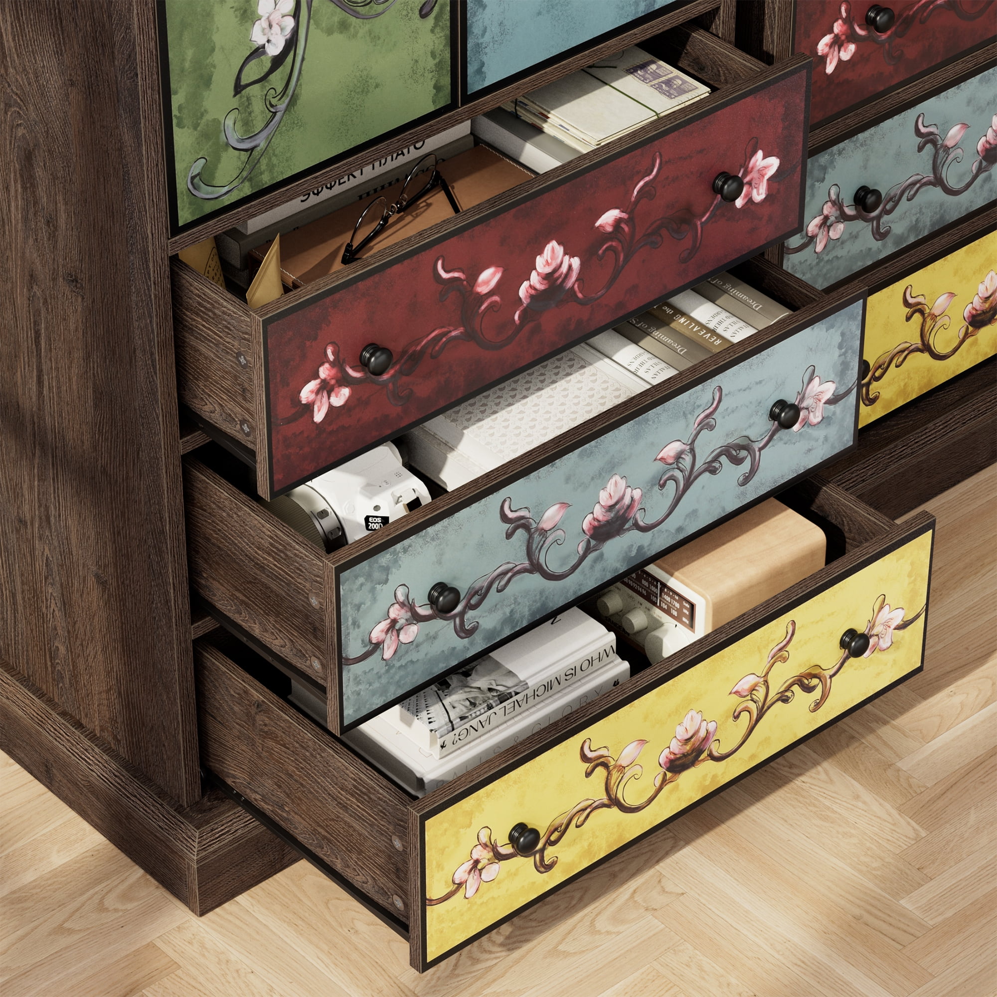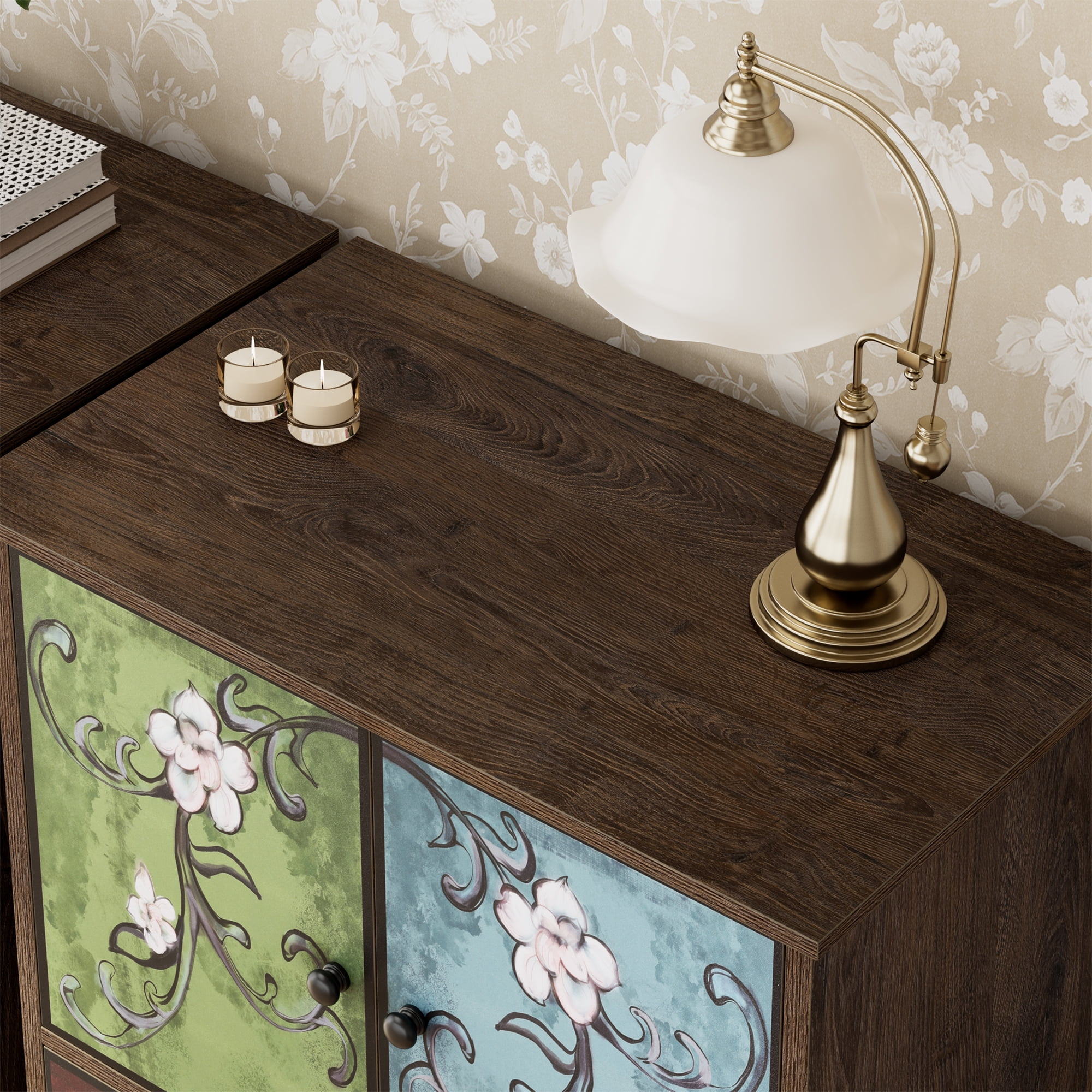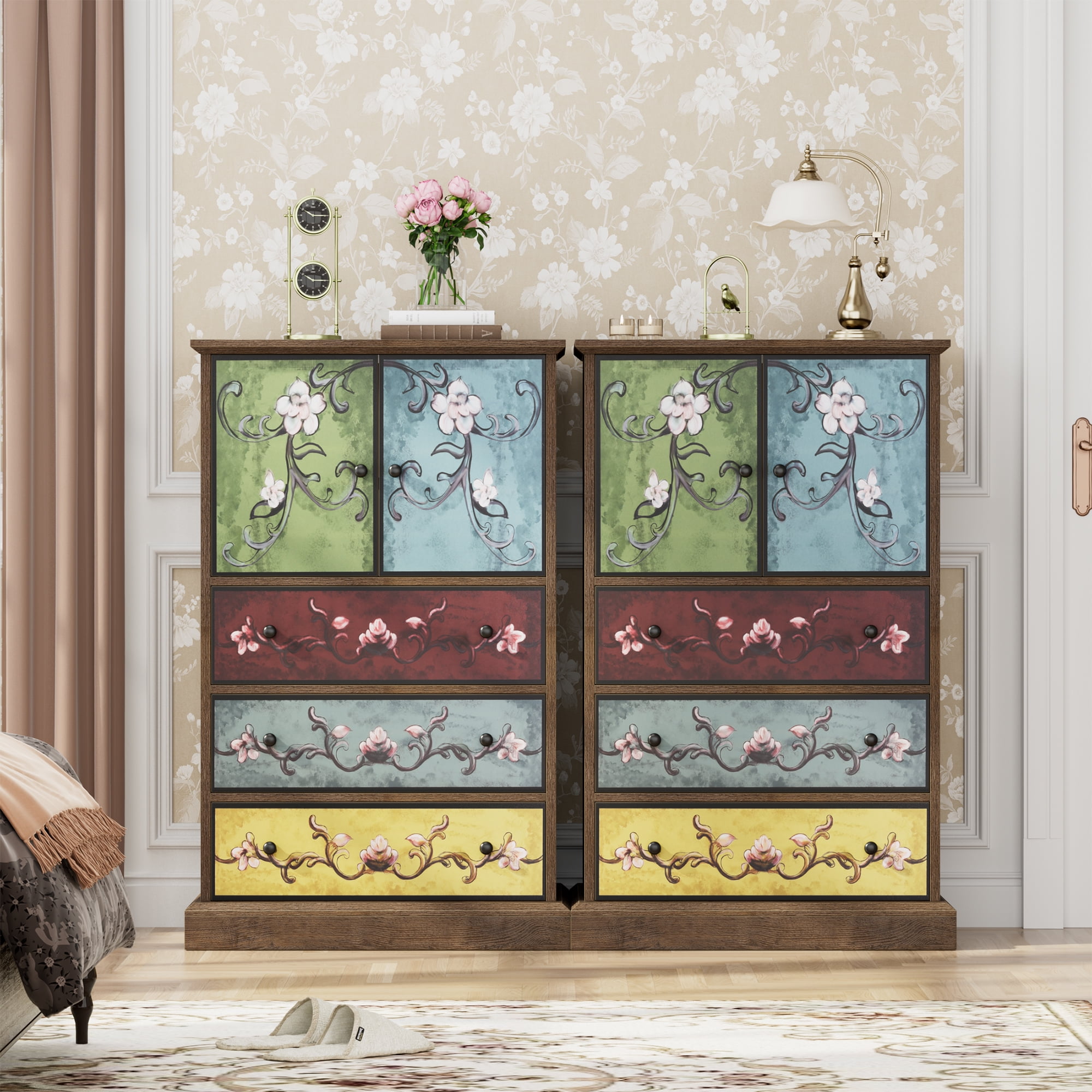Features: 【Retro Boho Flower Pattern Cabinet Style】The flower painting surface makes this homfa accent cabinet a stand-out from other ordinary furniture, and become popular among women, also will bring your room a unique looking. 【Ample Space for Multiple Storage Needs & Small Room】Dimensions of this Homfa accent cabinet: 29.1″L x 15.3″W x 43.7″H. 3 large capacity drawers plus a 2-cabinet-door shelf and a wide top surface provide as much storage space as possible for a wide range of storage needs, saving your valuable room space. 【Sturdy Structure & Anti-Falling Device】The steady construction of scientific assembled design and carefully picked wood make sure this boho accent cabinet can accompany your family for a long time. Besides, 1 anti-falling device to prevent the cabinet from falling over! 【Easy Assembly】 Everything needed for assembly comes collected in a package sent to you. This homfa accent cabinet with 2 doors & 3 drawers could be easily assembled in less than an hour by 2 people with the instructions. 【24/7 Customer Service】We provide quality customer support, if you have any questions with this homfa bedroom storage cabinet, please email us and we will reply within 24 hours. Specifications: Overall Dimension: 23.6″L x 16″W x 42.3 “H Storage Cabinet Color: Brown, Green, Yellow Handle Color: Black Number of Drawers: 3 Large Capacity Drawers Tip over Restraint Device Included: Yes Assembly Required: Yes Warranty: 1-year Limited Manufacturer Packaging Includes: 1 x Storage Cabinet 1 x Accessory Bag 1 x Instruction Manual