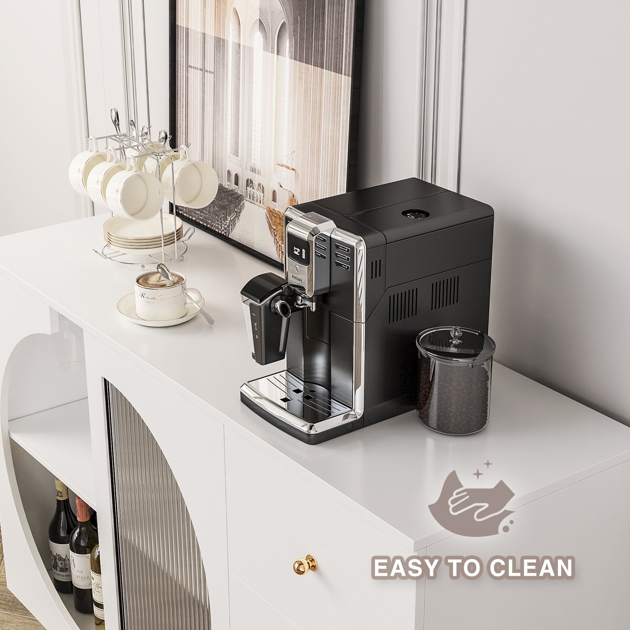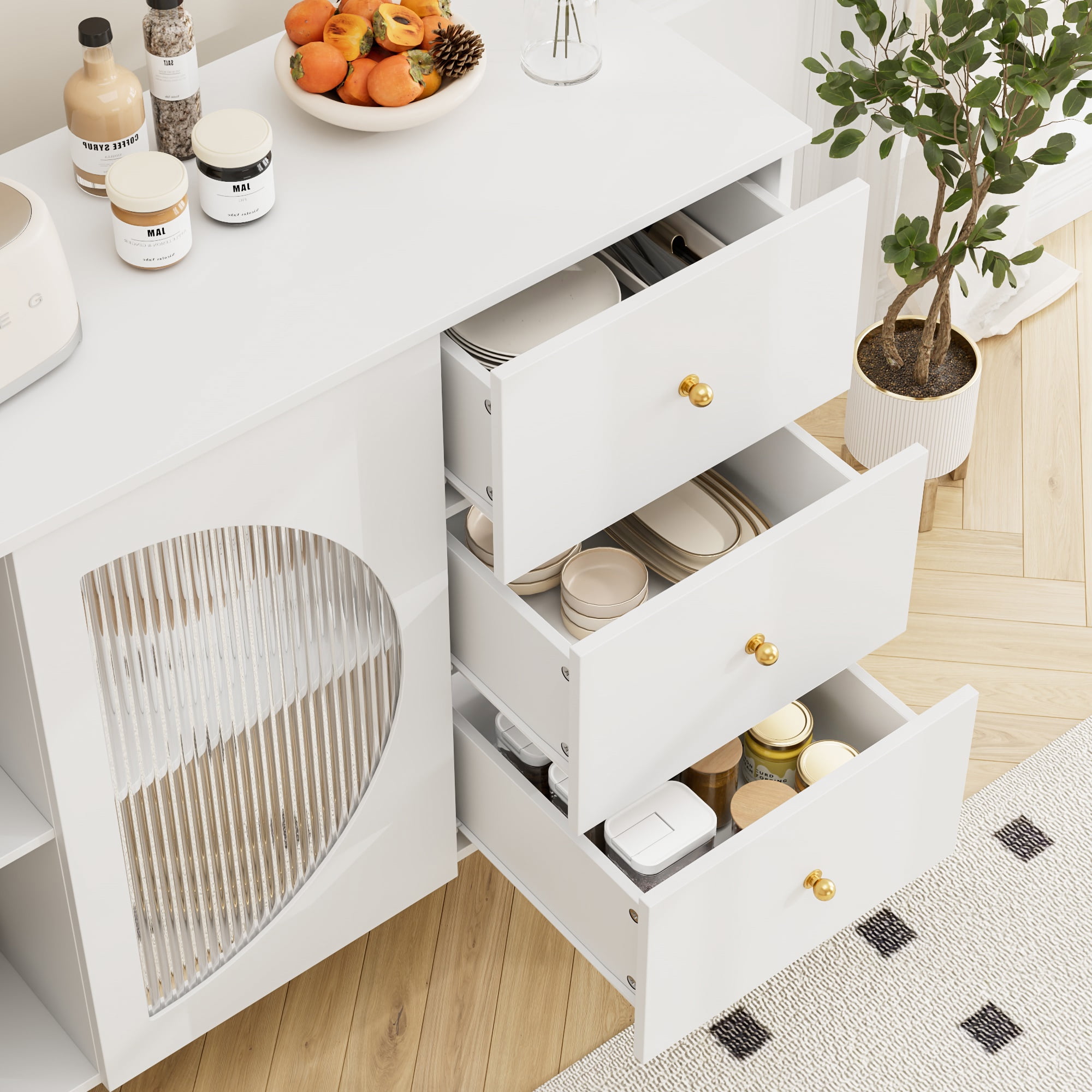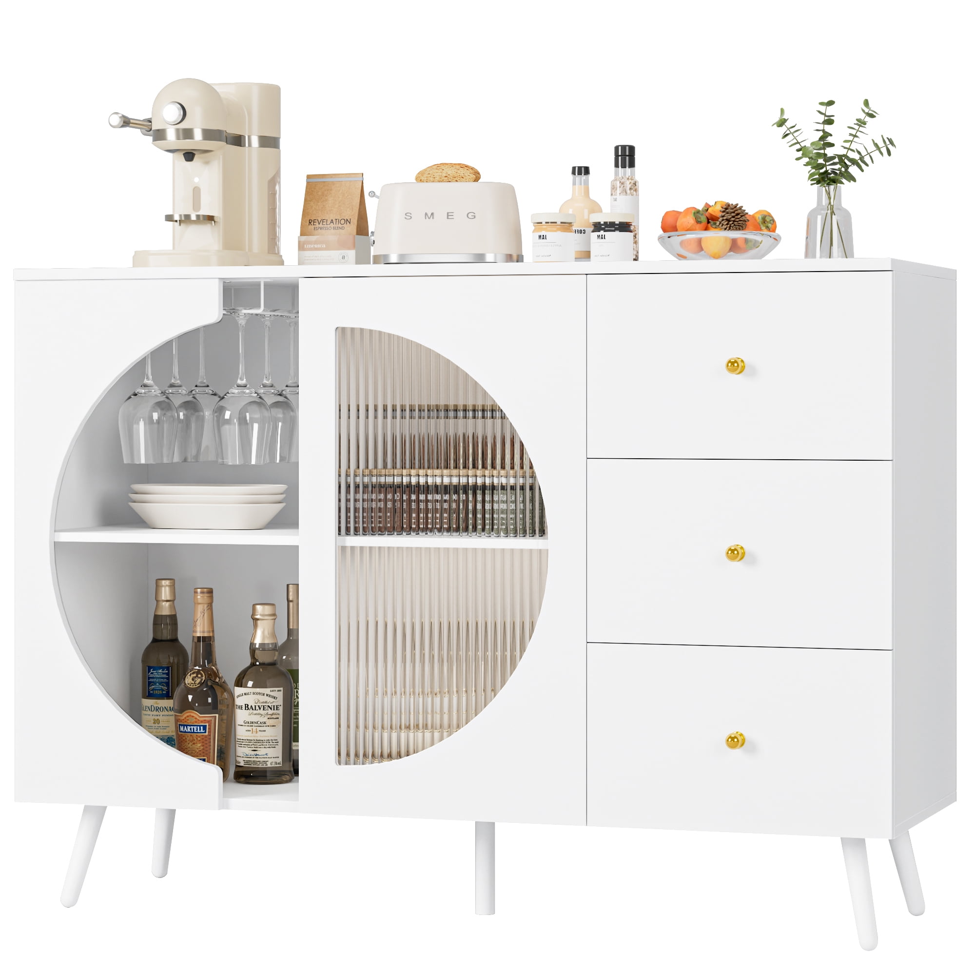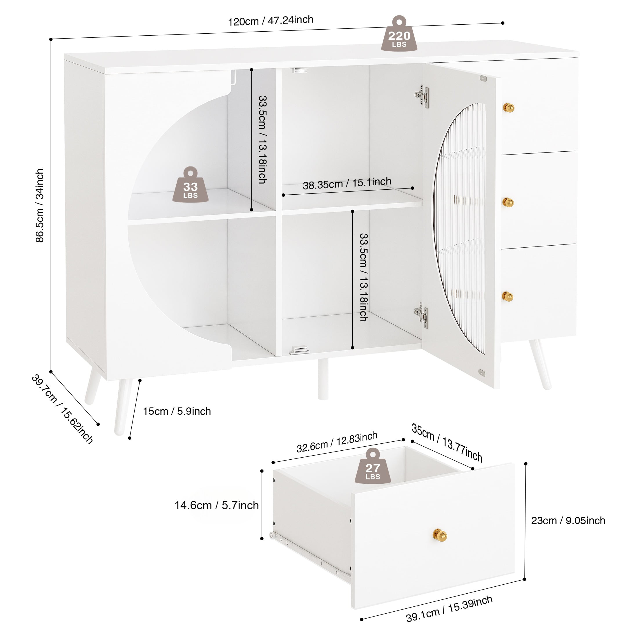 Homfa White Sideboard Buffet Cabinet with 3 Drawers: Unique Fluted Glass Door: Homfa wine cabinet effortlessly blends modern design with practicality, featuring unique semi-circular open shelves for easy access to wine bottles and glasses, fluted glass doors for a sleek touch. Easy to Clean: The surface of the bar cabinet is scratch-resistant and wear-resistant, making it easy to cope with daily cleaning and maintenance. Modern Buffet Cabinet with Storage: With 2 separate drawers, 1 glass doors, liquor cabinet can be placed in the living room, entryway, and kitchen, for your wine, decorations, greenery, or to your coffee machine, dishes, etc. Artistic Displays: 47.2” table top and semi-circular tempered glass door let you display your exquisite dishes and cups while still providing privacy. Easy Installation: With detailed instructions and numbered parts and screws, this coffee bar for kitchen is easy to install. 24/7 Customer Service: Quality support – any questions, email us, and we’ll respond within 24 hours. Specifications: Color: White Material: Wooden&Glass&Metal Product Dimensions: 47.24” W×33.86” H×15.75” D Item Weight: 84.88 lbs Material: MDF Wood Model: FMW-067 Number of Interior Shelves: 2 Number of Wine Rack: 2 Lighting Included: No Door Size: 20.4” H×14.51” W Drawers Size: 12.6” W×13.8” H×5.7” D Assembly Required: Yes Suggested Number of People for Installation: 2(c. 40 min) Warranty Length: 1 Year Package Include: 1 x White Sideboard Buffet 1 x Assembly Kit 1 x Instruction