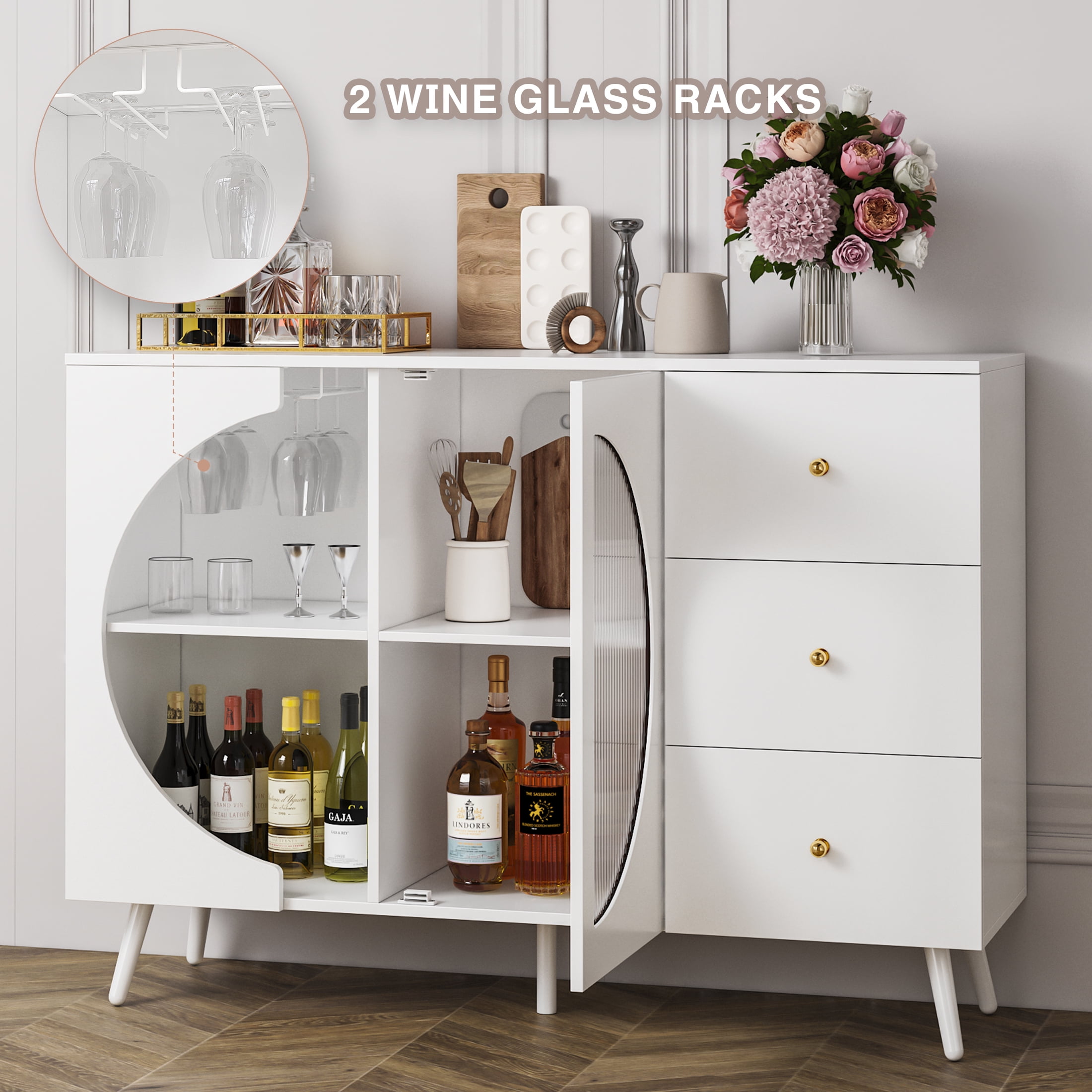 Homfa Bar Cabinet with 2 Glass Cup Holders & 3 Drawers, Modern Sideboard for Living Dining Kitchen Room, White