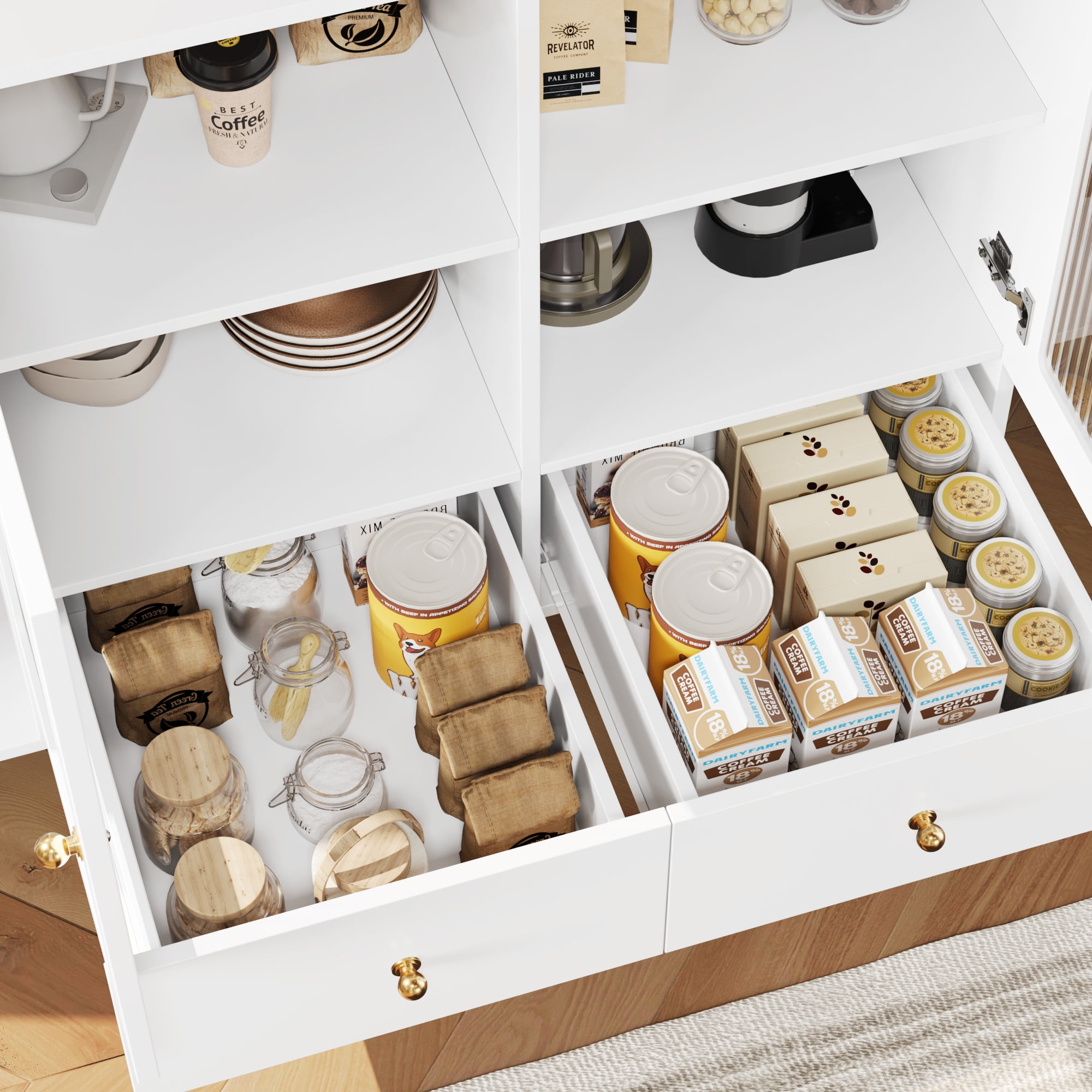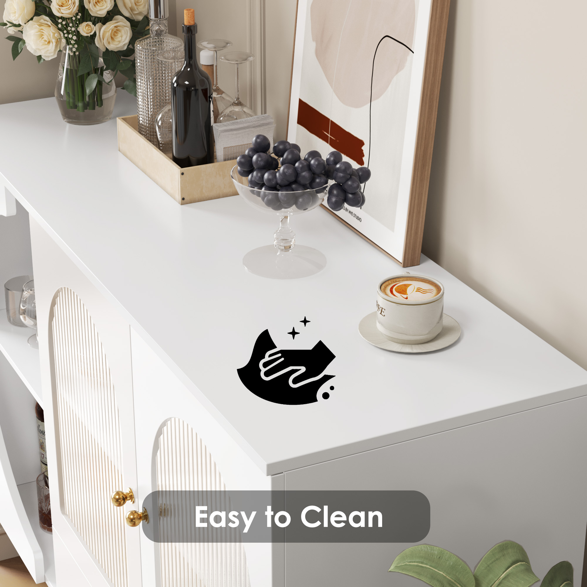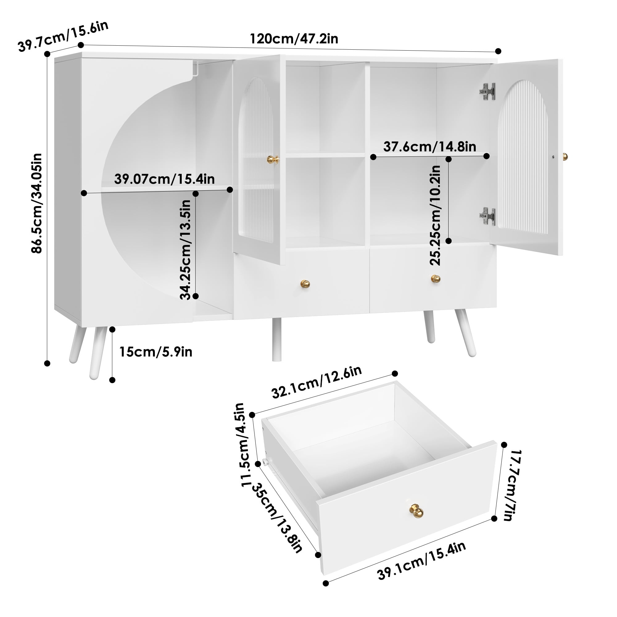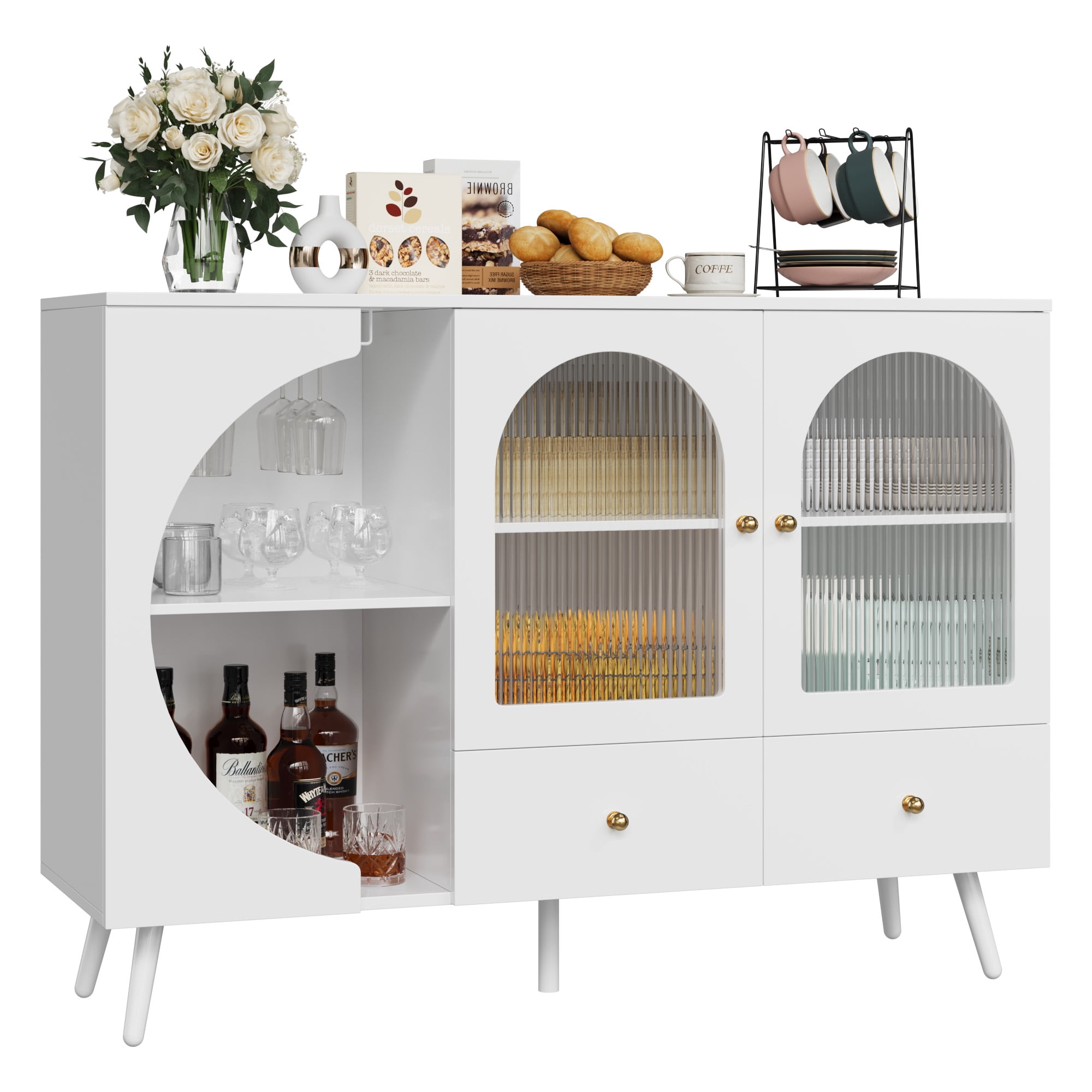 White Coffee Bar Cabinet with Semi-circle Door: Unique Fluted Glass Doors: Homfa wine cabinet effortlessly blends modern design with practicality, featuring unique semi-circular open shelves for easy access to wine bottles and glasses, fluted glass doors for a sleek touch. Easy to Clean: The surface of the bar cabinet is scratch-resistant and wear-resistant, making it easy to cope with daily cleaning and maintenance. Modern Buffet Cabinet with Storage: With 2 separate drawers, 2 glass doors, liquor cabinet can be placed in the living room, entryway, and kitchen, for your wine, decorations, greenery, or to your coffee machine, dishes, etc. Artistic Displays: 47.2” wide cabinet and semi-circular tempered glass door let you display your exquisite dishes and cups while still providing privacy. Easy Installation: With detailed instructions and numbered parts and screws, this coffee bar for kitchen is easy to install. 24/7 Customer Service: Quality support – any questions, email us, and we’ll respond within 24 hours. Specifications: Material: MDF Wood Model: FMW-063 Color: White Product Dimensions: 47.24” W×33.86” H×15.75” D Item Weight: 84.88 lbs Number of Interior Shelves: 2 Number of Wine Rack: 2 Lighting Included: No Door Size: 20.4” H×14.51” W Drawers Size: 12.6” W×13.8” H×5.7” D Assembly Required: Yes Suggested Number of People for Installation: 2(c. 40 min) Warranty Length: 1 Year Package Include: 1 x White Bar Cabinet 1 x Assembly Kit 1 x Instruction