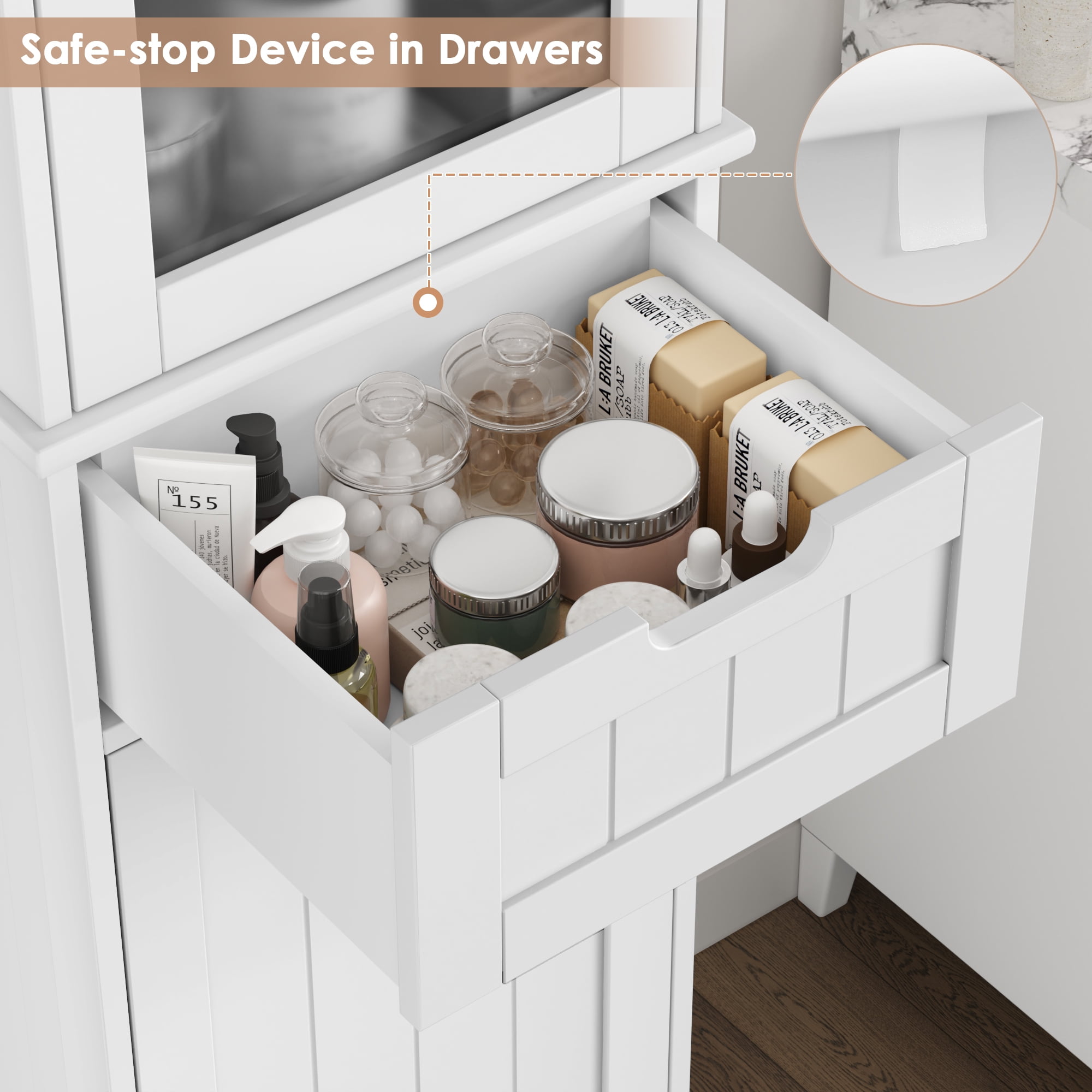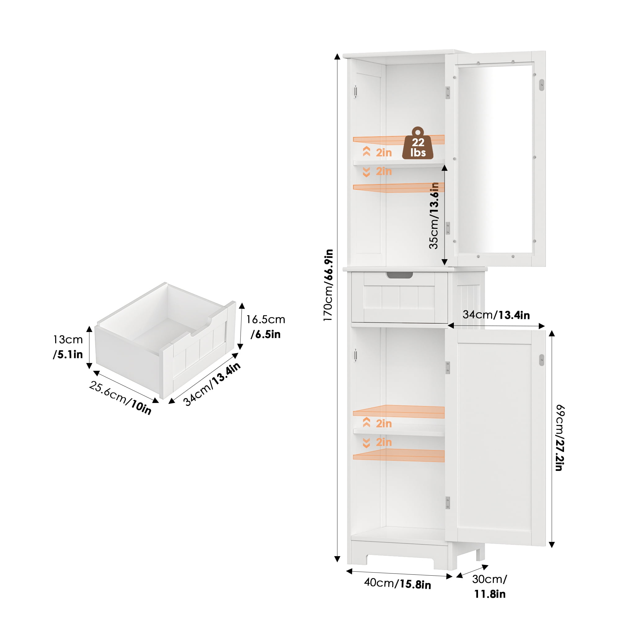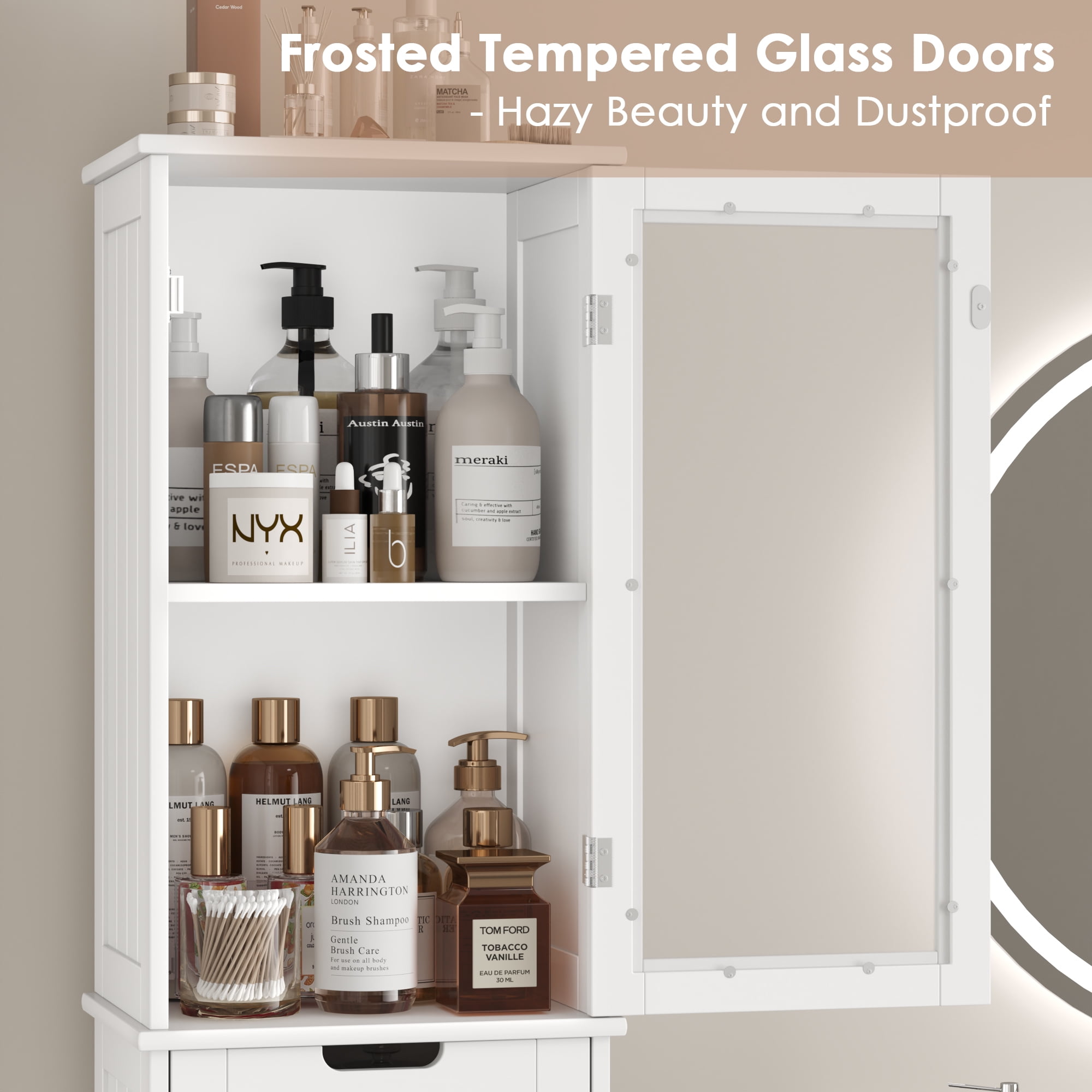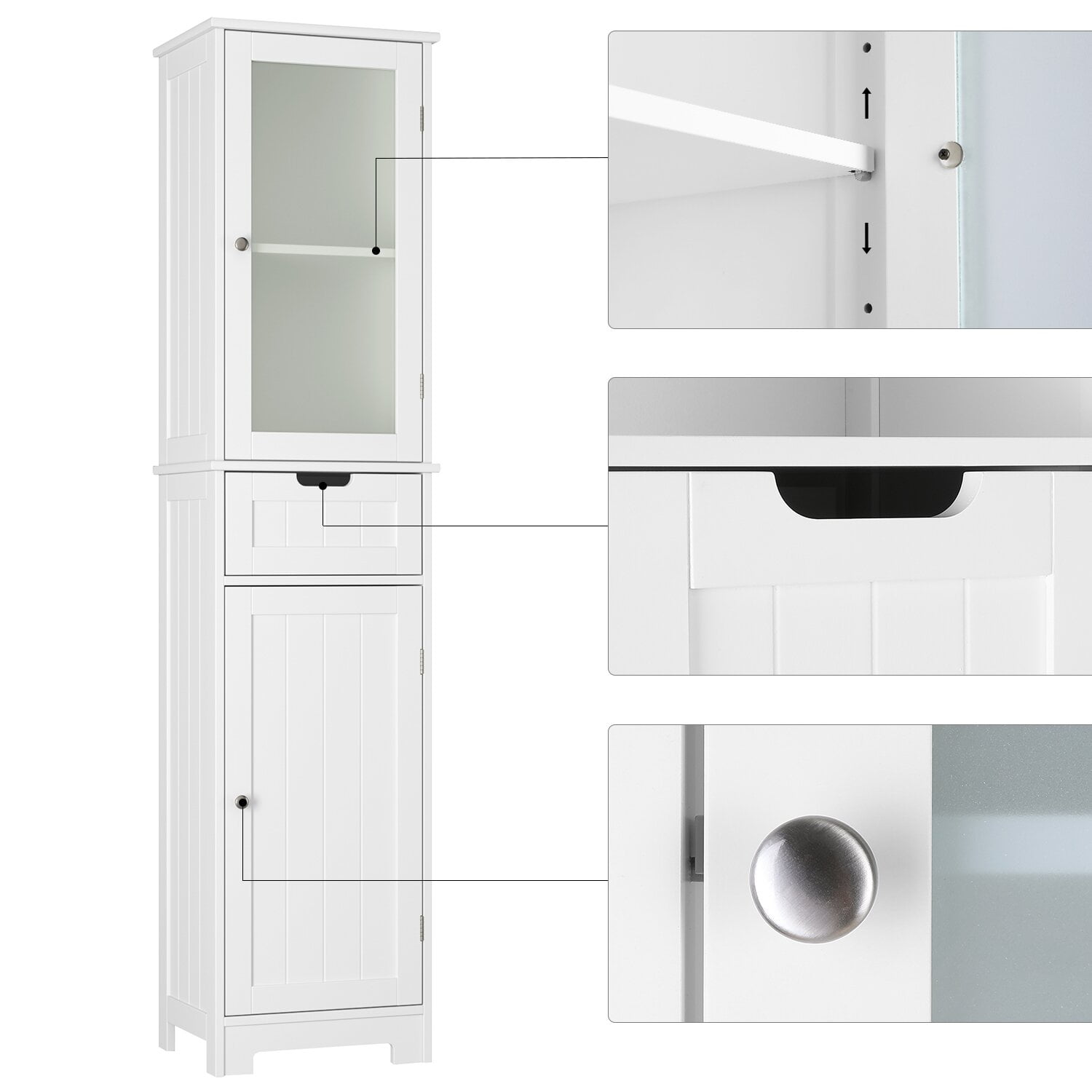 Features 【Slim Narrow Cabinet—Perfect for Small Spaces】Dimensions: 15.7″ L x 11.8″ W x 67″ H. This small bathroom storage comes with 2 cabinets, 4 compartments, and 1 removable center drawer to store all your toiletries privately. 【Frosted Glass—Privacy】This bathroom linen cabinet features frosted glass doors to hide your personal belongings and add a hazy beauty to the bathroom. 【Adjustable Shelves—Customize Your Space】There is a 3-level adjustable shelf behind each door of the white bathroom cabinet, which can be adjusted 2″ up and down, allowing you to customize the space according to the items you need to place. 【Sturdy and Durable—Waterproof and Moisture-Proof】This tall cabinet with doors and shelves is made of high-quality medium-density fiberboard and environmentally friendly paint, which is waterproof and moisture-proof to ensure long-term use. The handles are made of zinc alloy, which is beautiful and durable. The height of the narrow cabinet legs helps the circulation of moist air. 【More than a Bathroom Cabinet】The thin storage tower is perfect for limited or small spaces and provides ample vertical storage space for a variety of places: bathrooms, laundry rooms, living rooms, kitchens, entryways, and toilets. 【Easy to Assemble & 24/7 Customer Service】The tall bathroom cabinet with drawers comes with all mounting hardware and detailed instructions; 1 adult can easily complete it in 30 minutes. 24/7 quality customer service so you don’t have to worry about lost and damaged parts. Specifications Material: High-quality MDF and Glass Color: White Handles Finish: Silver Size: 15.7″ L x 11.8″ W x 67″ H Drawer Interior: 15” L x 10.6” W x 7” H Number of Shelves: 4 Number of Doors: 2 Number of Drawers: 1 Overall Product Weight: 46.3 lbs Durability: Waterproof, Moisture-proof Soft Closing: Soft Close Door Hinges & Drawer Glides Package Contents 1 x Tall Narrow Bathroom Cabinet 1 x Assembly Kit 1 x Instructions