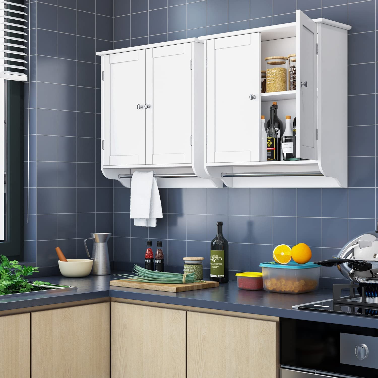 Features 【FUNCTIONAL WALL CABINET】The wall-mounted cabinet can be used to hold your towels, toiletries, books, bowls, chopsticks, or wines in your bathroom, bedroom, kitchen, or living room. There is an inside adjustable shelf that can be adjustable to three kinds of height to meet your storage needs. The bathroom wall cabinet with doors can maintain your items clean and dry. Also, the storage cabinet with a towel bar is convenient for you to use and place your towels in the bathroom. 【EXCELLENT QUALITY】Made of high-grade MDF and polished with eco-friendly paint, the kitchen wall cabinet is waterproof, durable, and erosion-resistant. Manufactured with precise craftsmanship, the wall storage cabinet is designed to satisfy your pursuit of quality. Mounted into the wall, it can make your house more attractive and orderly without occupying too much space. 【FASHIONABLE & MODERN】This wooden storage cabinet is not only practical and functional but also fashionable and exquisite. With classic color, straight lines, and unique design, the wood cabinet can match well with any space in your home. make your house more attractive and orderly. 【EASY TO ASSEMBLE & CLEAN】All accessories and detailed instructions are included, so it is easy for you to assemble. With two holes in the back of the white cabinet, you can install it into the wall easily and tightly. Since the smooth panels are waterproof, you can use a wet cloth to dash it directly. It is easy for you to maintain. 【Size】Its size is 23.62*8.27*24.21”(60*21*61.5 cm). Homfa will provide you with the best service before and after your purchase. Just buy it and enjoy it! The wall cabinet will greatly facilitate your life! Specifications Material: MDF Wood Color: White Overall Size: 23.6*8.27*24.2 inch Weight: 16.53 lbs Number of Shelves: 2 Shelf Weight Capacity: 11 lb Assembly Required: Yes Package Content:1 x Wall Cabinet1 x Assembly Kit1 x Instructions Package Content: 1 x Wall Cabinet 1 x Assembly Kit 1 x Instructions