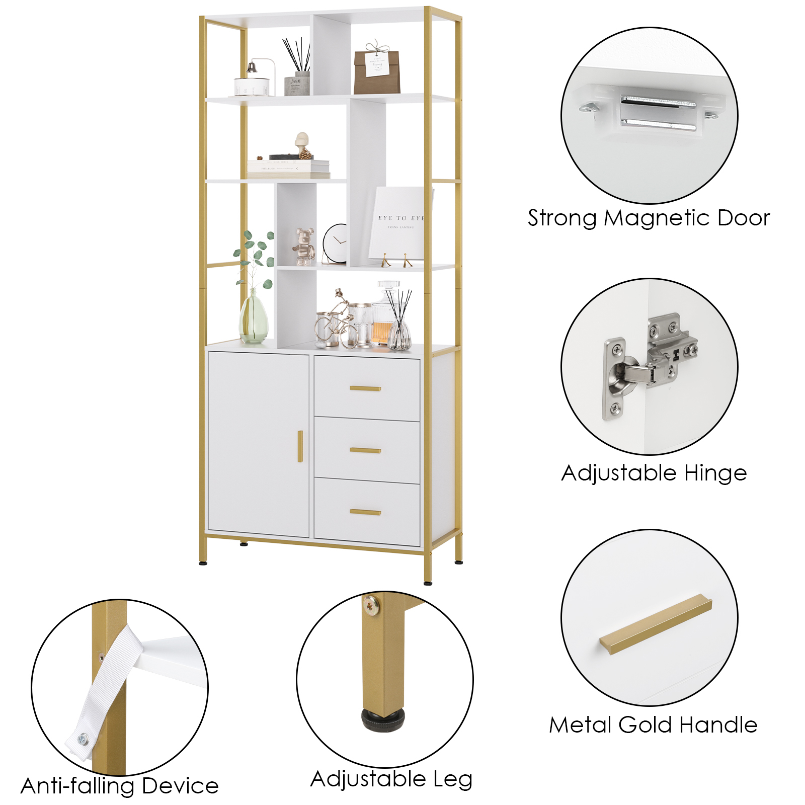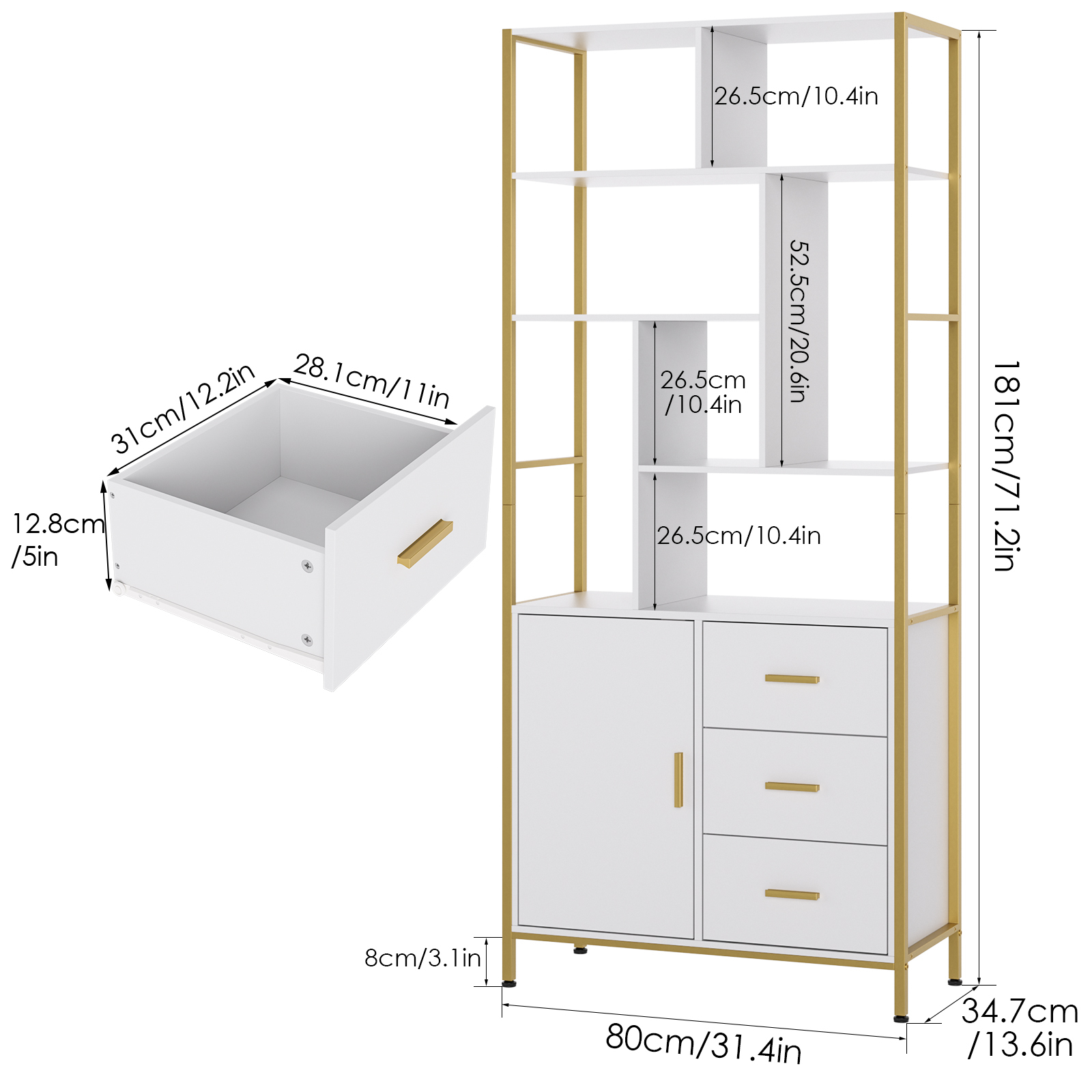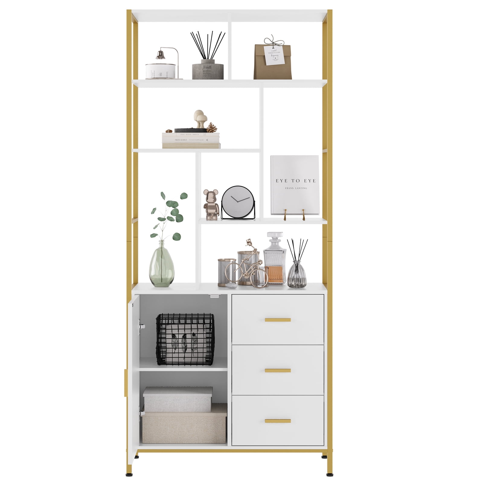 Features: 【Adequate Storage Space】The geometric bookcase has 7 open storage shelves, 1 cabinet with 2 inner shelves and 3 drawers to meet your storage needs. Each shelf is strong enough to support up to 35 lbs. 【Modern Design】The bookshelf is designed with golden frame, unique and stylish shape, straight and smooth lines, modern and fashionable. 【Quality Material】Floor standing bookshelf is made of certified high quality eco-friendly panels to prevent scratching, stain resistance and no unpleasant odor for long term use. Adjustable feet ensure superb stability even on uneven floors. 【Multi-functional Display Shelf】Geometric bookcase is not only a good storage cabinet, but also two or more shelves can be put together to form a partition for your living room, bedroom, office, hallway, etc. 【Easy to Assemble】All accessories and easy to understand instructions are included. You can assemble the bookshelf without much effort. Feel free to contact us with any questions. Specifications: Material: Manufactured Wood Frame Material: Iron Color: White and Gold Overall Size: 71.2” H X 31.4” W X 13.6” D Drawer Interior: 5” H X 12.2” W X 11” D Number of Doors Included: 1 Number of Drawers Included: 3 Smallest Shelf Weight Capacity: 20 lb. Largest Shelf Weight Capacity: 40 lb. Package Contents: 1 x Bookcase with Door and Drawers 1 x Accessory Kit 1 x Instructions manual