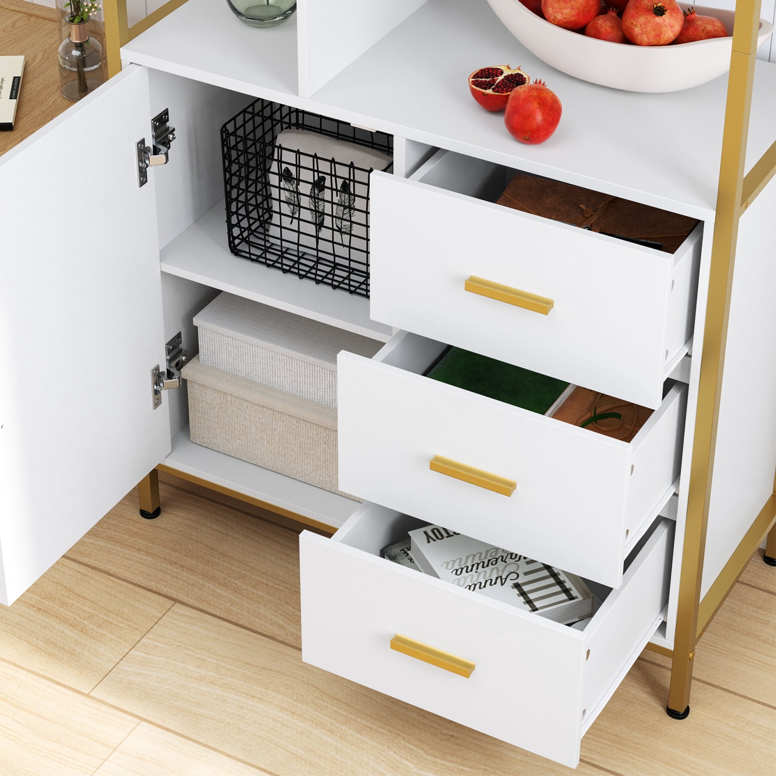Homfa Bookshelf with Drawers, Gold Shelves with Doors, White Tall Bookcase for Home Office