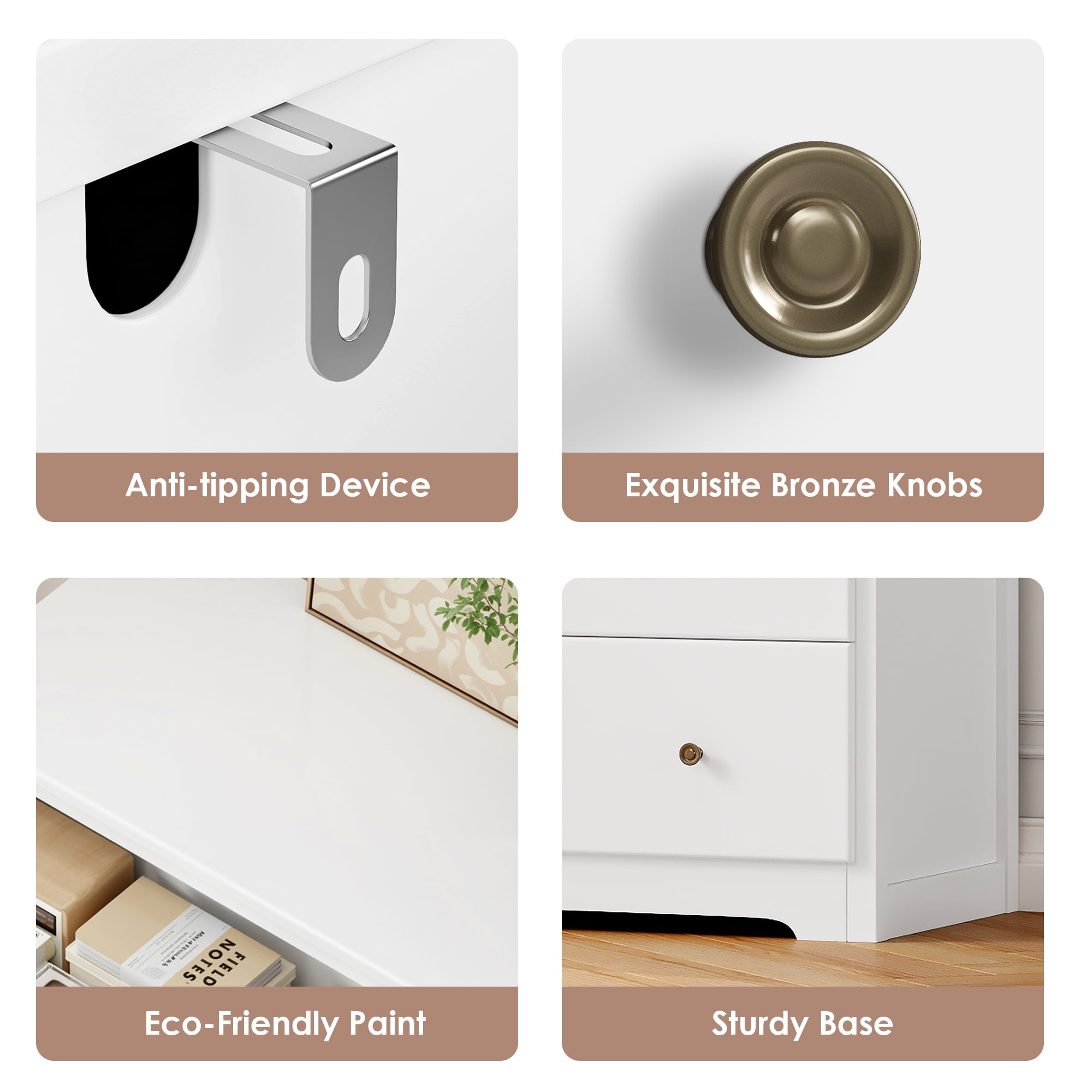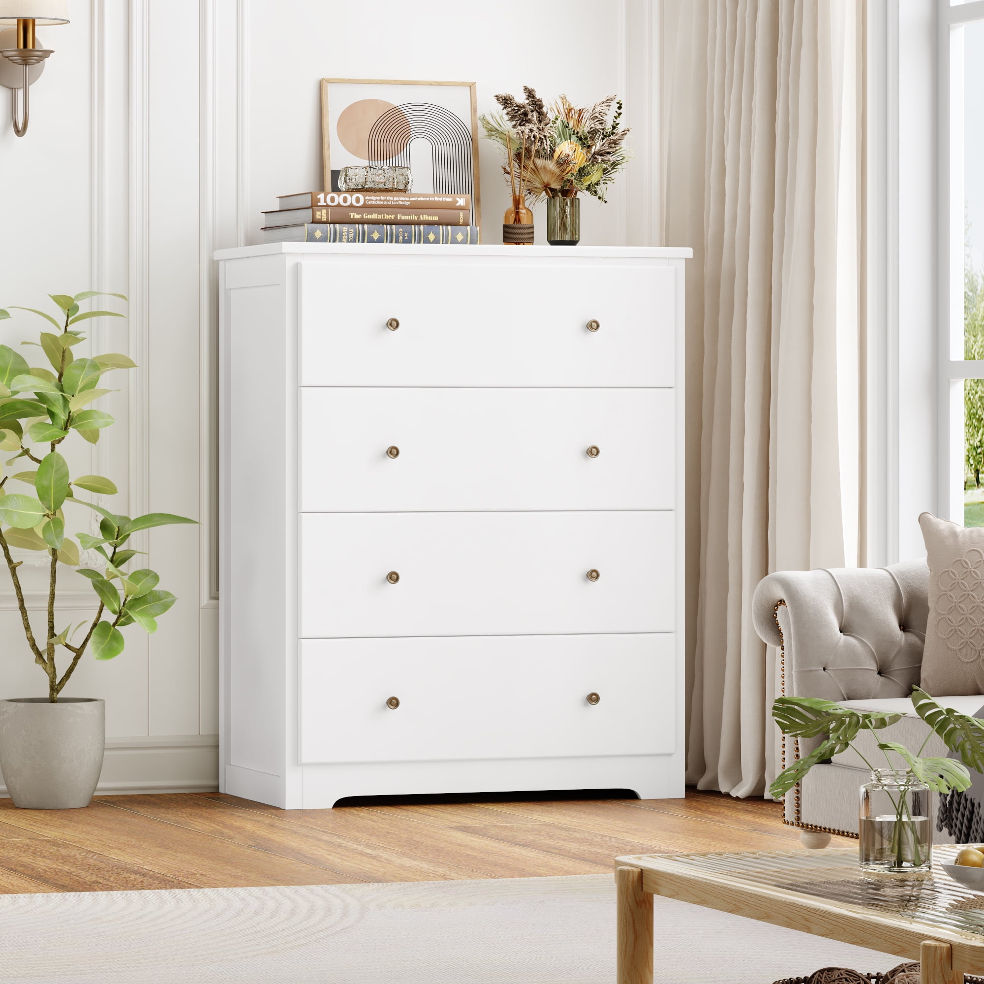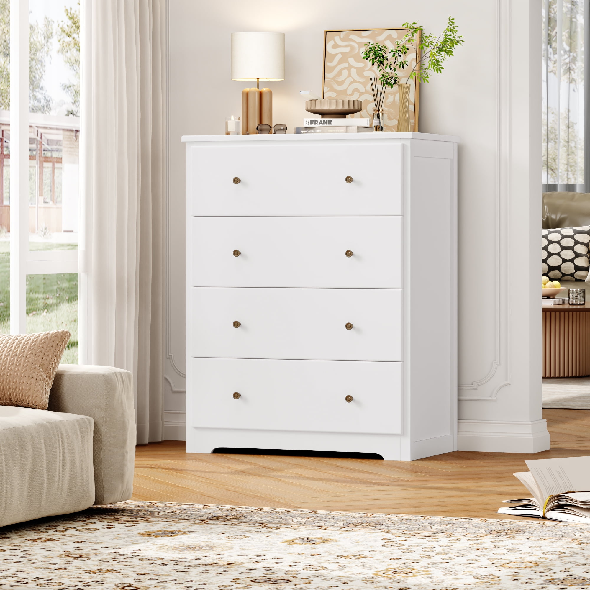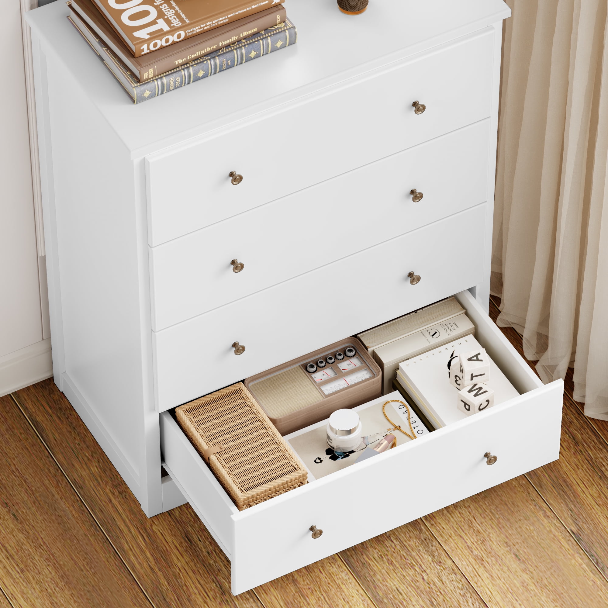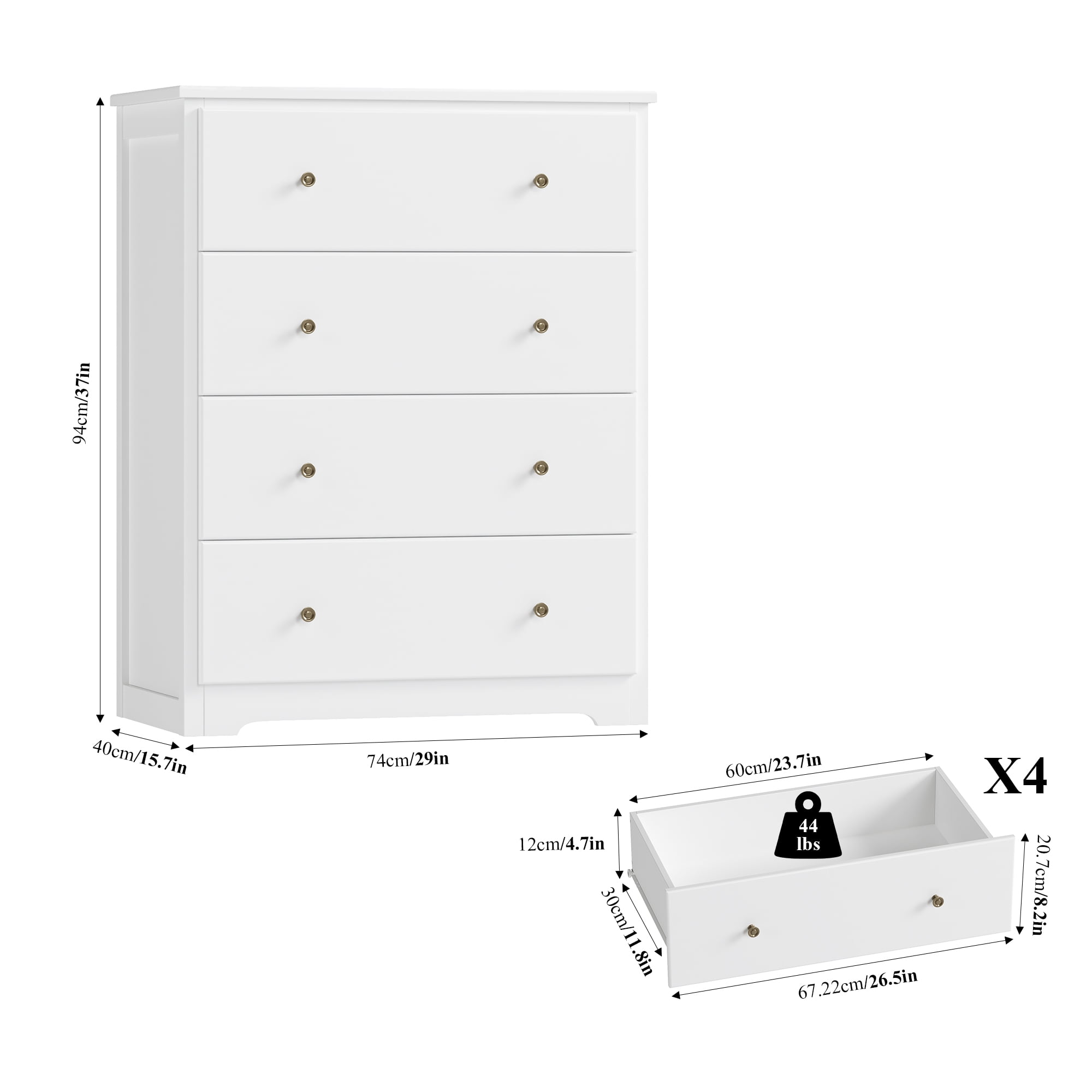 Features Chest of 4 Large Drawers – Large storage space. Modern White Finish Dresser – Fashion home decoration. Sturdy and Durable – Large bearing capacity. Space-saving dresser for Bedroom. Anti-falling Design – Stable and safe. Easy to Assemble & 24/7 Customer Service – 1 adult can complete it easily in 30 mins. Specifications Color: White Material: MDF Drawer Glide Material: Metal Size: 29″ L x 15.7″ W x 37″ H Drawer Size: 24.6″ L x 11.8″ W x 5.5″ H Number of Drawers: 4 Package Contents 1 x White Dresser for Bedroom 1 x Assembly Kit 1 x Instructions