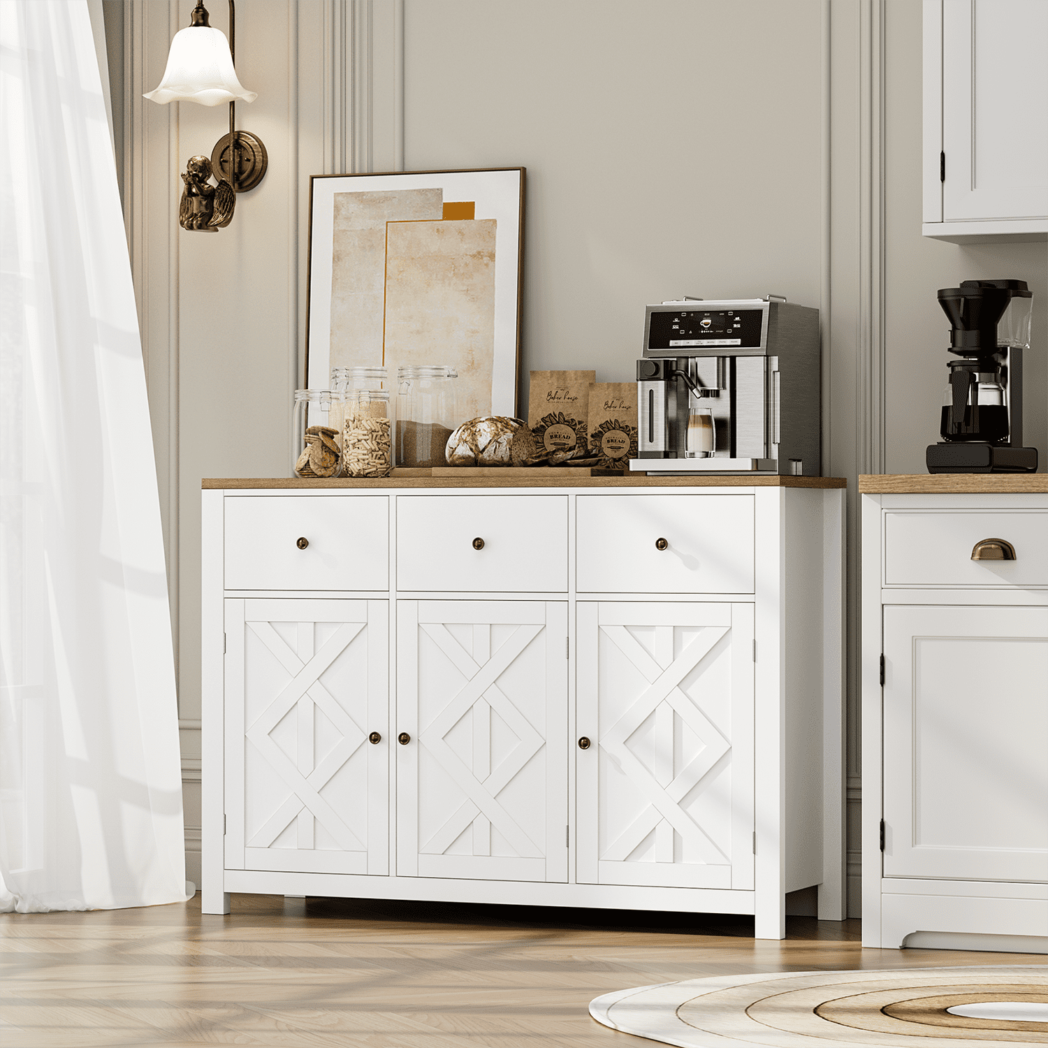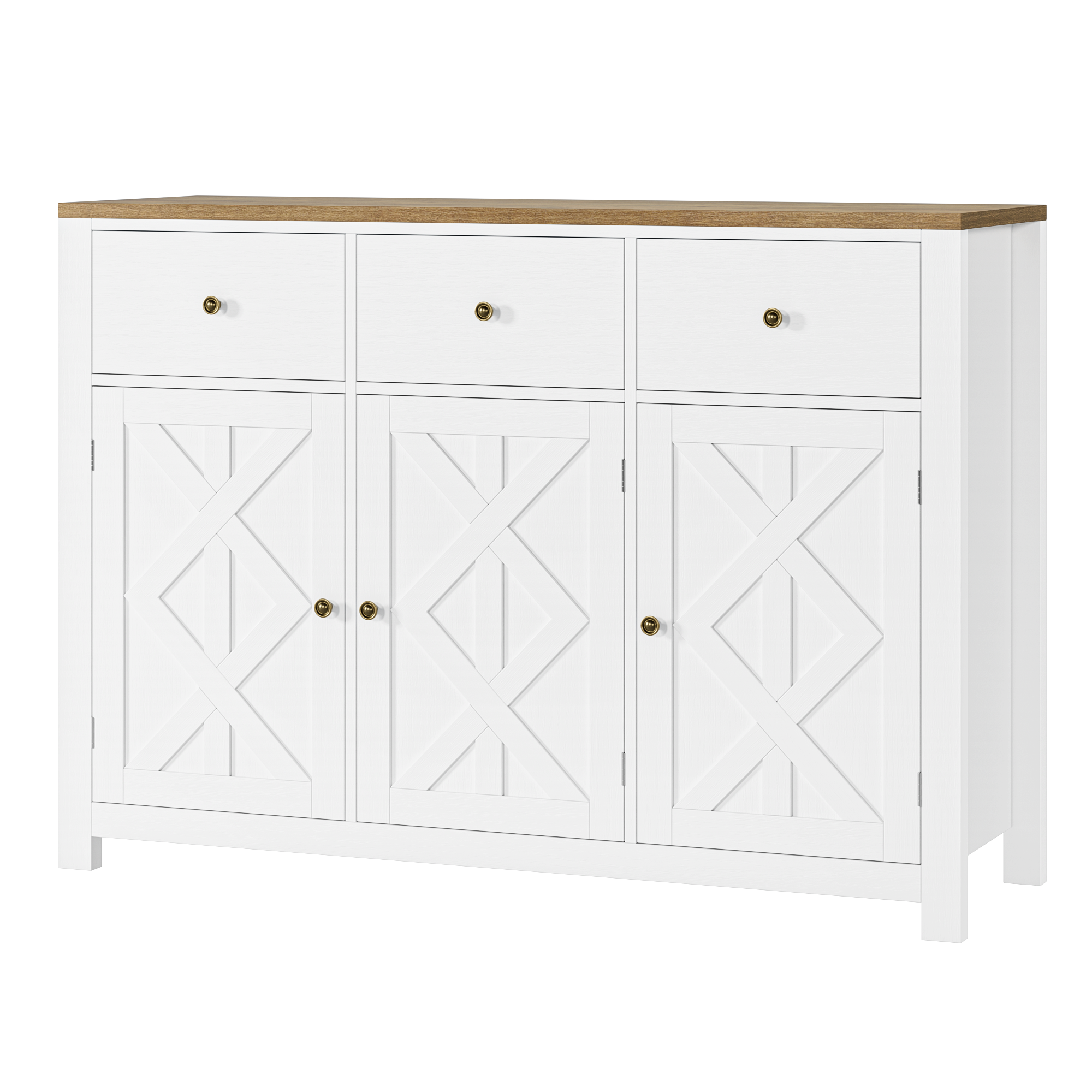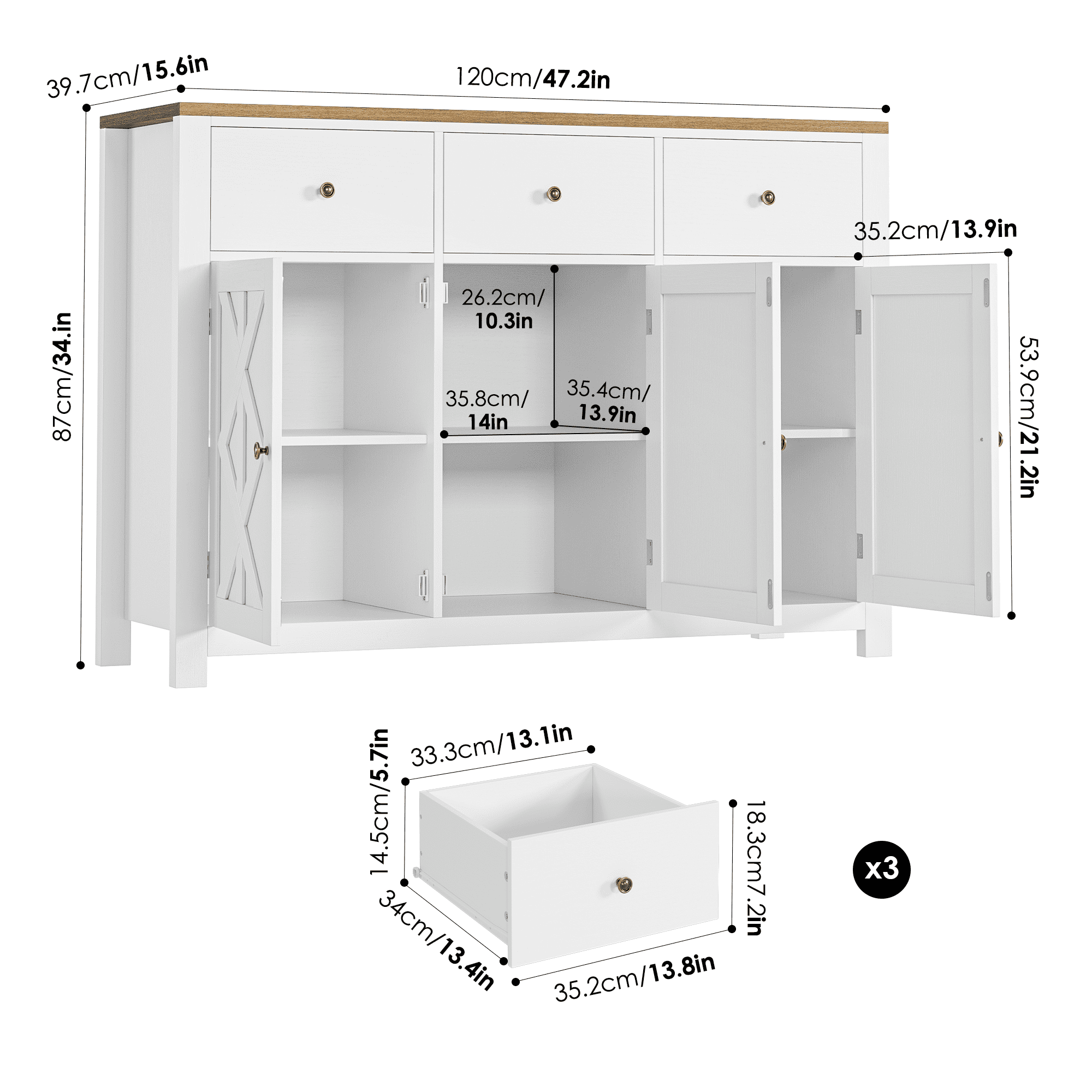 Feature 【3 Drawers and 6 Shelves】Spacious tabletop offers easy-to-access storage space to put handy things.The drawers and cabinets provide ample space to classify your wine bottles, seasoning cans, tableware, food, etc. 【Sturdy & Durable】This buffet cabinet is made of slightly denser and stronger MDF material for better quality, which is stronger than conventional particleboard. The design shape of the base increases stability, the cabinet is not easy to deform, scratch-proof, moisture-proof. 【Waterproof & Easy to Clean】The spacious sideboards buffets have a smooth waterproof top in a dark oak color, which is not only great to the touch, but also easy to clean. 【Use in Various Places】Complement your kitchen or dining room with this sideboard, use the top surface as a practical space for storing cookbooks or style artwork and flowers to brighten your home. It could also be used as a console table for your living room or a TV stand. 【Easy to Assemble】Everything needed for assembly comes collected in a package sent to you. This buffet sideboard could be easily assembled in less than an hour by 2 adult with the detailed instructions. 【24/7 Customer Service】 We provide quality customer support, if you have any questions, please email us and we will reply within 24 hours. Specification Color: White Overall Size: 34” H x 15.6” D x 47.2” L Main Material: Manufactured Wood Number of Drawers: 3 Number of Doors: 3 Tipover Restraint Device Included: Yes Assembly Required: Yes Packaging Includes 1 x Kitchen Sideboard 1 x Assembly Kit 1 x Instructions