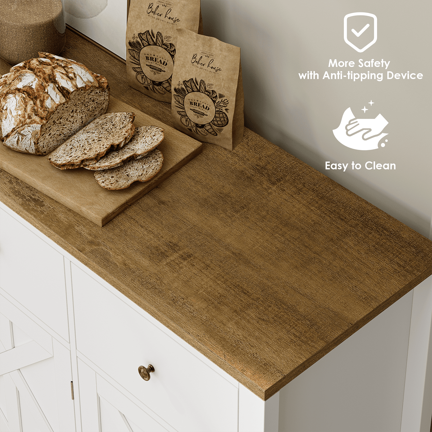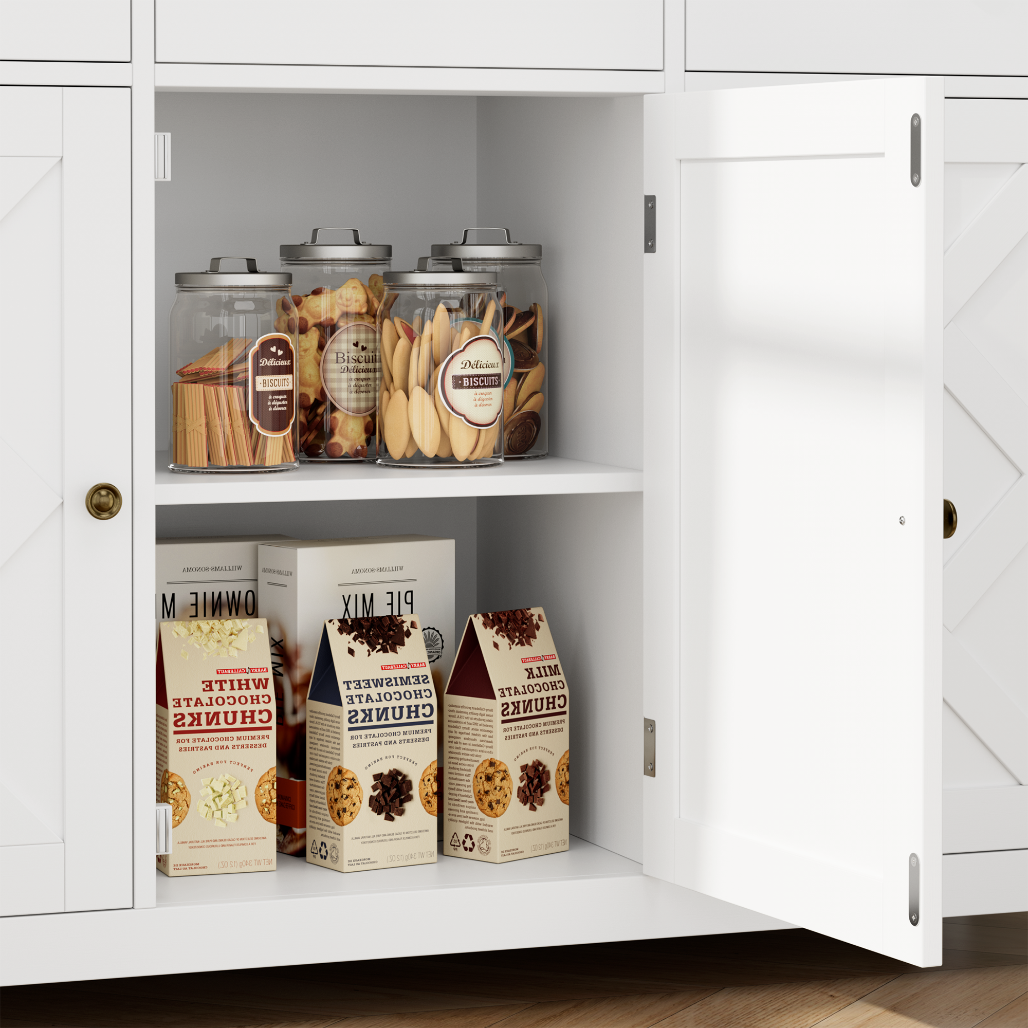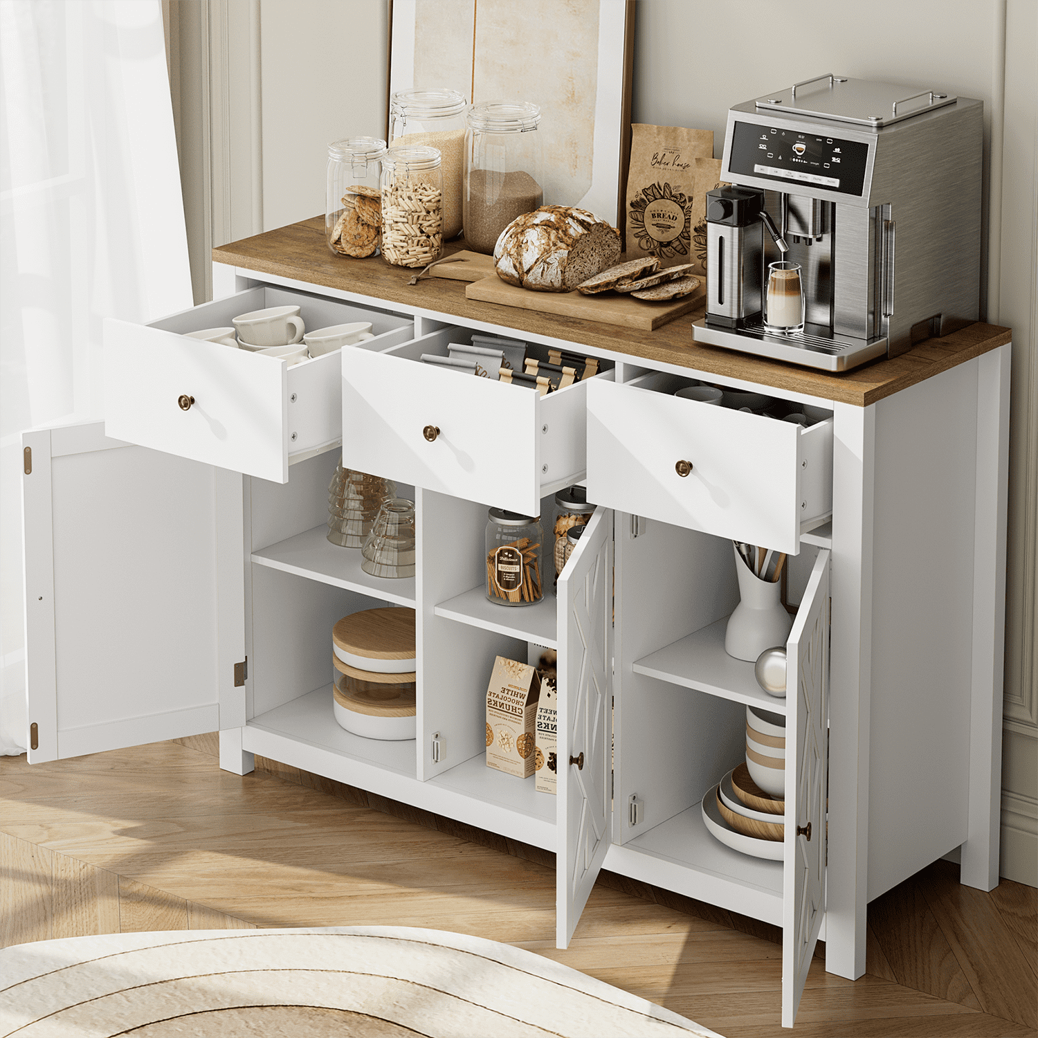Feature 【3 Drawers and 6 Shelves】Spacious tabletop offers easy-to-access storage space to put handy things.The drawers and cabinets provide ample space to classify your wine bottles, seasoning cans, tableware, food, etc. 【Sturdy & Durable】This buffet cabinet is made of slightly denser and stronger MDF material for better quality, which is stronger than conventional particleboard. The design shape of the base increases stability, the cabinet is not easy to deform, scratch-proof, moisture-proof. 【Waterproof & Easy to Clean】The spacious sideboards buffets have a smooth waterproof top in a dark oak color, which is not only great to the touch, but also easy to clean. 【Use in Various Places】Complement your kitchen or dining room with this sideboard, use the top surface as a practical space for storing cookbooks or style artwork and flowers to brighten your home. It could also be used as a console table for your living room or a TV stand. 【Easy to Assemble】Everything needed for assembly comes collected in a package sent to you. This buffet sideboard could be easily assembled in less than an hour by 2 adult with the detailed instructions. 【24/7 Customer Service】 We provide quality customer support, if you have any questions, please email us and we will reply within 24 hours. Specification Color: White Overall Size: 34” H x 15.6” D x 47.2” L Main Material: Manufactured Wood Number of Drawers: 3 Number of Doors: 3 Tipover Restraint Device Included: Yes Assembly Required: Yes Packaging Includes 1 x Kitchen Sideboard 1 x Assembly Kit 1 x Instructions