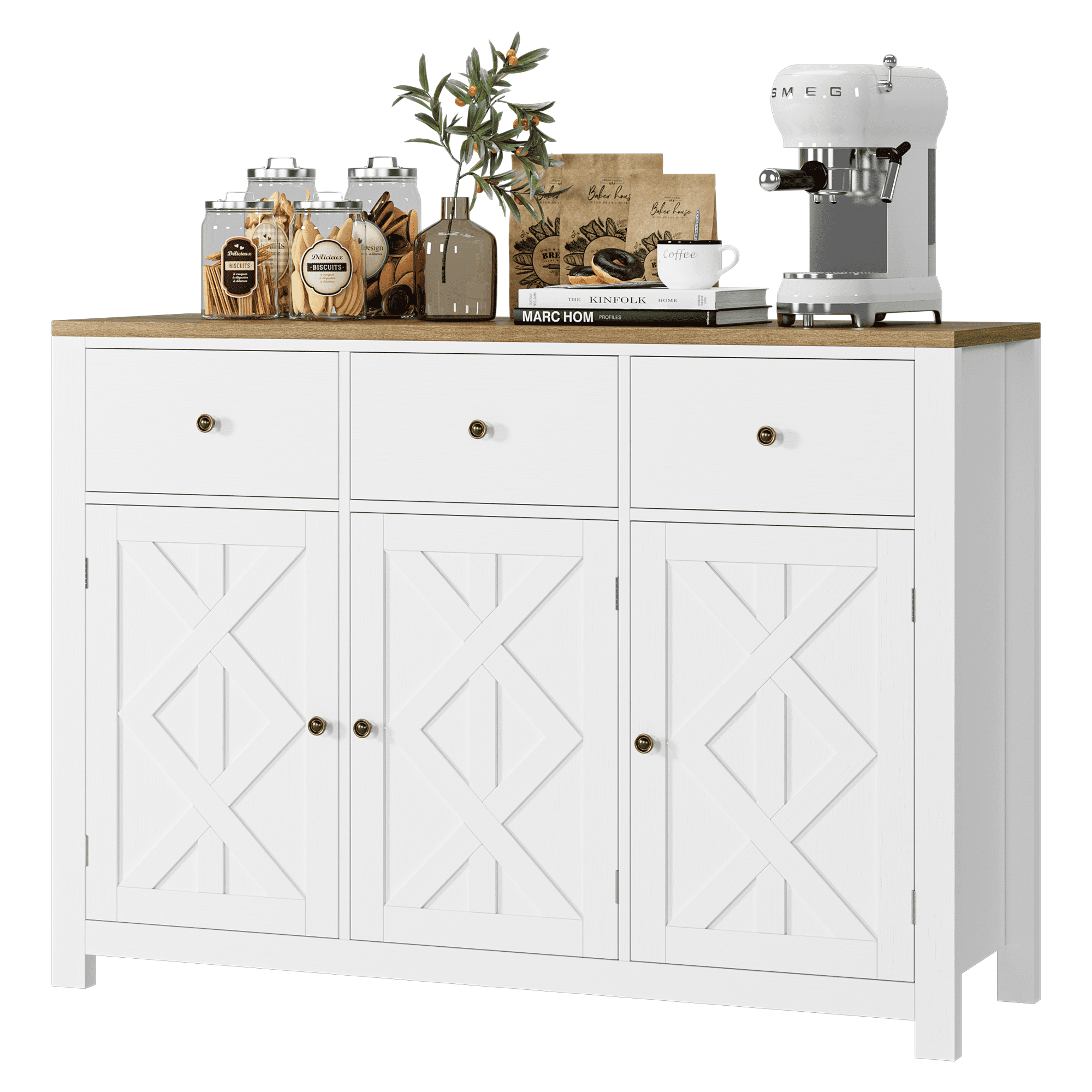 Homfa Farmhouse 3 Drawers Kitchen Sideboard, Wood Storage Cabinet with Adjustable Shelves for Dinning Room, White