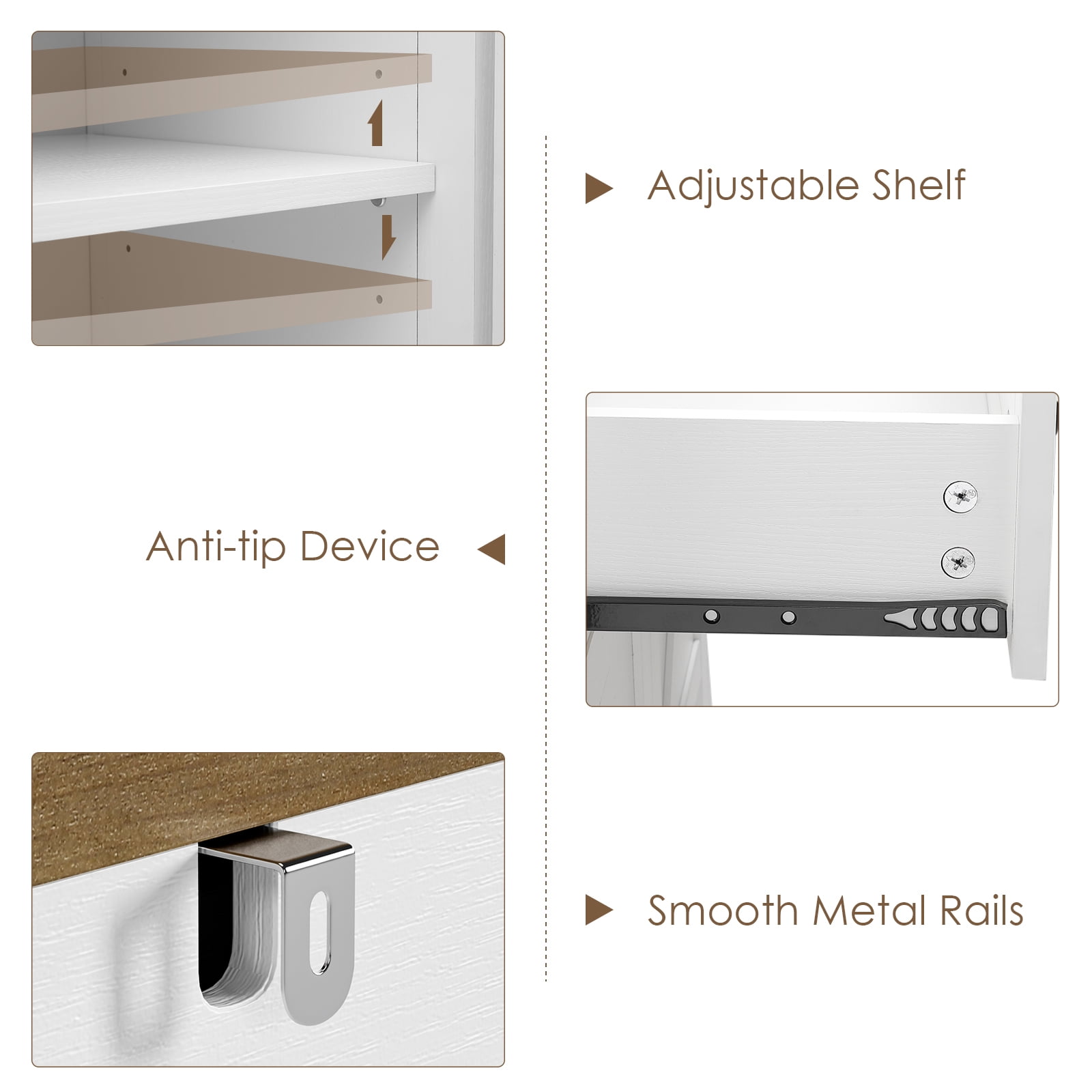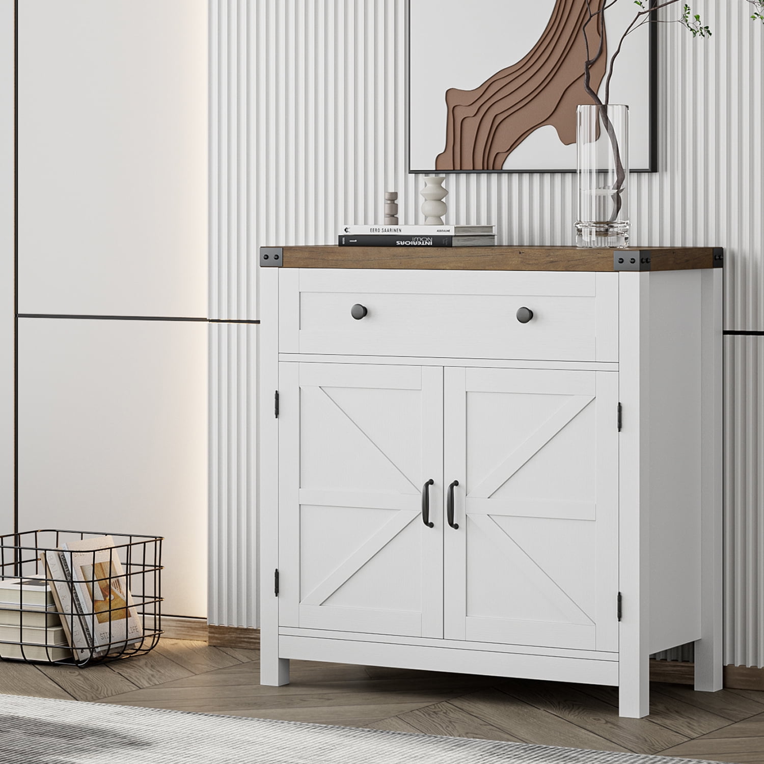 Features 【Adjustable Internal Shelf】 Internal shelves can be adjusted up and down 2.36 in, the adjustable interior shelves allow you to customize the buffer cabinet storage space. You can adjust the height of the shelves to accommodate larger items. 【Farmhouse Barn Style】With classic black round handles and barn style design, this storage cabinet is aesthetically pleasing and can complement the decor of any room. 【Versatile Use】Our sideboard buffet cabinet used as a floor cabinet in the bathroom, a coffee bar cabinet in the dining room, a decorative cabinet in the hallway entrance; it can even be used as a console in the living room and more! 【Sturdy and Durable】Wooden cabinets tabletop supports up to 150 lbs, making them ideal for long-term storage needs. They are also resistant to scratches, dents and other forms of damage. 【Ideal for Small Spaces】With its compact construction, this sideboard is suitable for apartments, dormitories and other places where space is limited. You can also use them in combination. 【Easy to Assemble】Everything needed for assembly is included in the package. This Sideboard cabinet could be easily assembled in 1 hour follow the instructions. 【24/7 Customer Service】We provide quality customer support, if you have any questions, please email us and we will reply within 24 hours. Specifications Product Type: Accent cabinet Color: White Material: Wood Size: 29.9*15.6*33.3 in Item Weight: 70.37 lb Weight Capacity: 320 lb Shelf Weight Capacity: 62 lb. Adjustable height: 2.36 in Mounting Type: Floor Mount Assembly Required: Yes Package Contents 1 x Buffer Sideboard Cabinet 1 x Accessory 1 x Instruction