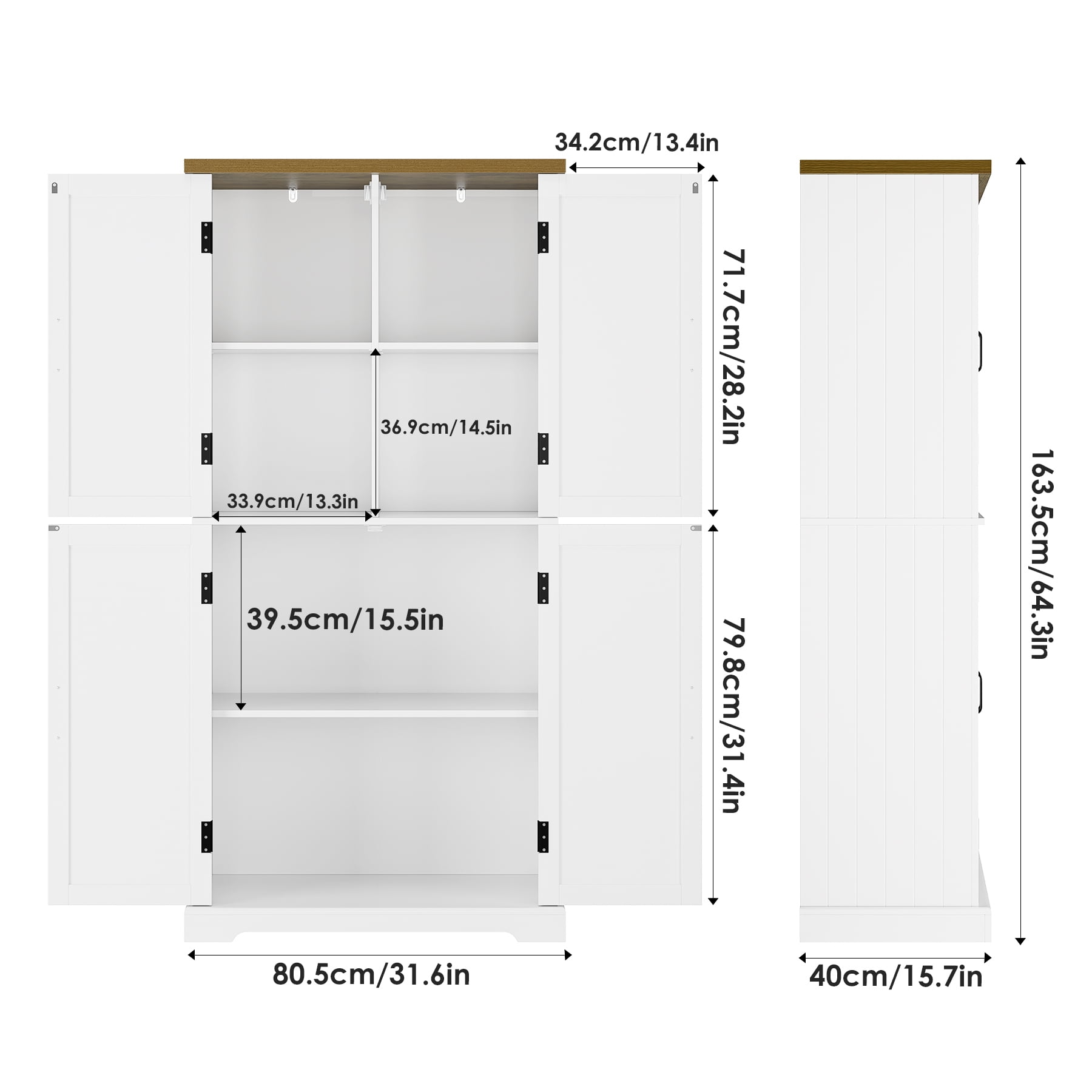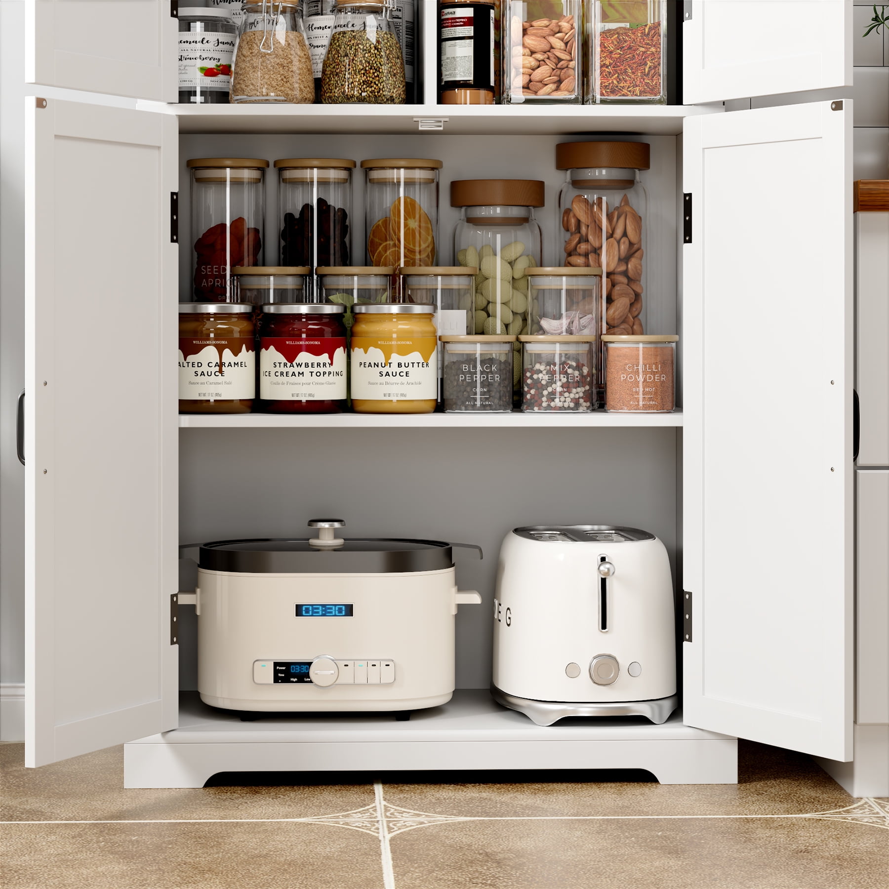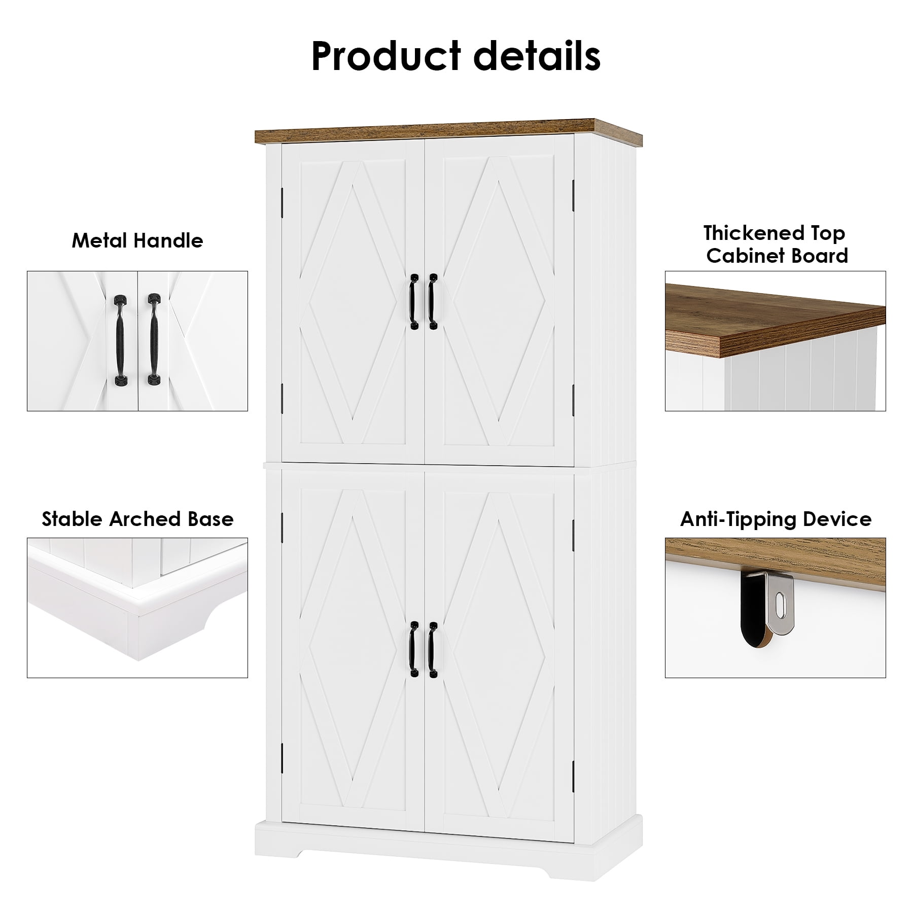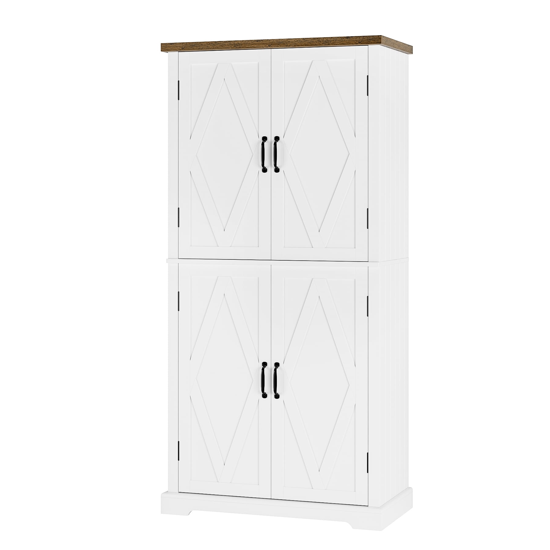 Features: 【Practical Ample Pantry Storage Space】4 cubes and 2 shelves interior compartments, this homfa kitchen pantry storage cabinet will provide as much space as possible for a wide range of storage needs. 【Super Flexible Smart Storage Arrangement】4 cubes interior upper this pantry storage cabinet have 2 removable boards, which not only could be adjusted to 3 height levels, but also removed to get 2 tall storage space. 【Modern Farmhouse White Kitchen Pantry Style】Pantry storage cabinet doors featuring farmhouse style pattern brings a fresh and clean solution to your daily storage in an elegant way. 【Multipurpose Pantry Cabinet】Our homfa white kitchen pantry cabinet in a proper size can play your perfect storage assistant role in your kitchen, entryway, living room, dining room, office, etc. 【Sturdy Structure + Anti-Toppling Device】With thickened top board and sturdy pantry cabinet base, especially equipped with anti-toppling device, this homfa white pantry cabinets for kitchen storage will give you enough convenience and safety. 【Easy Assembly】Everything needed for assembly comes collected in a package sent to you. The Homfa kitchen pantry cabinet could be easily assembled in less than an hour by 2 people with the instructions. 【24/7 Customer Service】We provide quality customer support, if you have any questions with this homfa kitchen furniture, please email us and we will reply within 24 hours. Specifications: Primary Material: Manufactured Wood Finish Color: White Overall Size: 64.37” H X 31.69” W X 15.74” D Shelves Included: Yes Number of Shelves: 4 + 2 Doors Included: Yes Overall Product Weight: 99.2 lb. Weight Capacity: 300 lb. Tipover Restraint Device Included: Yes Hardware Finish: Black Packaging Includes: 1 x Pantry Storage Cabinet 1 x Assembly Kit 1 x Instructions