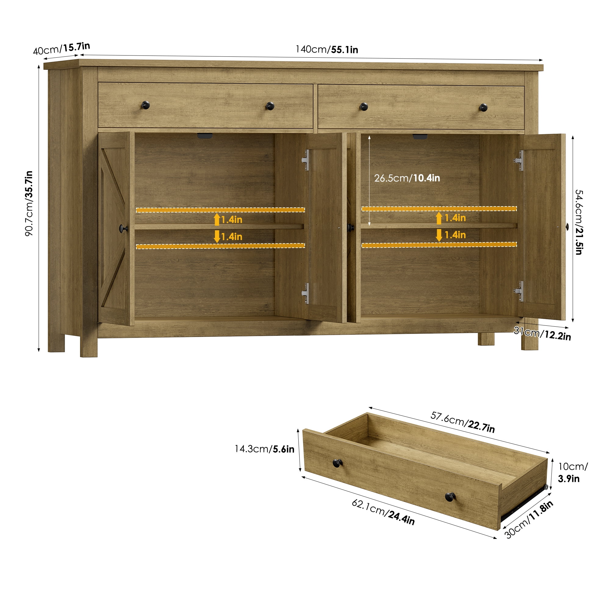 Features 【2 Drawers and 4 Shelves】The spacious 55” wide tabletop provides additional display and placement area, 2 deep drawers and 4 storage shelves in the cabinet provide ample storage for your kitchen dishes and food, coffee maker, pots and pans. 【More Sturdy & Durable】This kitchen buffet cabinet is made of denser and stronger MDF material that is more durable than traditional particle board. Our cabinet is not easy to deform, scratch-proof, moisture-proof. 【Easy to Clean】The sideboards buffets have a smooth waterproof top, which is not only great to the touch, but also easy to clean. 【Adjustable Shelves】Homfa buffet cabinet shelves can be locked in three fixed levels, which greatly allows you to freely change the space layout according to the size of the items. Or you can remove the shelves to create more storage space. 【Easy to Assemble】Homfa kitchen sideboard comes with all needed instructions and hardware, easily assembled by 2 adults in less than 1 hour. 【24/7 Customer Service】 We provide quality customer support, if you have any questions with Homfa sideboard, please email us and we will reply within 24 hours. Specification Color: Brown Main Material: Manufactured Wood Overall Size: 15.7” L x 55.1” W x 35.7” H Number of Drawers: 2 Number of Shelves: 4 Tipover Restraint Device Included: Yes Assembly Required: Yes Package Contents: 1 x Sideboard Cabinet 1 x Assembly Kit 1 x Instructions