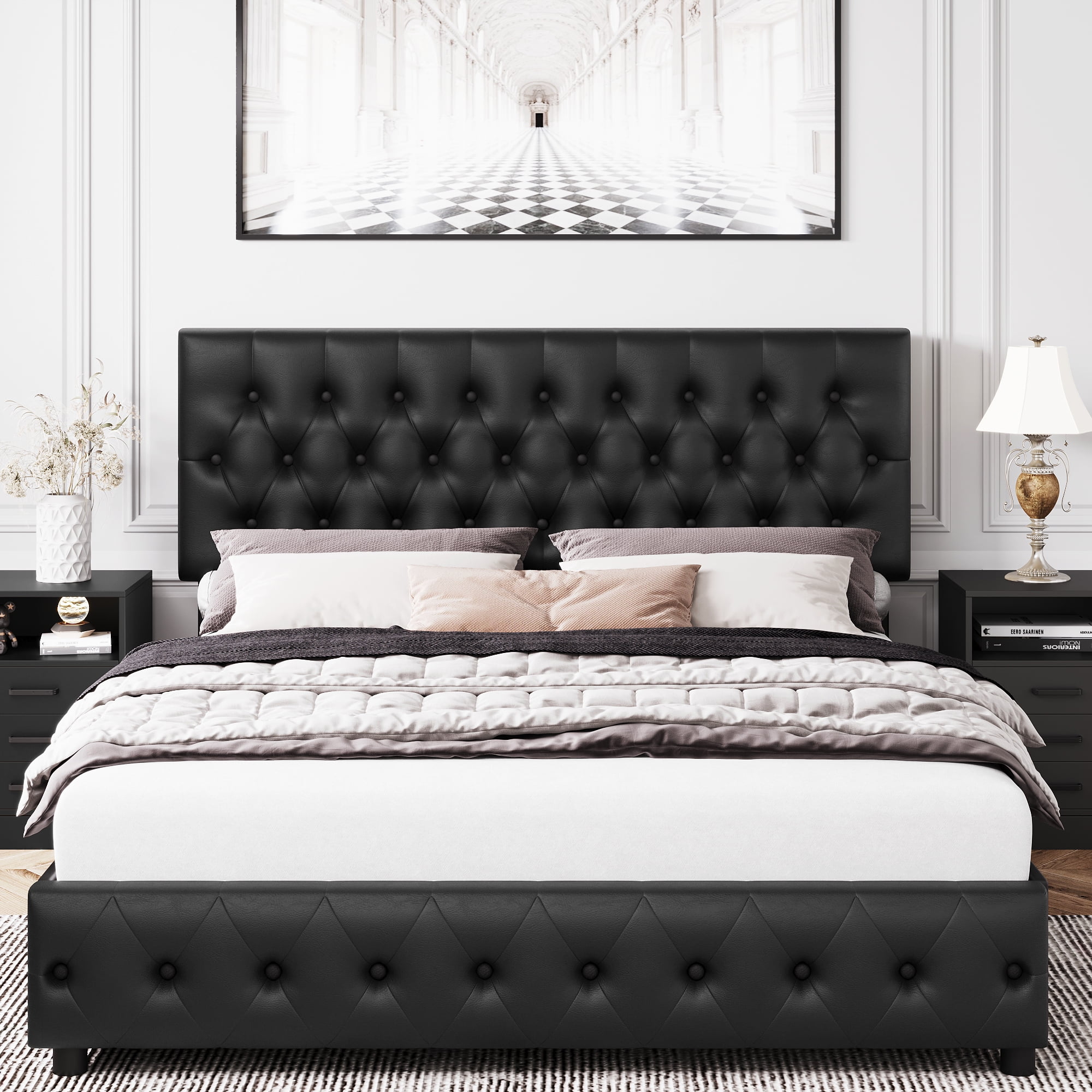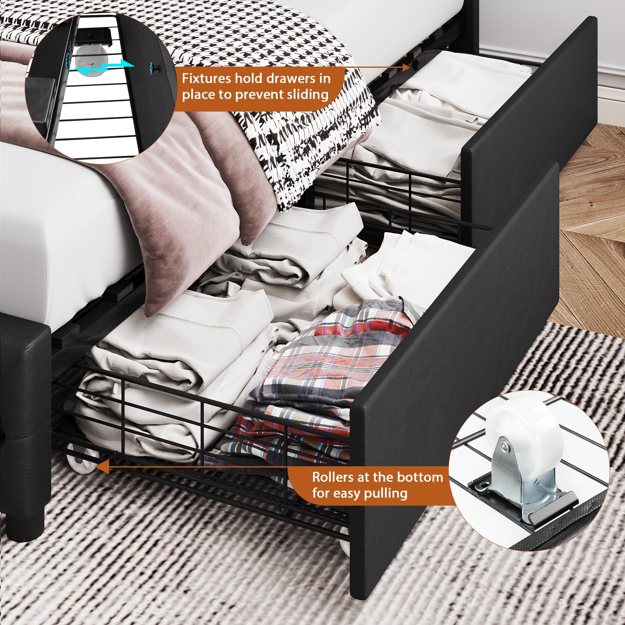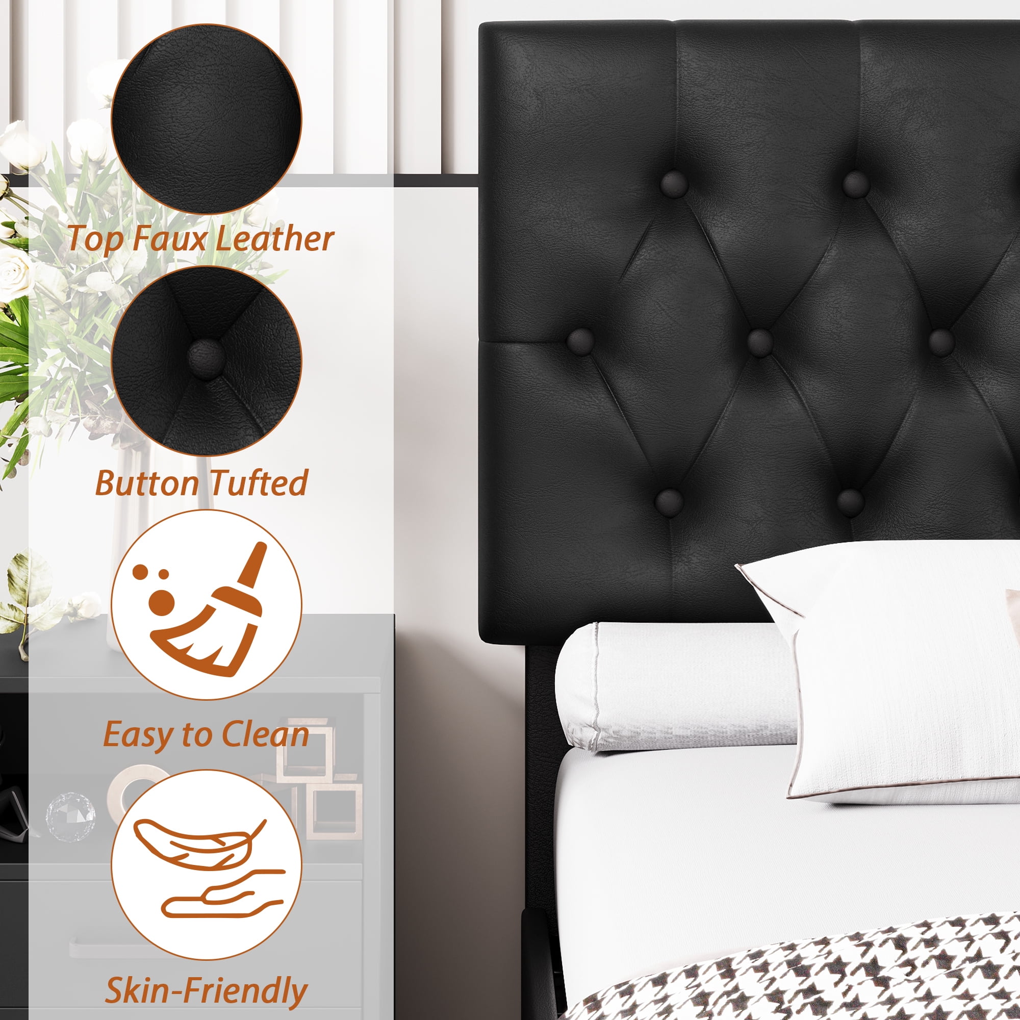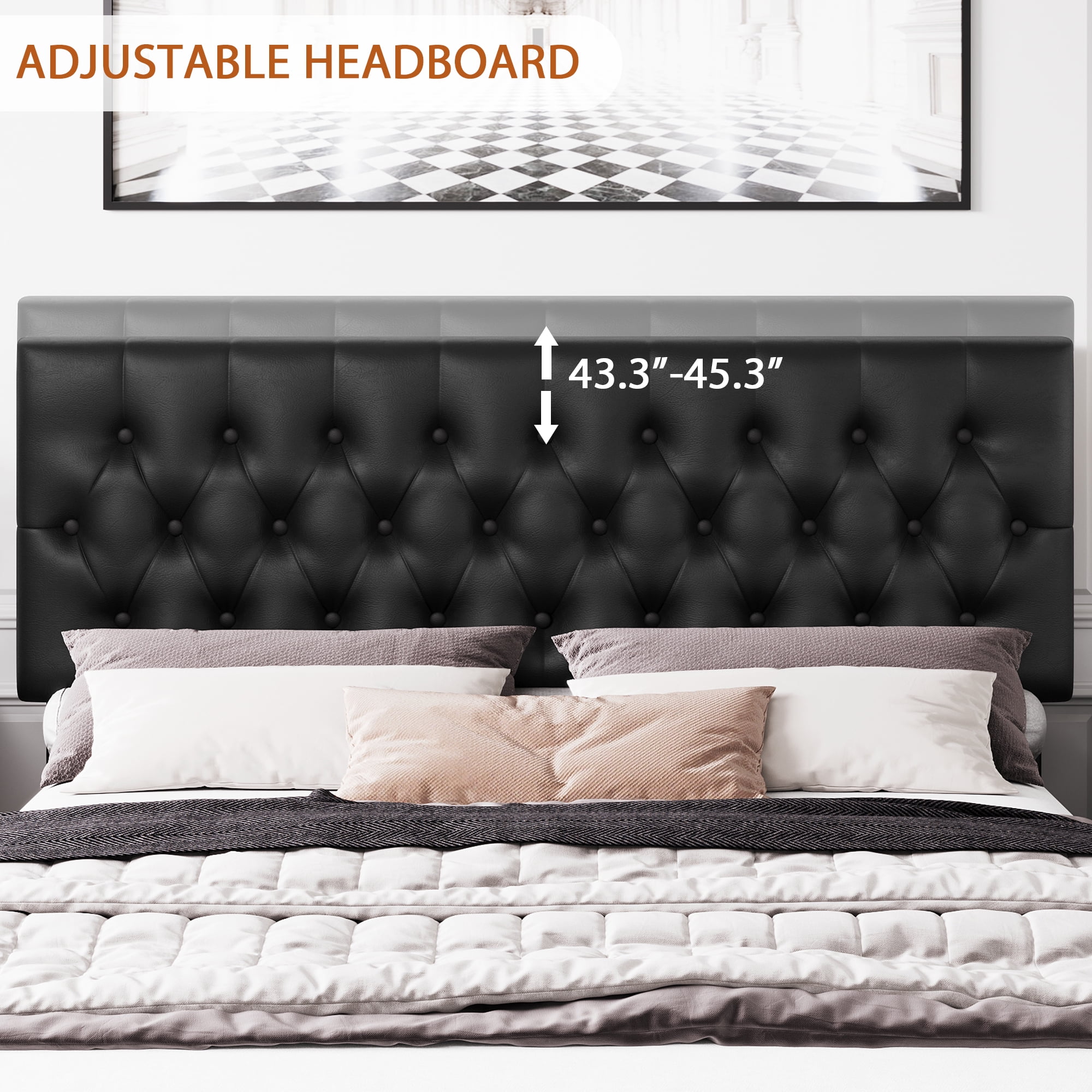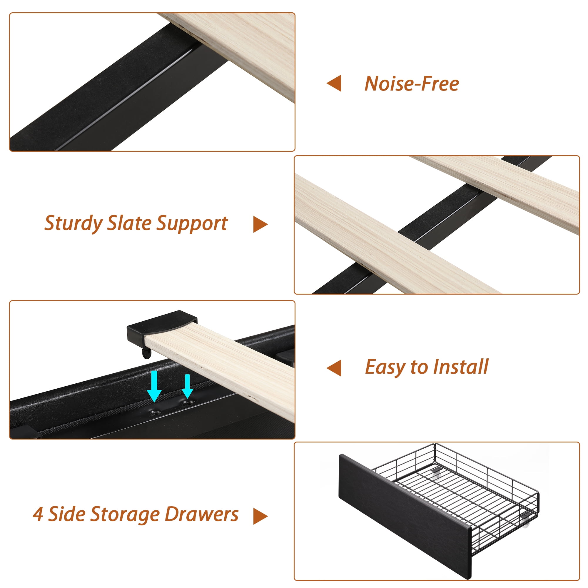 Features 【4 Fixable Storage Drawers】The platform bed frame with 4 steel drawers underneath, offers a perfect storage space. Each drawer has a fixed screw to prevent drawer from sliding back and forth under the bed at will. The weight capacity of the drawers is 22 lbs. 【PU Leather Soft Adjustable Headboard】The headboard is made of PU leather, can be adjusted for 10-12 inches mattress. The resilience brought by the foam fits the body and can effectively reduce the pain of daily bumps,giving you a sense of care and security. 【Noise-free】The whole full bed frame is installed with mute stickers to reduces noise from friction, provide you with a quiet sleeping environment. 【No Box Spring Need】Don’t need a box spring, just add your mattress on after easy assembly and you’ll be all set. 【Easy to Assemble】 With the help of all mounting hardware and detailed instructions, 2 people can complete it easily in 1 hours. Quality customer service saves you from the worry of lost and damaged parts. 【24/7 Customer Service】 We provide quality customer support, if you have any questions, please email us and we will reply within 24 hours. Specifications Frame&Slat Material: Manufactured Wood Manufactured Wood Type: Plywood/Laminate Board Upholstery Material: Faux leather Number of Storage Drawers: 4 Color: PU Black Size: Full Dimensions: 76.8″ L x 56.7″ W x 44.5-50″ H Weight Capacity: 750 lbs Weight Capacity of drawers: 22 lbs Package Contents 1 x Upholstered Bed Frame with Storage 1 x Installation Tool 1 x Accessory Bag 1 x Instructions 4 x Drawers Note: 1. Mattress sold separately. 2. Everything you need for assembly comes zipped up in a compartment behind the headboard for convenience. More great storage bed frame could be found here below: Linen Fabric Adjustable Storage Bed Frame with 4 Drawers Curved Adjustable Storage Bed Frame with 4 Drawers