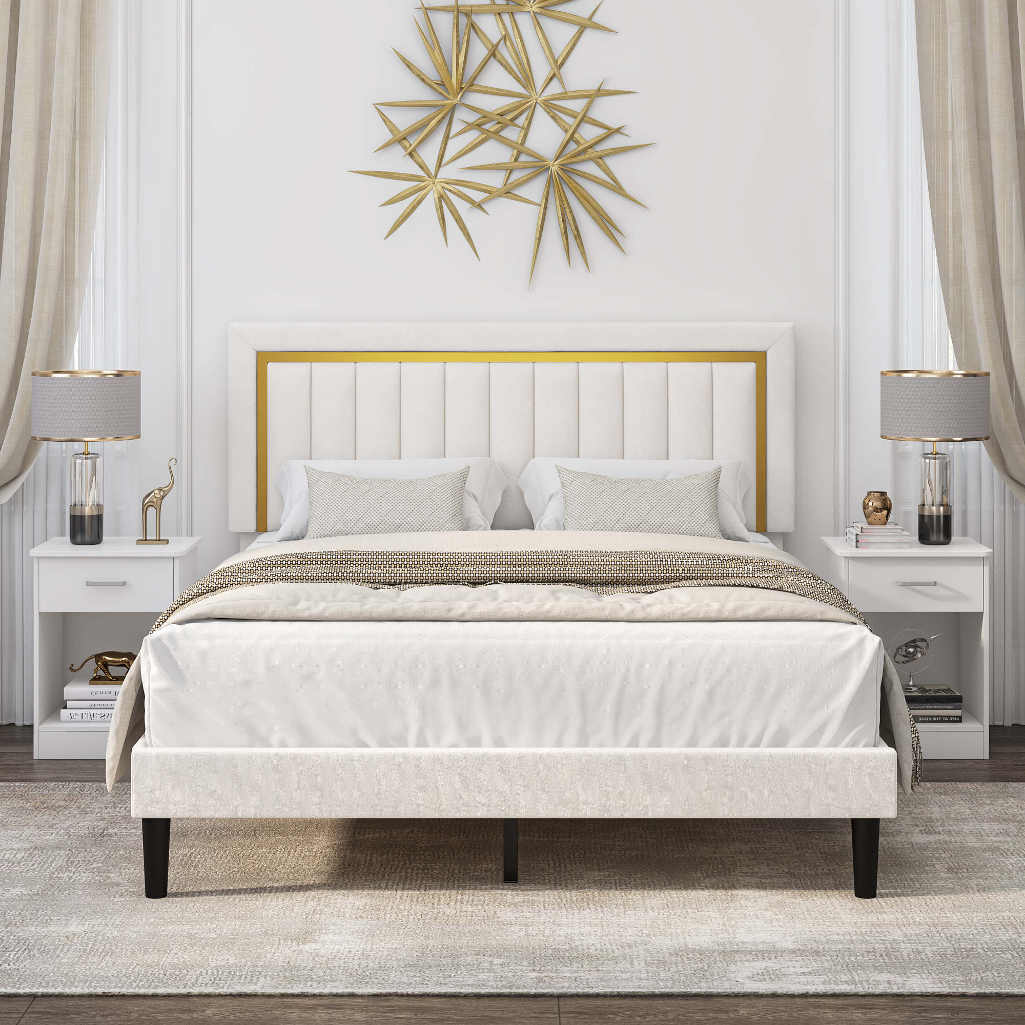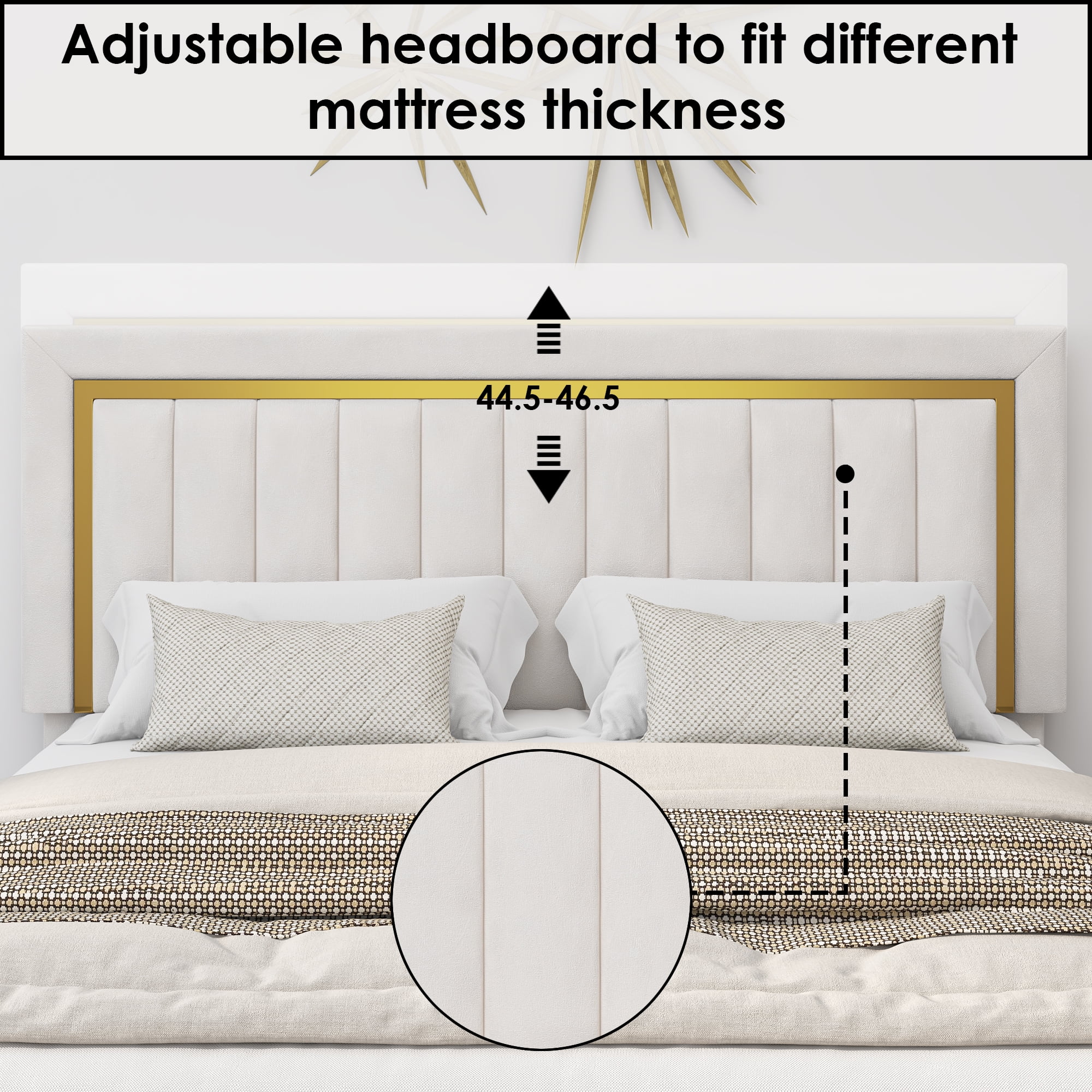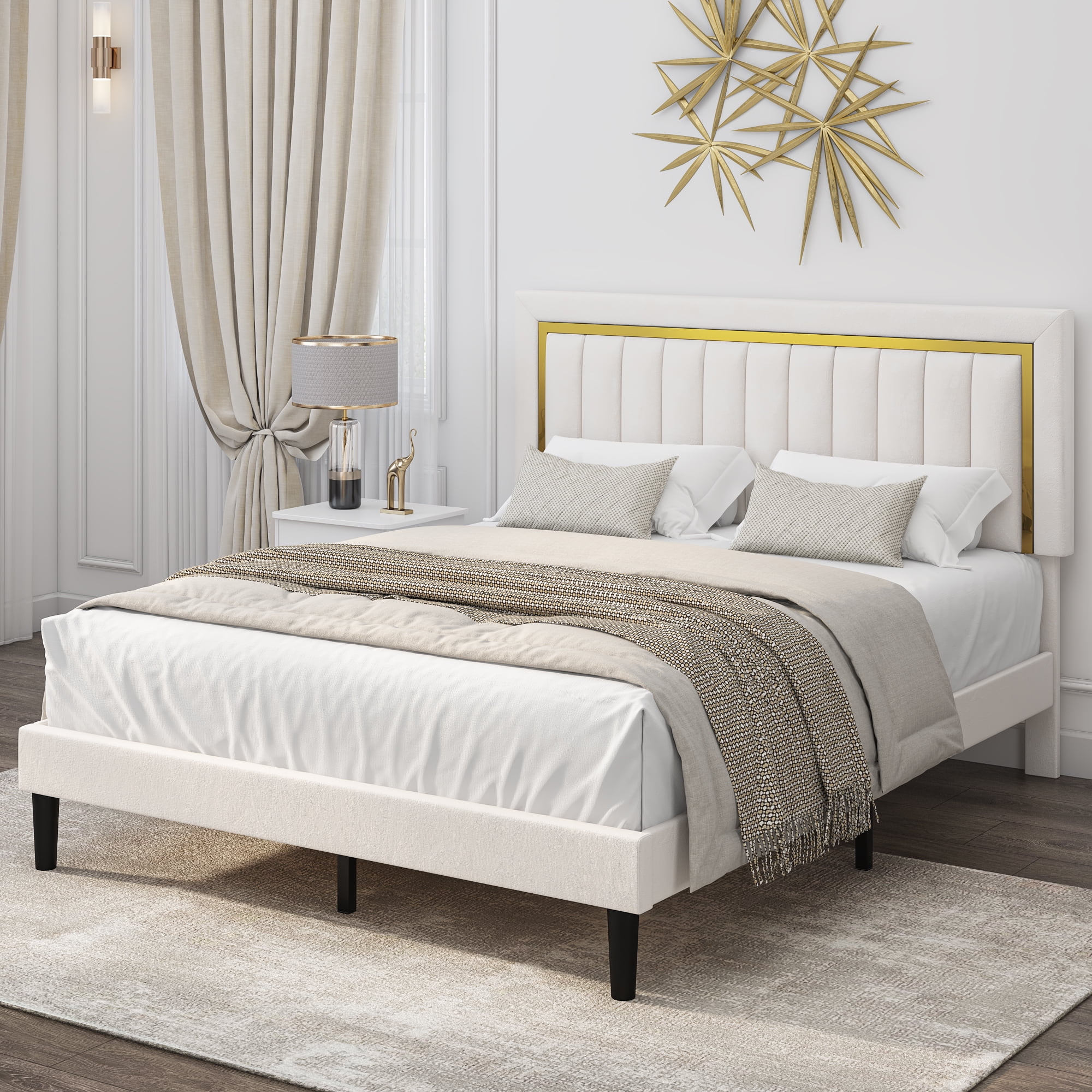 Features: 【Upholstered Velvet Bed】This upholstered bed uses top velvet fabric, filled with high-density sponge for a soft and comfortable touch, comfortable to lean against reading or watching TV in bed. 【Height Adjustable Headboard】The headboard is adjustable at 44.5-46.5 inch, allows you to use 10-12 inch mattresses. 【Gold Trim Decor】The headboard with golden frame really gives the bed frame a classic design and with elegance and sophistication in every detail. It is a unique decoration for your bedroom. 【750lb Strong Support】This platform bed frame adopts a steel frame structure with a wooden slat system to support the mattress, ensure the firmness and stability of the bed frame. upholstered platform bed easily supports up to 750 pounds. 【Easy to Install】The bed frame comes with detailed instruction, assembly tools and numbered parts. 2 adults can assemble it in 1 hour! 【24/7 Customer Service】We provide quality customer support, if you have any questions, please email us and we will reply within 24 hours. Specifications: Footboard Height – Top to Bottom:13” Overall Size:46.5” H x 79.5” W x 57.8” L Leg Height- Top to Bottom:7.5” Overall Product Weight:70.99 lb. Maximum Headboard Height:46.5” Minimum Headboard Height:44.5” Frame Material:Manufactured Wood Color: Beige Upholstered:Yes Upholstery Material:Polyester Blend;Velvet FoamTufted:Yes Upholstery Design:Fully Upholstered Box Spring Required:No Number of Slats Included:12 Slat Material:Manufactured Wood Package Contents: 1x Upholstered Bed 1x Accessory 1x Instruction