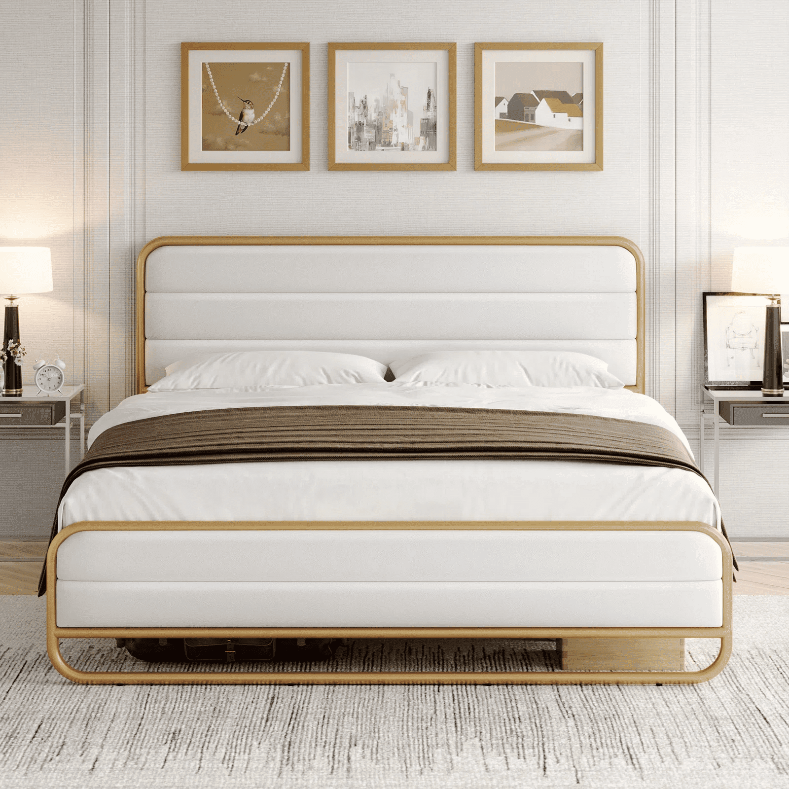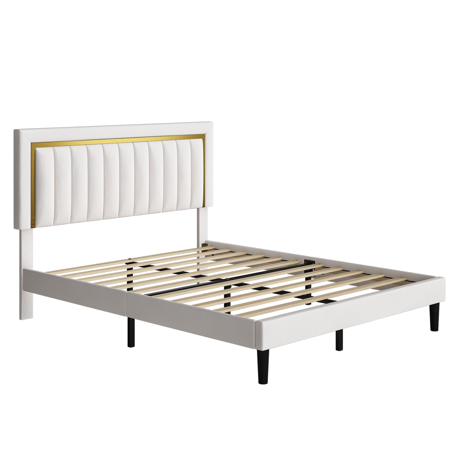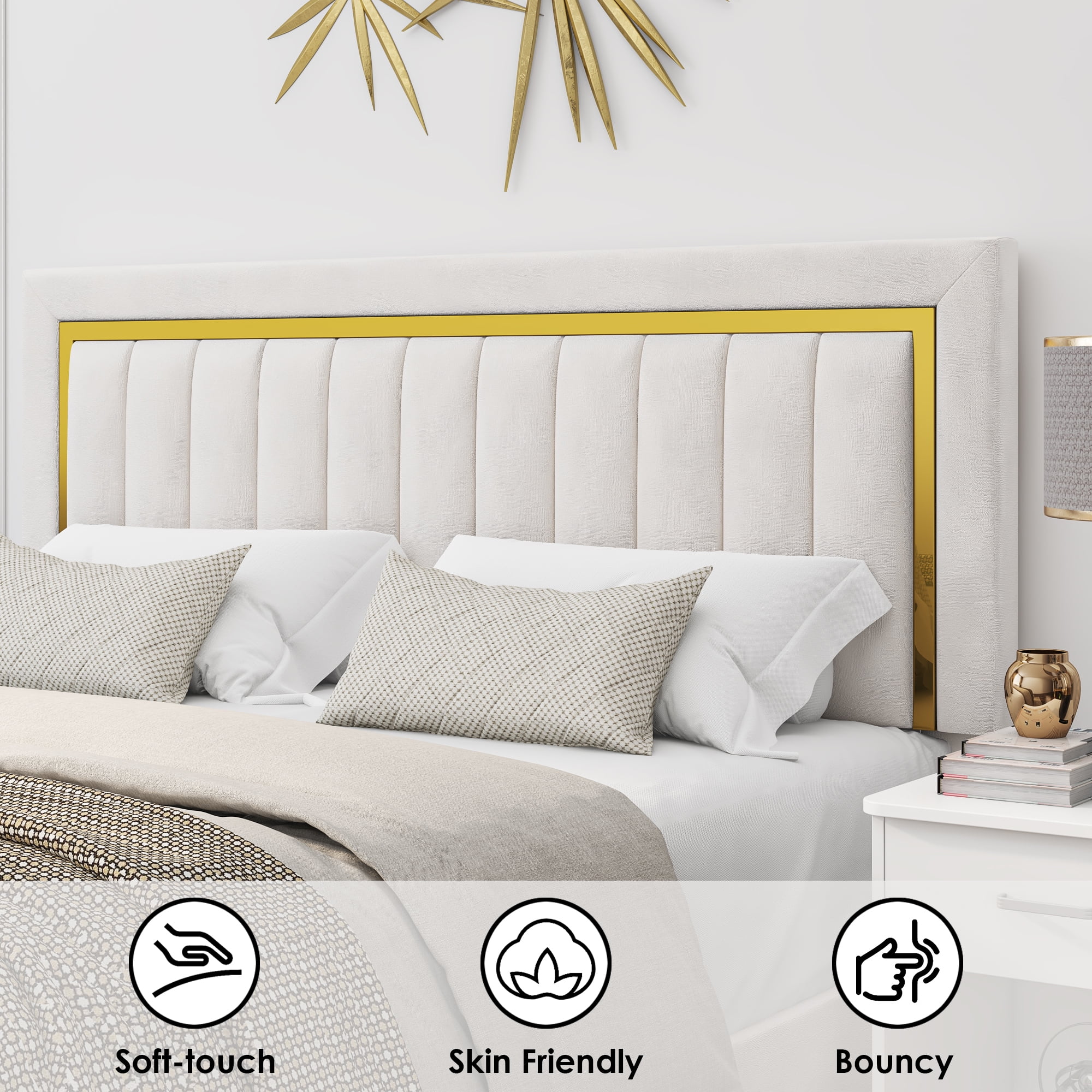 Homfa – Create a comfortable life! The entire surface of the bed frame is wrapped in soft and skin-friendly velvet fleece, this bed offers a comfortable experience. The upholstered sheets and facecloth headboard have thick padding so you can enjoy the comfort of lying in bed and reading. This well-crafted white and gold bed frame is the perfect combination of style and function. With a modern and elegant look that complements any color scheme, the classic design of this upholstered platform bed frame will bring a warm feeling to your bedroom or guest room.