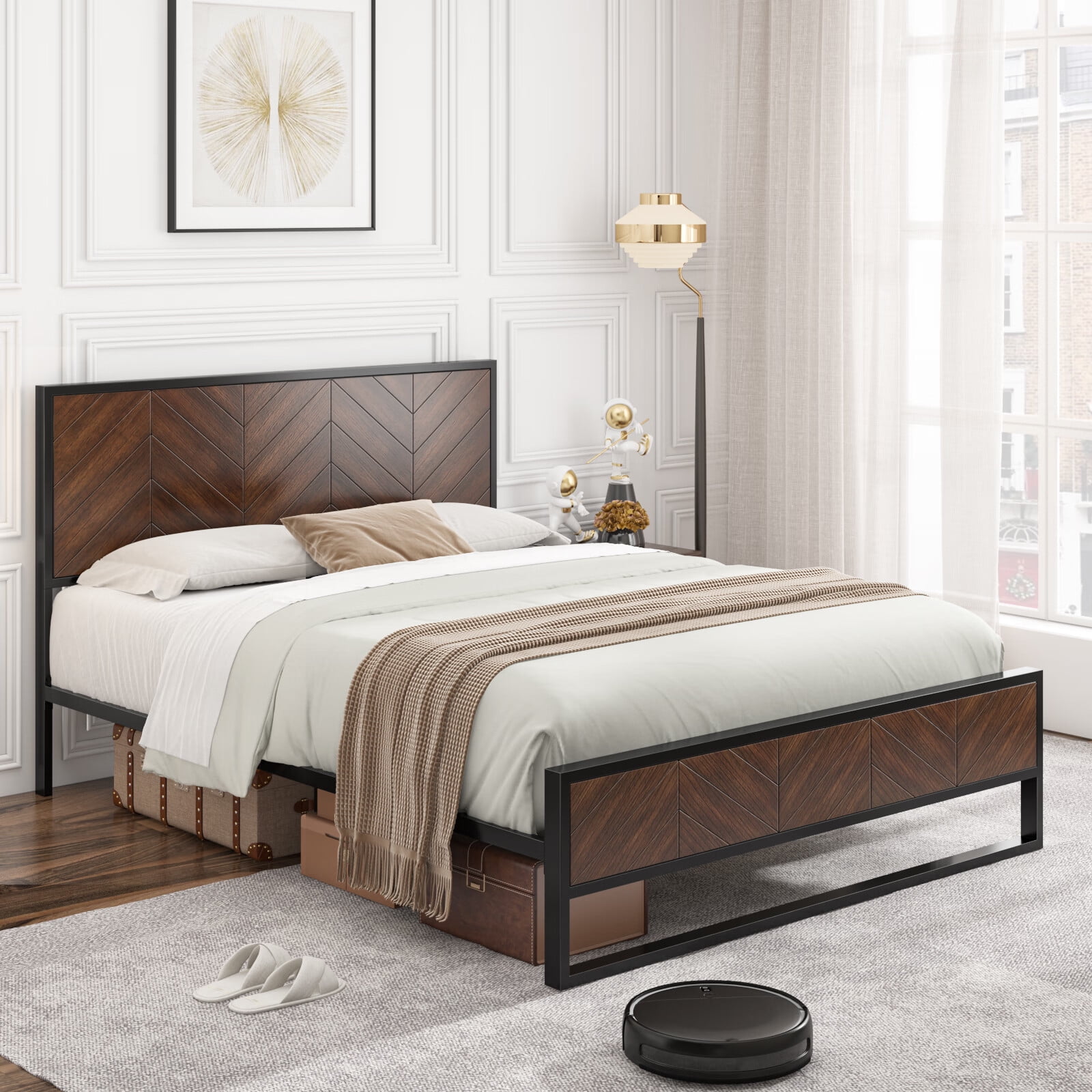 Homfa Full Size Bed Frame with 4 Storage Drawers, Industrial Wood and Metal Panel Headboard, Rustic Brown