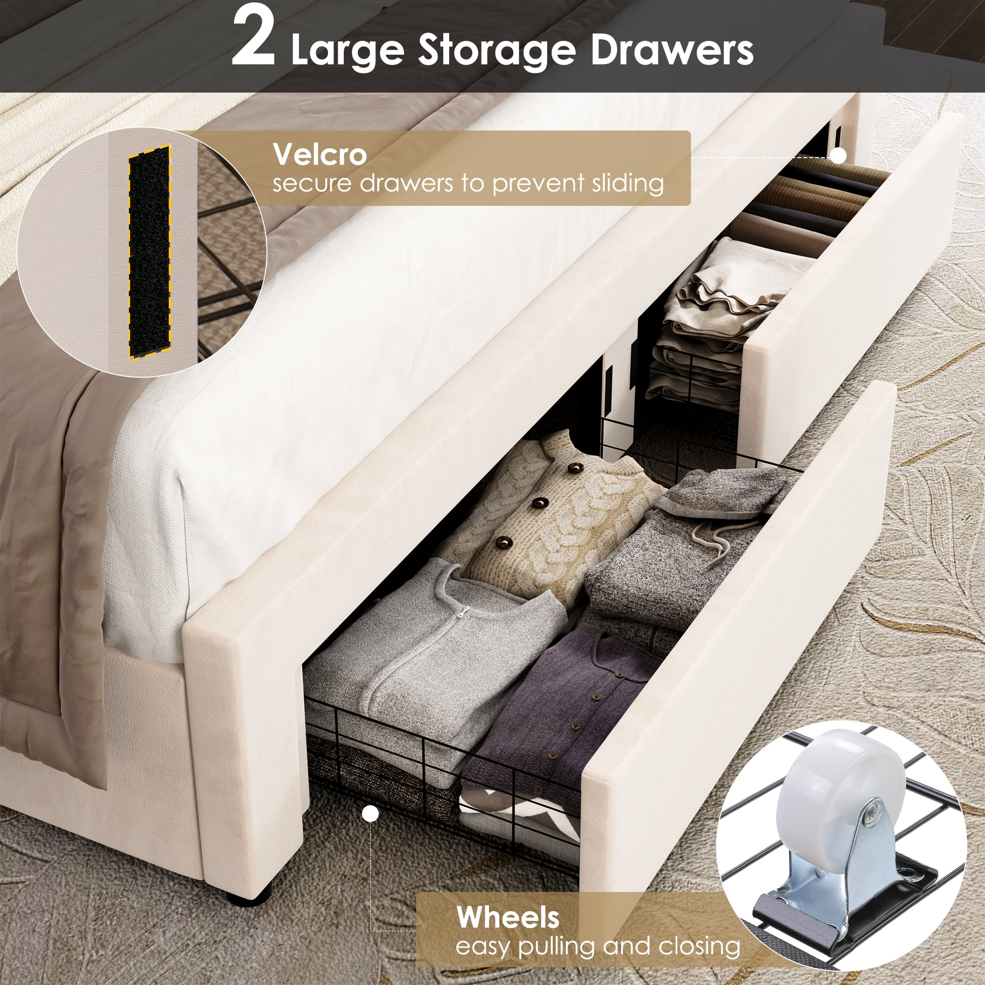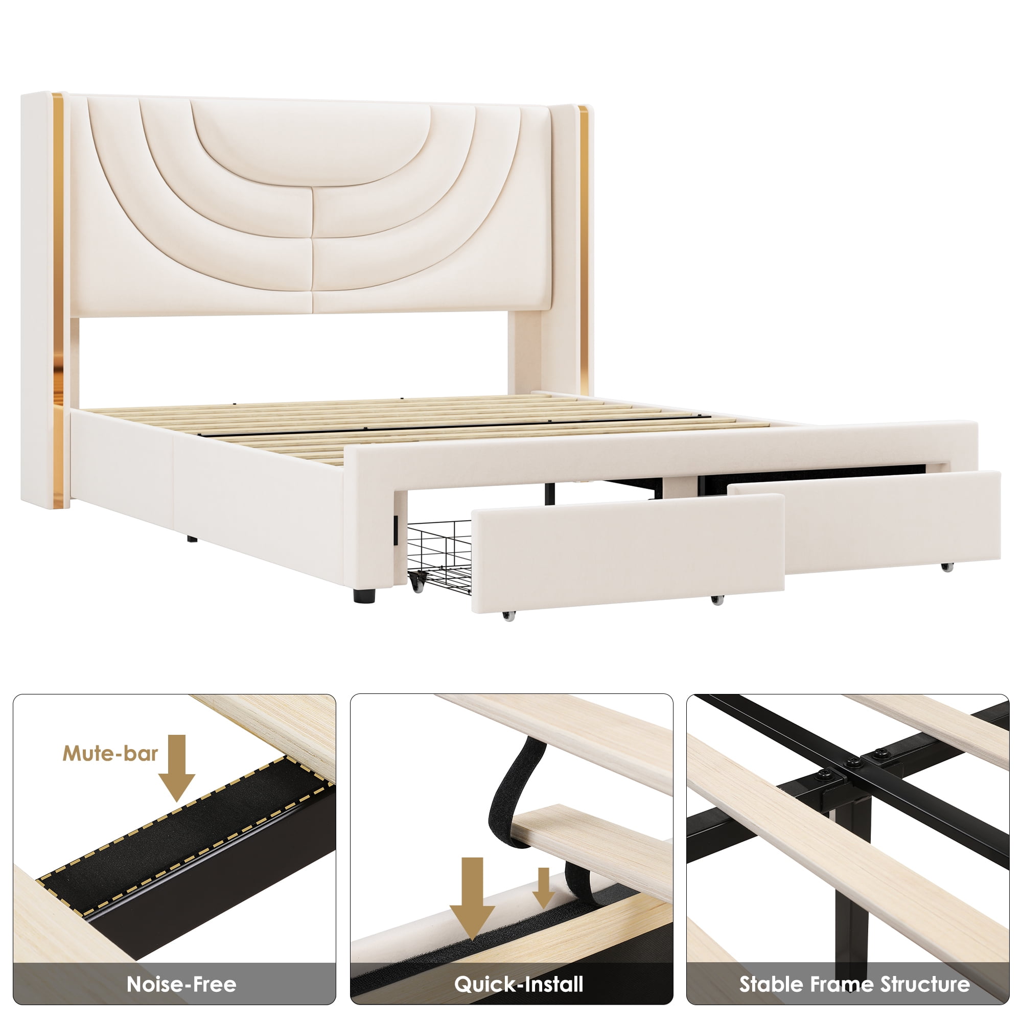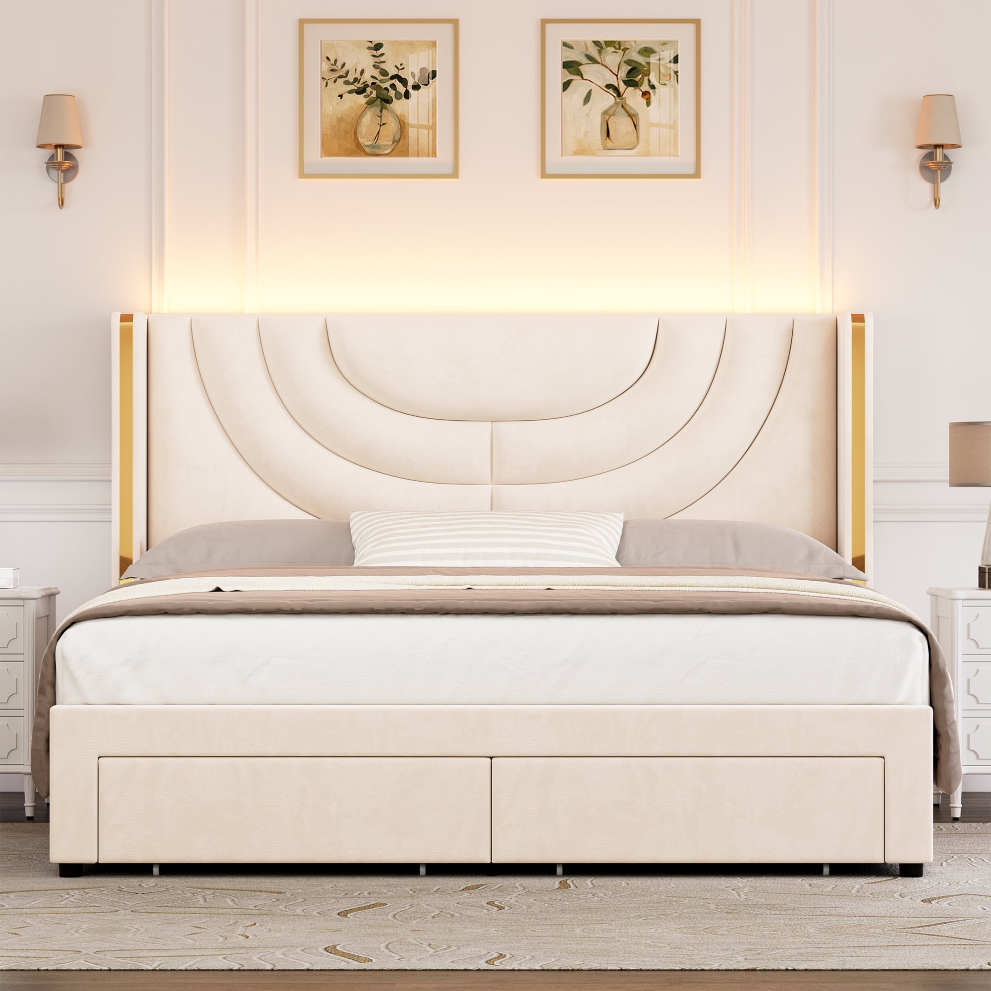 Homfa Full Size LED Bed Frame with 2 Drawer Storage, Wingback Platform Bed with Velvet Upholstered Headboard, Off-White
