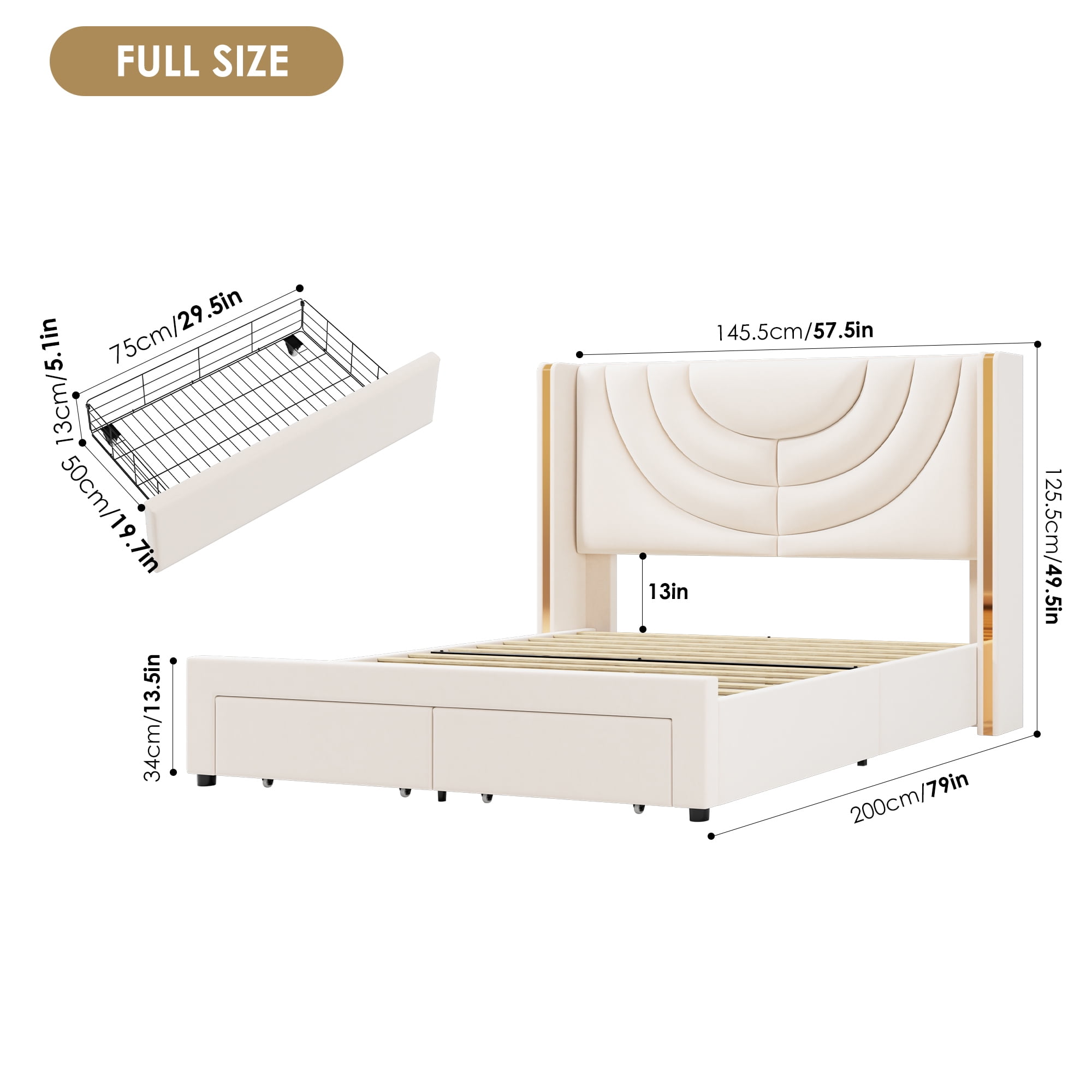 Comfortable Velvet Upholstered Bed Frame: Wingback bed is equipped with high-quality velvet cushions, which have a soft touch and improve the comfort of leaning on them. Built-in LED Light Bed Frame: Homfa full platform bed is equipped with adjustable 6000-color LED ambient light, dual remote control (APP & handheld remote control), customizable modes, built-in light strips without messy wires, and a silver titanium strip design on the edge of the headboard to make the light and shadow effect better at night. Storage Master: It is both a platform bed and a storage bed, under-bed drawers with smooth-rolling wheels for smooth opening and closing to help organize your bedroom.The drawer is fixed with velcro when closed and will not move randomly. Noise-reducing Bed Frame: 12 high-quality slat support, no need for bed box springs, upholstered bed with EVA silent sponge can reduce friction, no noise when turning over to sleep. Easy Assembly: The LED bed frame has a solid structure, the slats can be quickly installed with Velcro, and the instructions are detailed and easy to install. 24/7 Customer Service: Quality support – any storage bed questions, email us, and we’ll respond within 24 hours. Specifications: Available Size: Full Available Color: Off-White Material: MDF Wood & Velvet Fabric Assembly Required: Yes Product Weight: 46.2 KG/101.87 LBS Product Dimensions: 79″L x 57.5″W x 49.5″H Drawer Interior: 19.7″D x 29.5″W x 5.1″H Recommended Mattress Thickness: 10″ Number of Slats Included: 12 Headboard Shape: Rectangular Maximum Weight Recommendation: 800 lbs Package Include: 1 x Full Size LED Bed Frame 1 x Assembly Kit 1 x Instruction *Note: unplug charging cable when not in use.