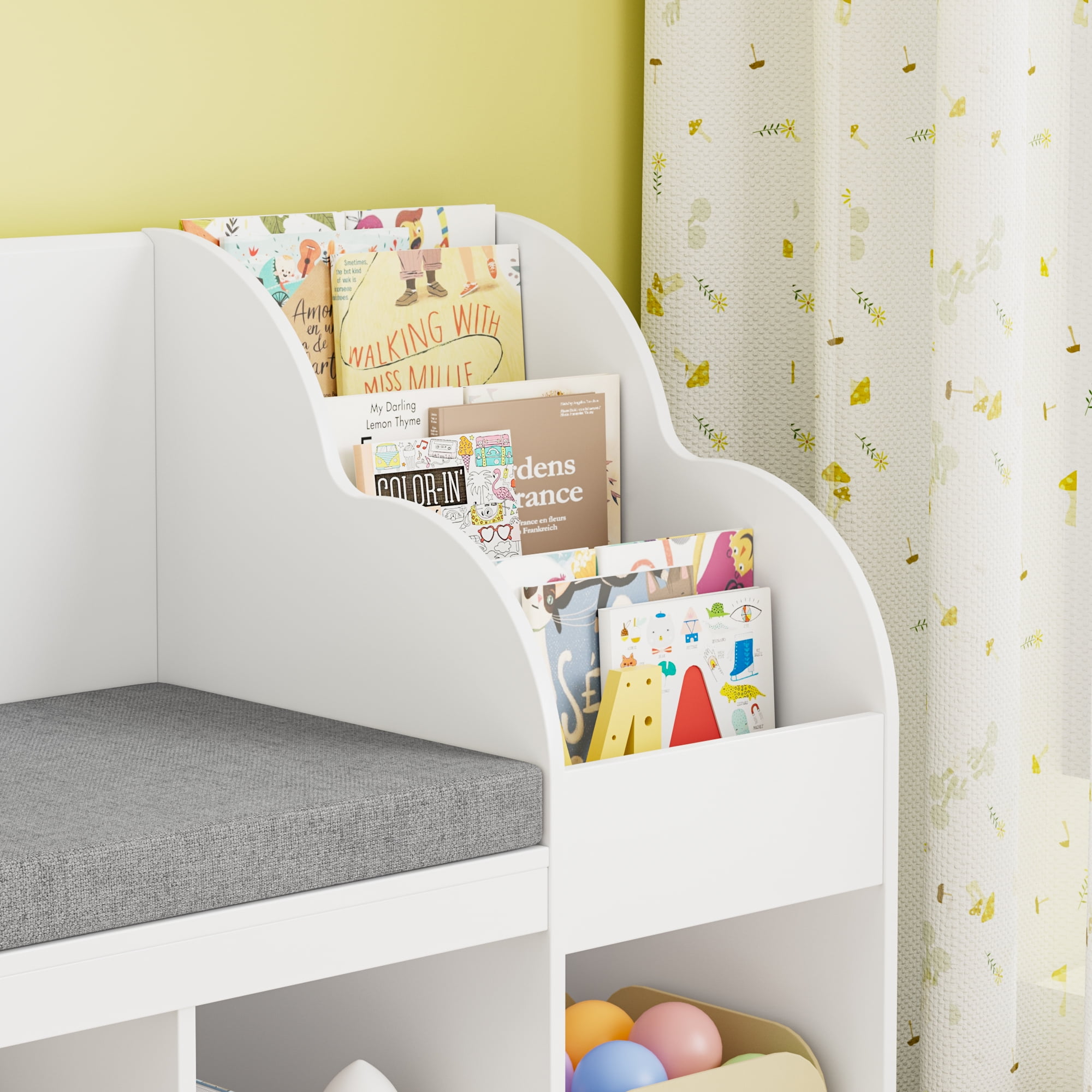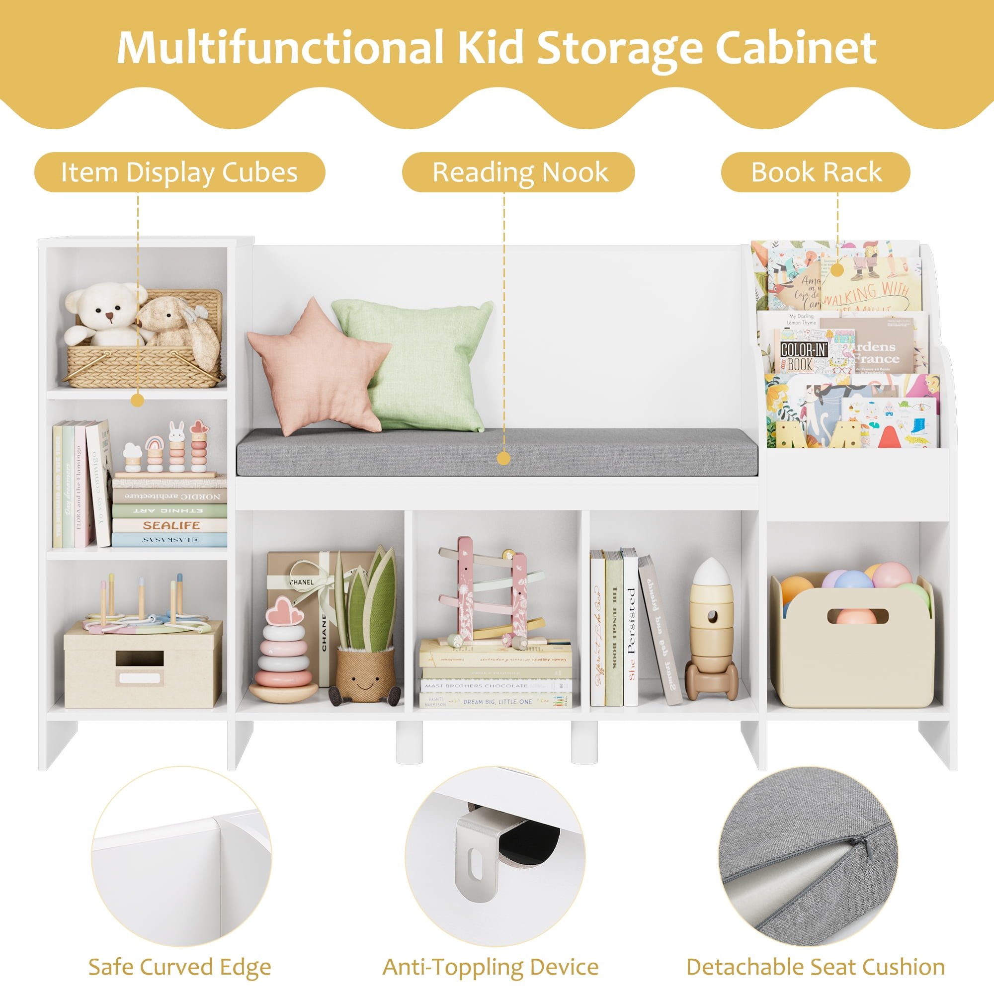 Homfa Kids Bookshelf with Reading Nook and Toy Cube Organizer: Safe Kids Reading Nook – 3 sides surrounded reading nook space, a scientific sturdy structure, carefully selected durable and environmentally friendly material, all of the product details make our homfa kids bookcase safe enough in daily use. Adjustable Kids Toy Shelf Organizer – 7 white cube organizer and 3 tier bookshelf besides the reading nook, homfa kids bookshelf will provide enough flexible space for kids book and toy storage. Material of High Quality and Easy-to-Clean – Environmentally friendly material ensure this kids bookshelf with reading nook and toy storage durable. Smooth painted finish is easy to clean. Neat home brings you nice emotion. Excellent Kids Gift – With cute appearance and great function, this kids bookshelf with reading nook definitely can become an excellent gift for kids! Easy Assembly – Detailed assembly step by step instructions and numbered accessories are ready to give you a helping hand. Even one person could finish in 1 hour. 24/7 Customer Service – We provide quality customer support, if you have any questions with this homfa kids furniture, please email us and we will reply within 24 hours. Specifications: Overall Dimension: 54.5”L x 15.7”W x 31.5”H Color: White Material: MDF Wood Overall Product Weight: 78 lb Assemble Required: Yes Package Includes: 1 x Kids Bookshelf with Reading Nook 1 x Accessory 1 x Instruction