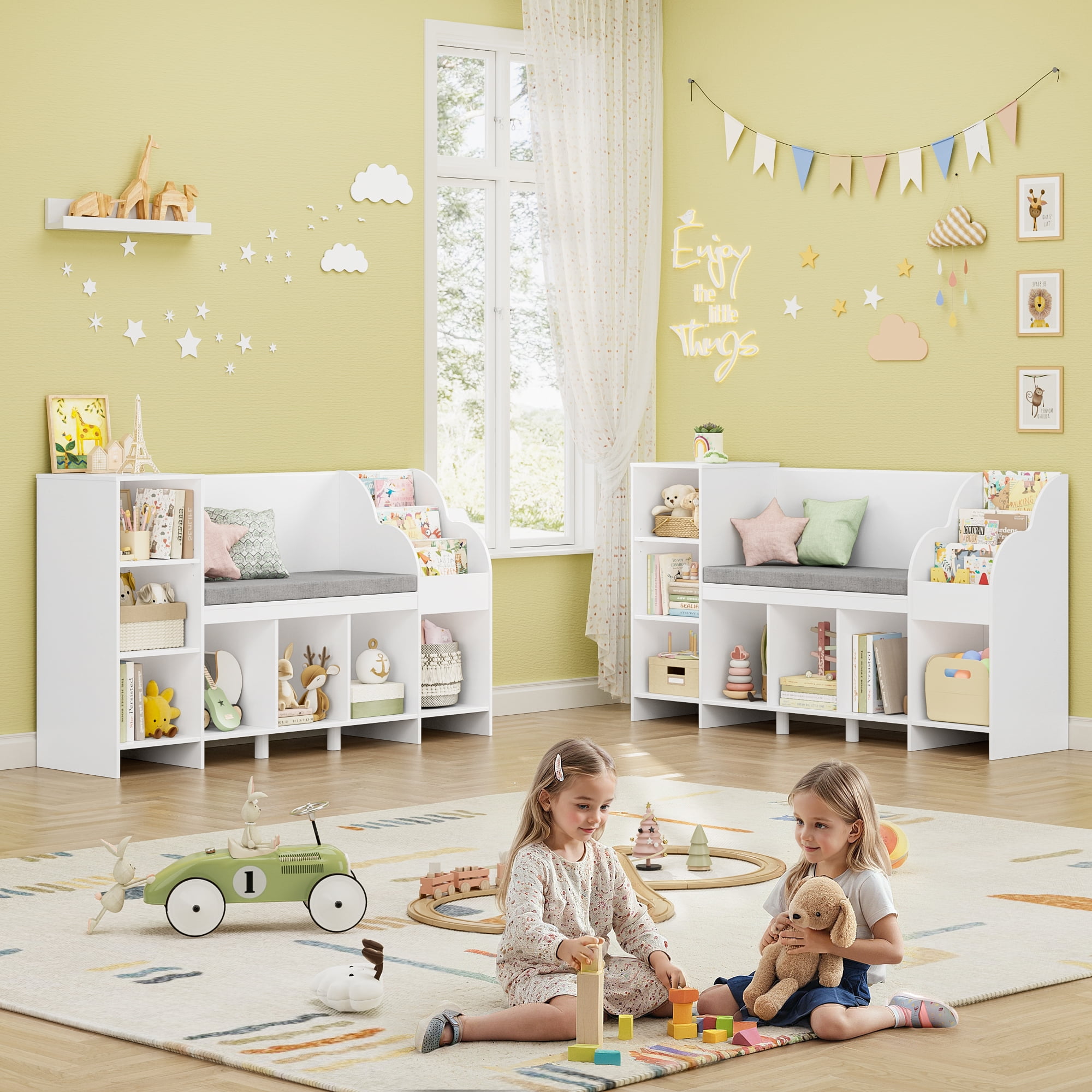 Homfa Kids Bookcase with Reading Nook, Wooden Kids Bookshelf and Storage Toy Cube Organization with Adjustable Shelf, 31.5” H x 54.5” W, White