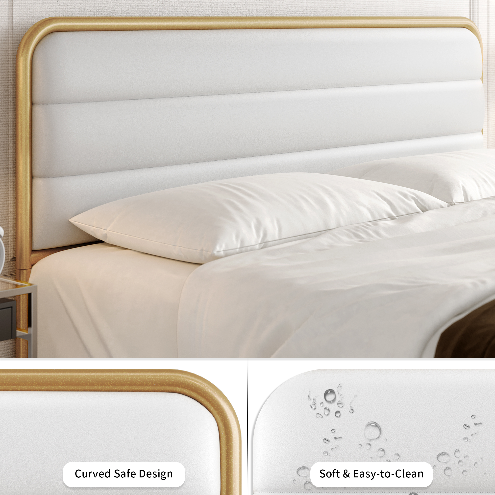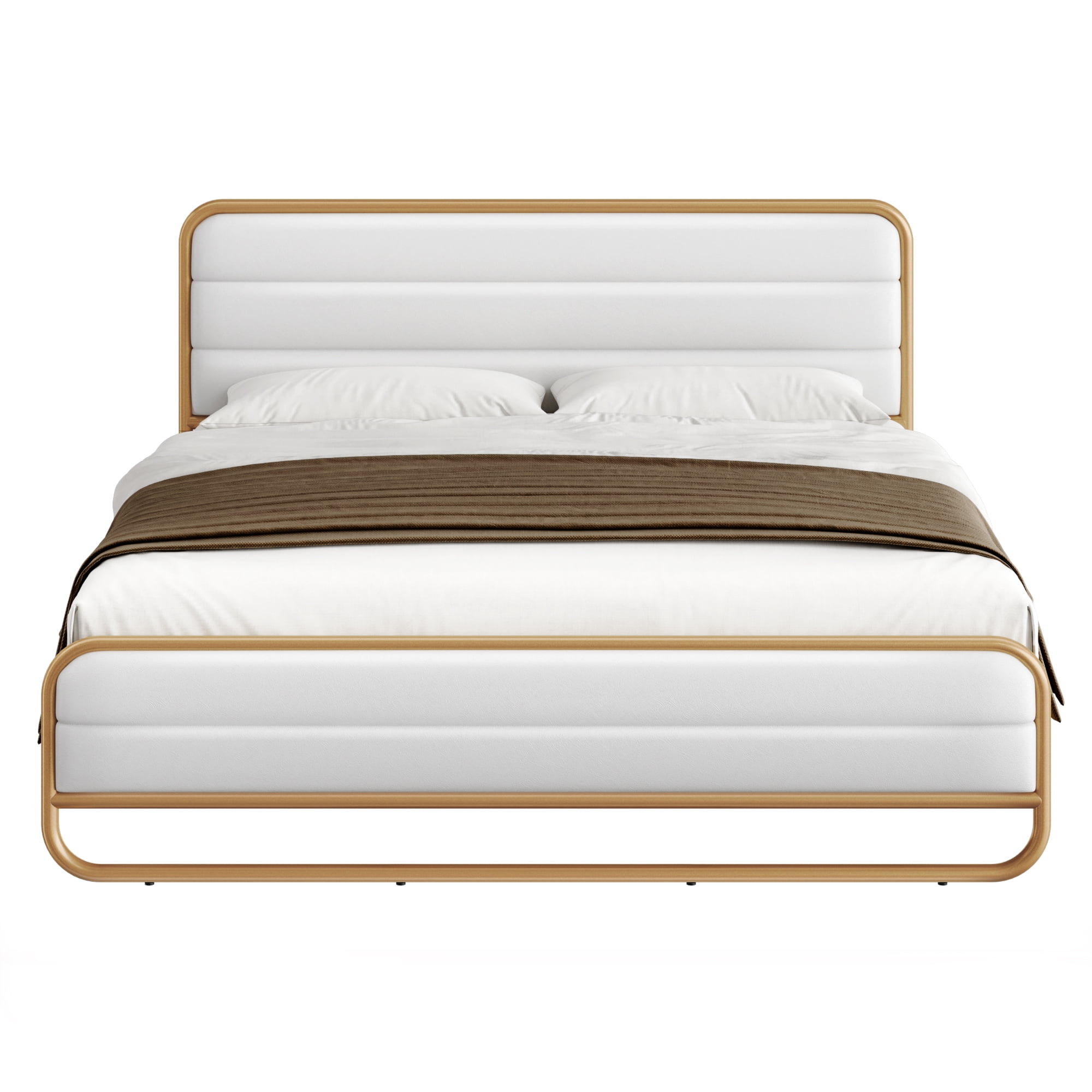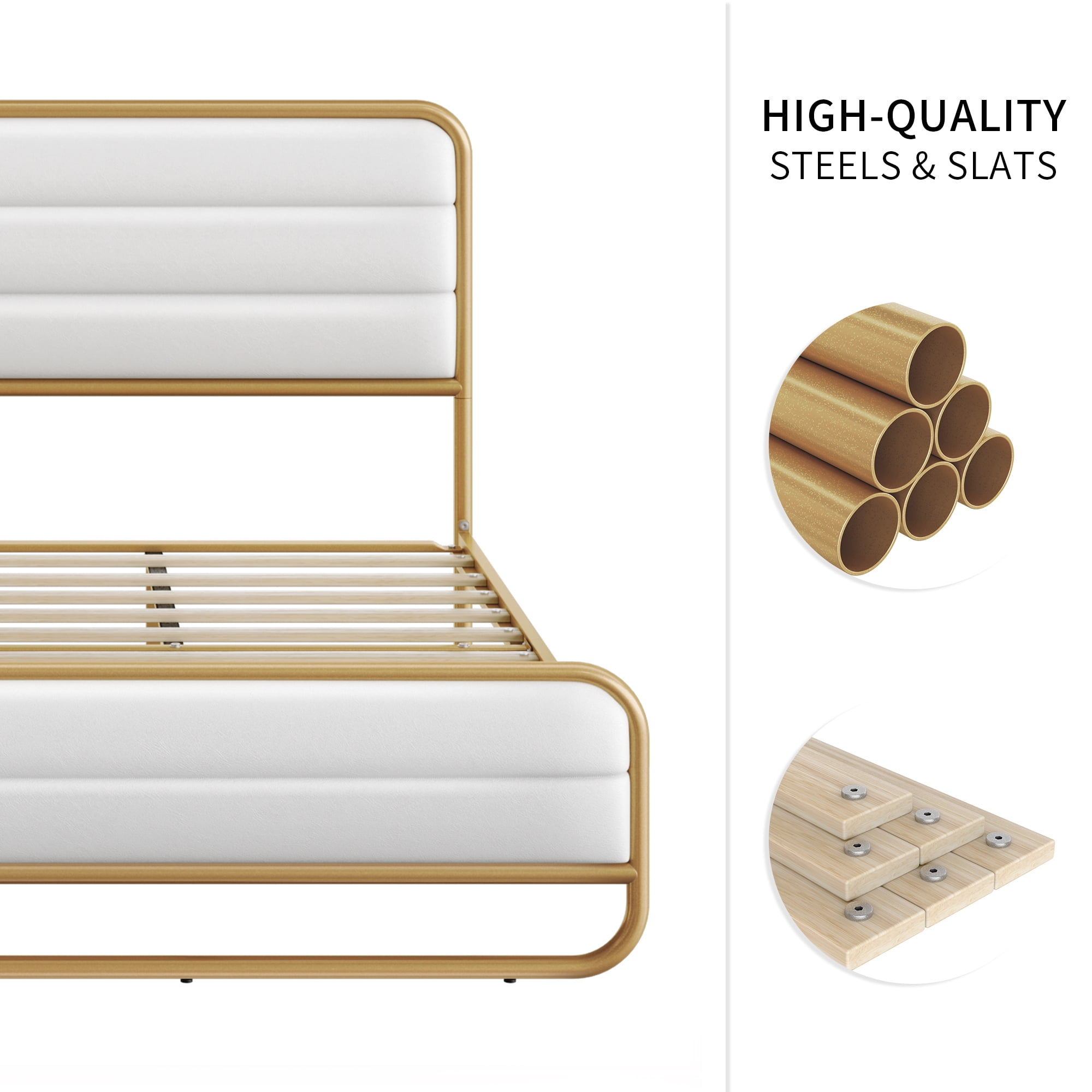 Homfa King Bed Frame with PU Leather Upholstered Headboard, Gold Metal Tubular Platform Bed with 10.6″ Under Bed Storage, White