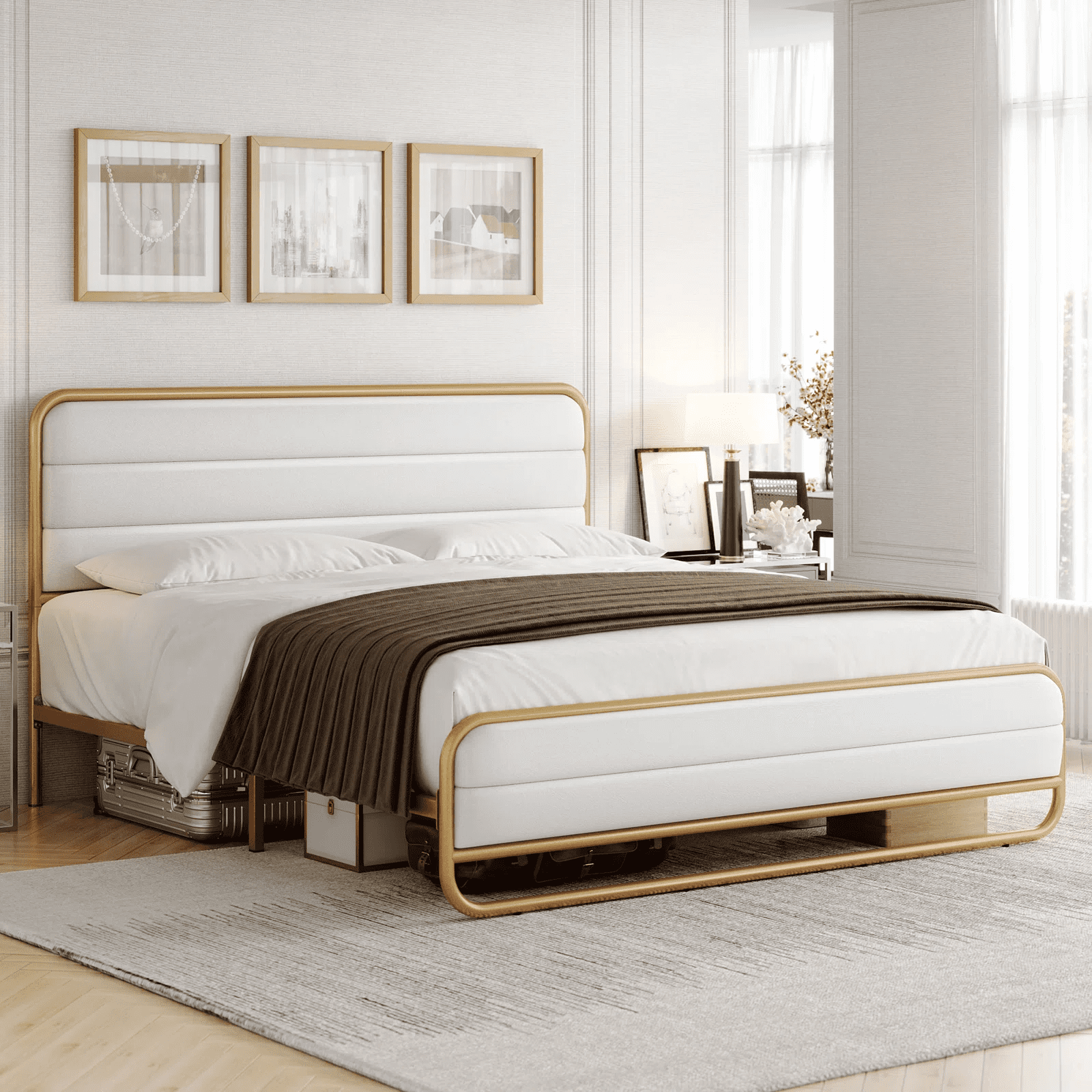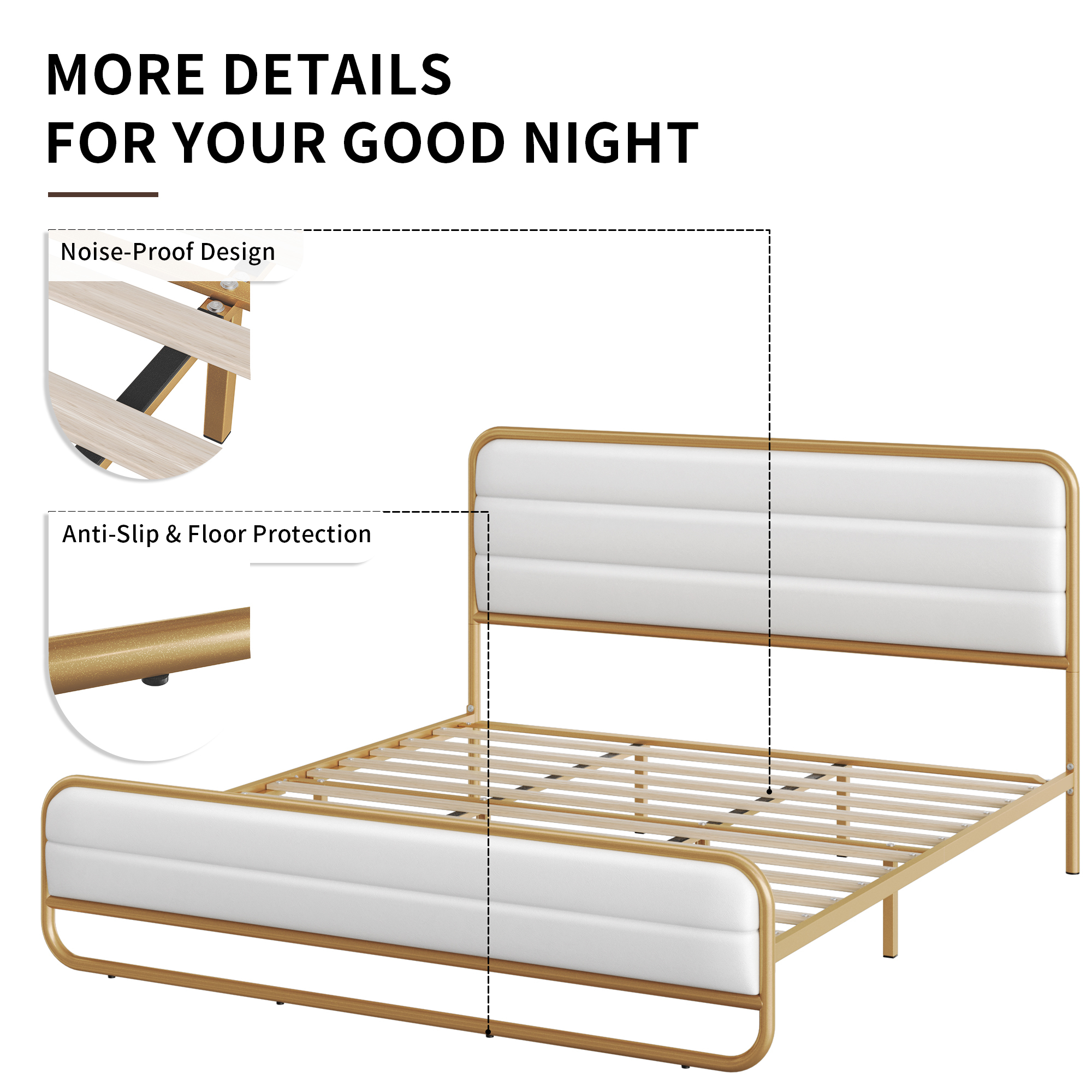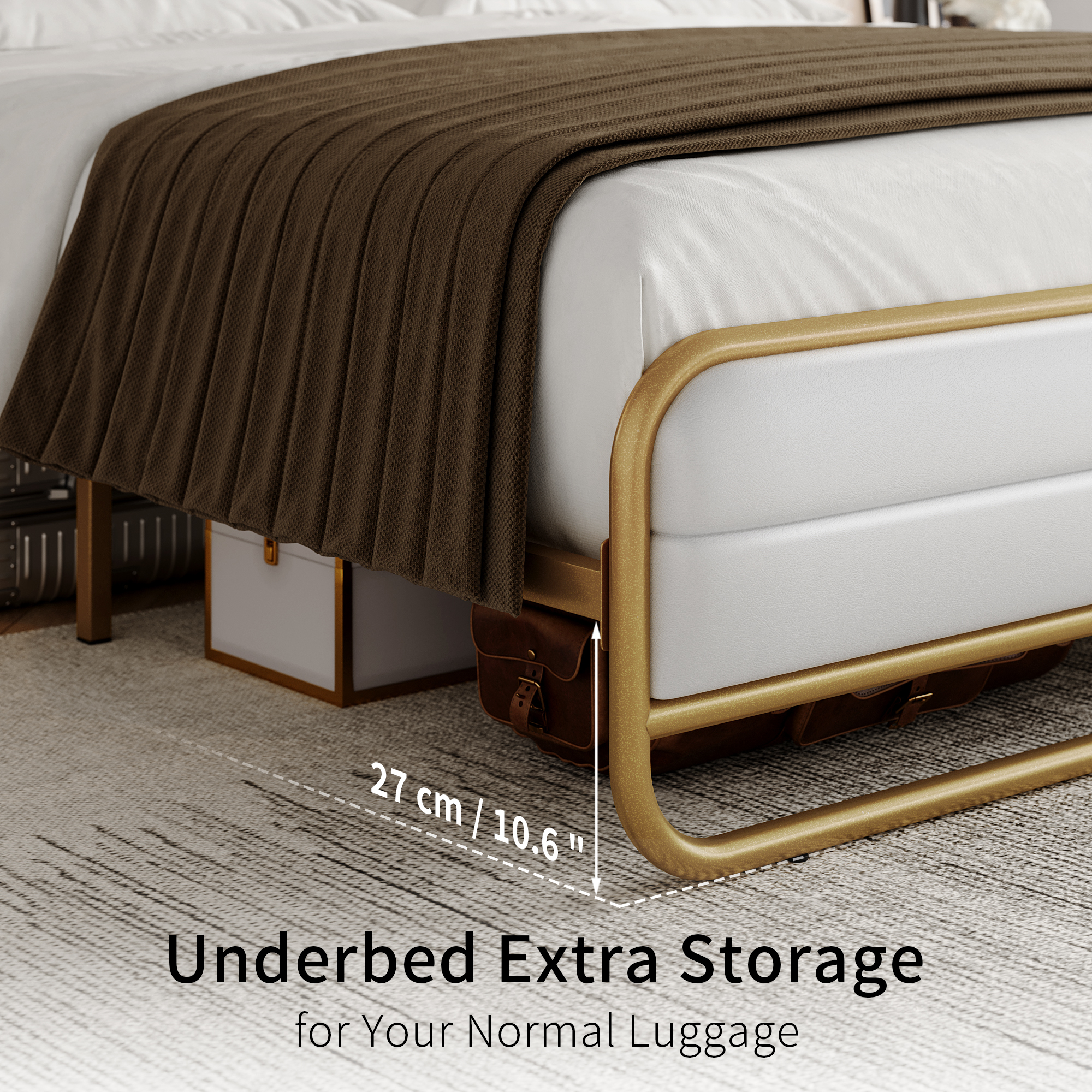 Homfa King Bed Frame with PU Leather Upholstered Headboard, Gold Metal Tubular Platform Bed with 10.6″ Under Bed Storage, White