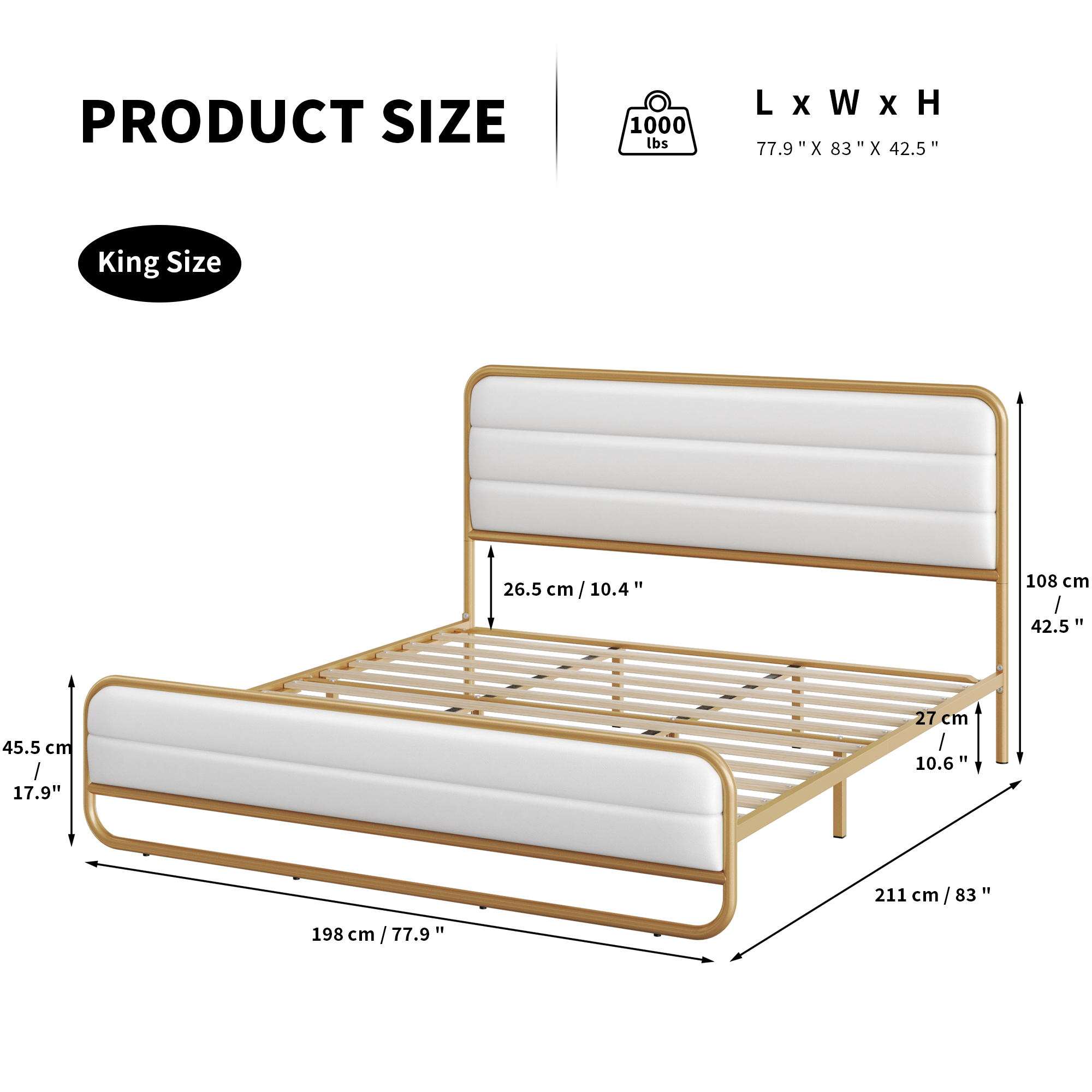 Features: 【Heavy Duty & Sturdy Structure】Both the thickened steel pipe and solid wood slats that together make up this Homfa bed frame are high quality materials, which makes the platform bed frame system stable enough to hold up to 850 pounds. 【Comfortable Upholstered Bed Frame】Well-filled and soft headboard futon, comfortable body support from neck to leg, bringing you gorgeous bedroom leisure time. 【Simple But Unique Design】Carefully selected PU leather upholstered headboard weighted metal bed frame, easy to match a variety of decor styles. 【Easy-to-Clean PU Leather】This Homfa bed frame has well-filled PU leather upholstered headboard and footboard, which have an easy-to-clean finish, keeping your bedroom fresh atmosphere, ensuring your safe and clean sleeping environment. 【Comfortable Upholstered Bed Frame】Well-filled and soft headboard futon, comfortable body support from neck to leg, bringing you gorgeous bedroom leisure time. 【Equipped with Quiet Sticker】Extra silent straps and rubber pads at the foot of the bed effectively reduce noise and prevent the bed frame from sliding, so you can enjoy every quiet night. 【Extra Under-bed Storage Space】10.6-inch-high space under the bed is higher than usual luggage and storage boxes, and the sweeper fits easily through it. 【Easy Assembly】Everything needed for assembly comes collected in a package sent to you. The Homfa bed frame platform could be easily assembled in less than an hour by 2 people with the instructions. 【24/7 Customer Service】 We provide quality customer support, if you have any questions, please email us and we will reply within 24 hours. Specification: Color: White & Gold Bed Size: King All Dimensions: 78.35″L X 77.76″W X 42.52″H Material: Metal + PU leather + Sponge Weight Capacity: 850lbs Height from the ground: 10.6 inch Recommended Mattress Thickness: 9″ – 12″ Assemble Required: Yes Package Includes: 1 x King Bed Frame 1 x Accessory Bag 1 x Installation Manual