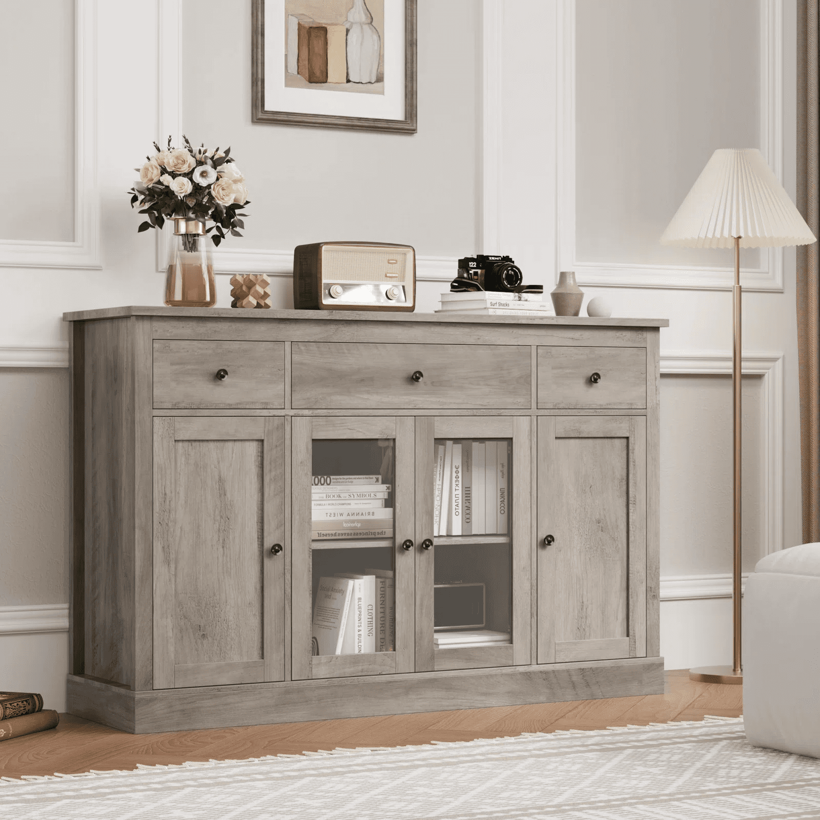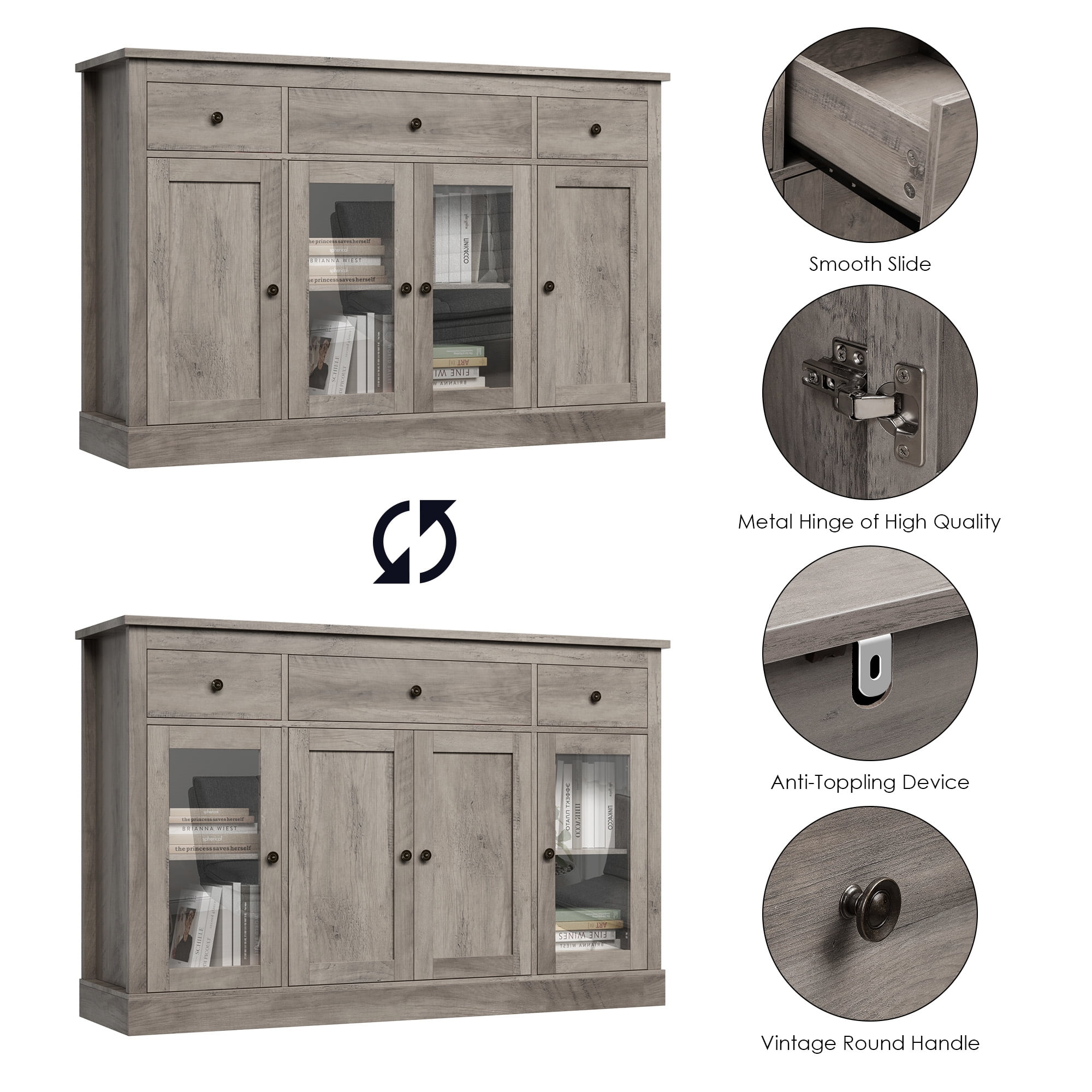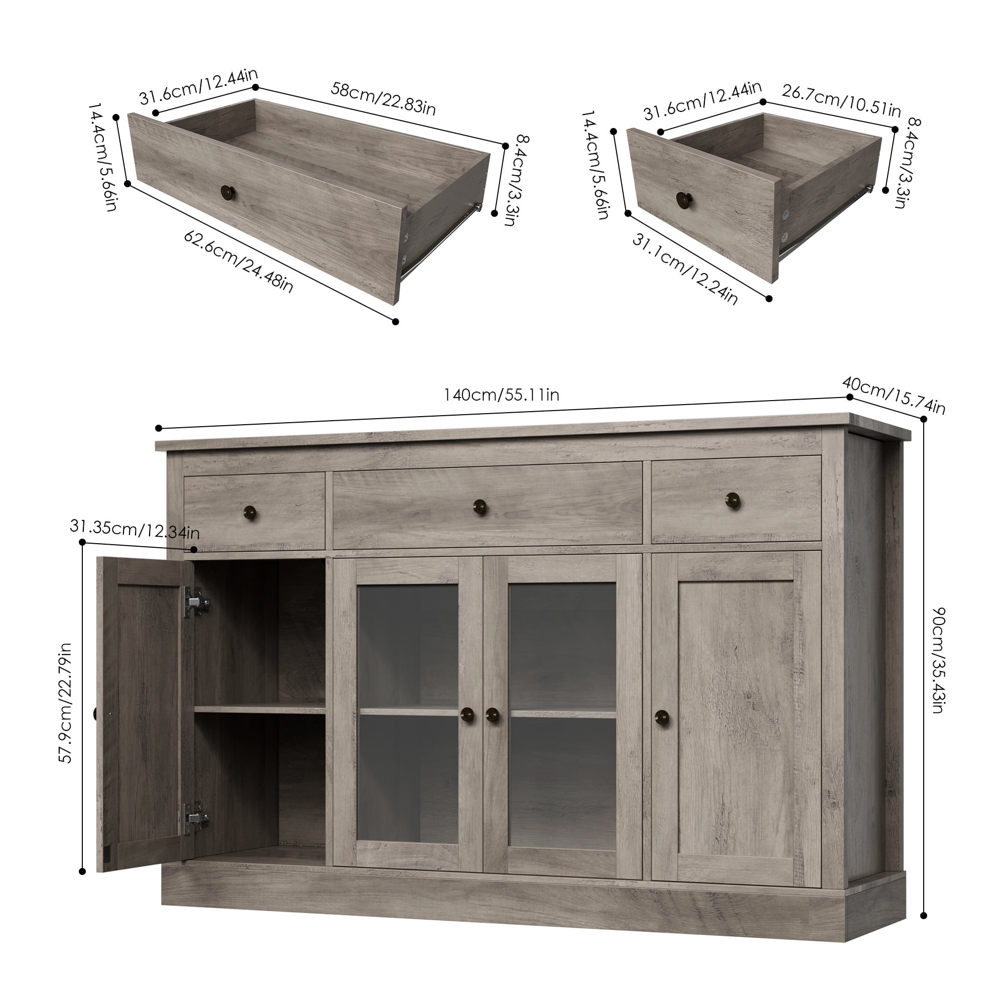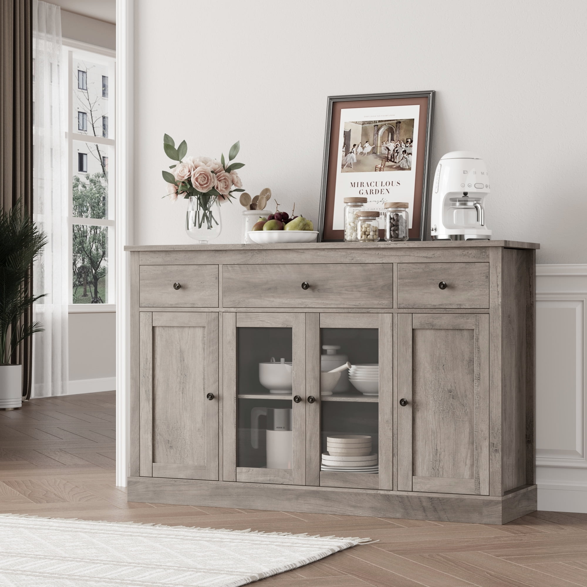 Features: Ample Space for Multiple Storage Needs – (Overall Size: 55.11” W X 15.74” L X 35.43” H) 3 large capacity drawers in 2 size and a 4-door accent cabinet shelf room with adjustable shelf board, accompanied open wide cabinet top, this homfa contemporary buffet table will provide as much and smart storage choice as possible for your wide range of storage needs. Multipurpose Sideboard – This kitchen buffet cabinet with storage drawer can not only keep your kitchen utensils in your kitchen as a credenza, but also play the role of your perfect storage assistant in your living room, dining room and other places, saving your valuable space. Simple Retro Style & 2 Door Organize Ways – Simple retro style looking of this homfa accent storage cabinet matches well to the decoration no matter where it is. There are two glass door organize way, which could bring you more joy of house decor. Sturdy Structure + Anti-Falling Device=More Safety – The steady construction of this kitchen buffet cabinet with drawer consists of scientific assembled design and carefully picked wood. Besides, this Homfa vintage coffee buffet cabinet includes 1 anti-falling device to prevent the cabinet from falling over! Durable & Easy-to-Clean – Consisting of material of high quality, this homfa farmhouse sideboard cabinet with drawer will be long lasting, while the surface is easy to clean, convenient to your daily clean keeping. Easy Assembly – Everything needed for assembly comes collected in a package sent to you. This buffet table could be easily assembled in less than an hour by 2 people with the detailed instructions. 24/7 Customer Service – We provide quality customer support, if you have any questions with this homfa kitchen buffet cabinet, please email us and we will reply within 24 hours. Specifications: Primary Material: Manufactured Wood Finish Color: Wash Gray Overall Size: 55.11” W X 15.74” L X 35.43” H Shelves Included: Yes Number of Shelves: 6 Doors Included: Yes Overall Product Weight: 114.6 lb. Tipover Restraint Device Included: Yes Hardware Finish: Vintage Brown Metal Package Contents: 1 x Buffet Cabinet 1 x Accessory Kit 1 x Instructions Manual