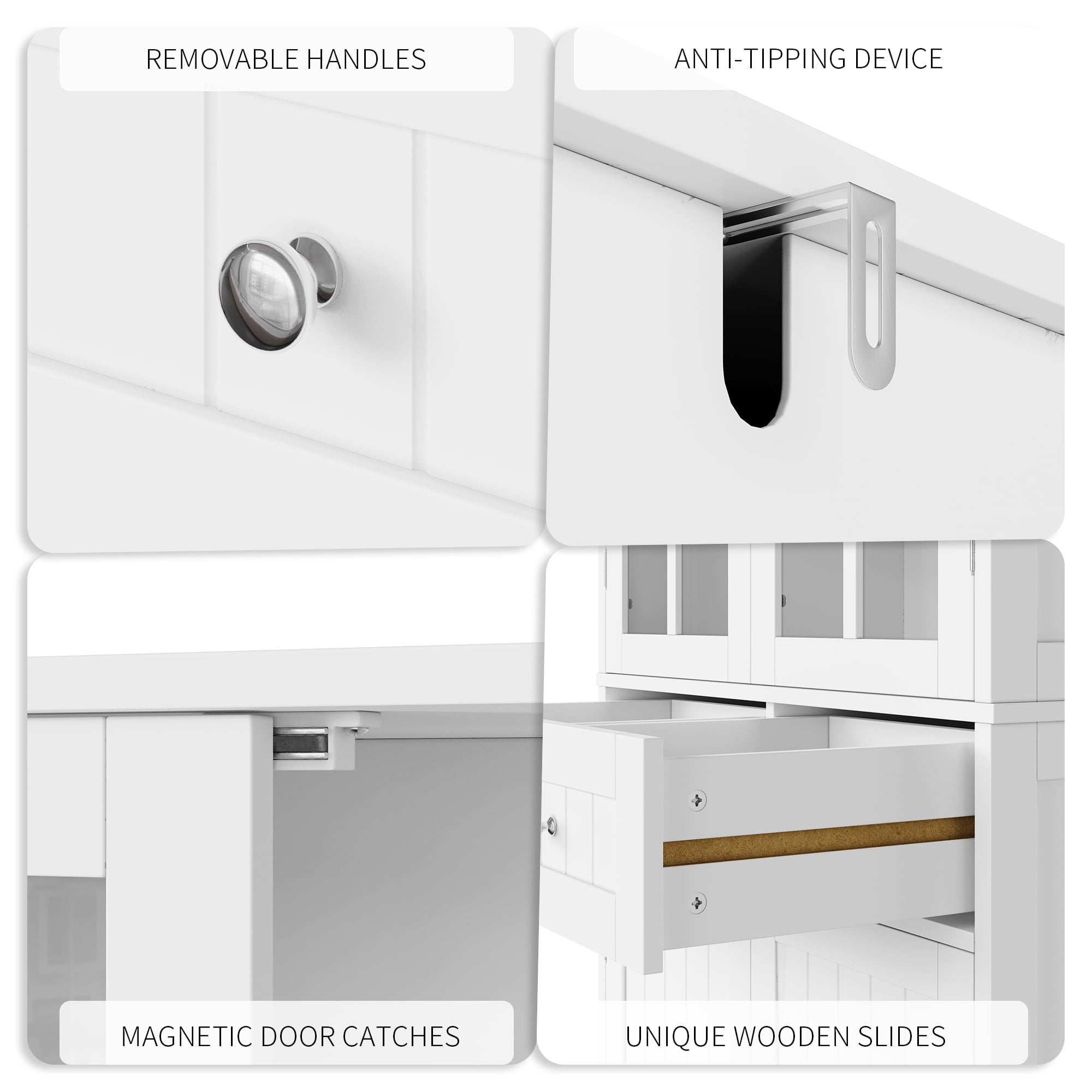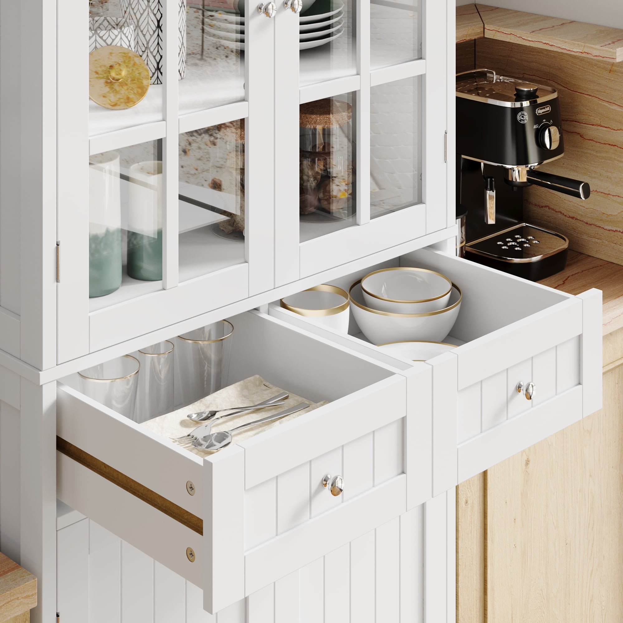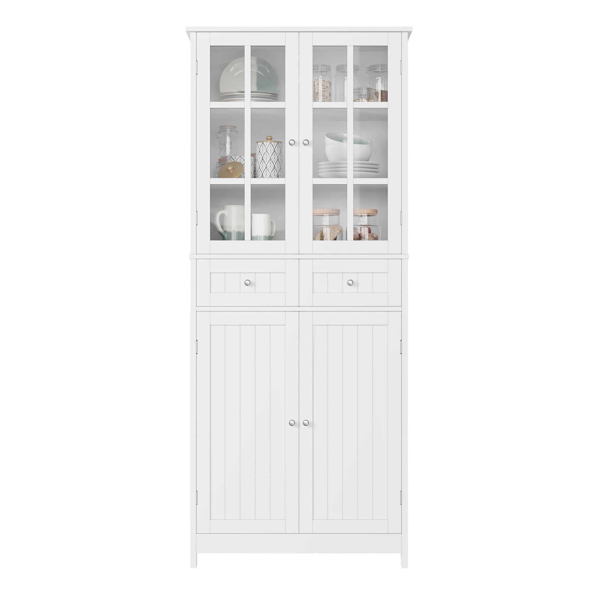 Features: [Multi-functional Storage] 6 closed areas for dishes, food, etc. 2 large drawers provide organized storage for small utensils such as knives and forks. [Versatile Storage Cabinet] This cabinet can be used in a variety of environments and scenarios. It is suitable for use as a kitchen cabinet, a dining sideboard, or as a free standing storage cabinet in the living room. [Transparent Tempered Glass Door] Sturdy tempered glass door is safe to use and you can also easily identify the contents of the cabinet. Quick to fetch items. [Waterproof Surface – Easy To Maintain] Smooth surface, easy to clean and maintain, just wipe gently with a damp towel! [Modern Look] The clean white finish and simple lines create a chic, modern sideboard cabinet that will easily blend in with your dining room decor. [Quality Panels & Safe Anti-Tipping Device] This tall storage cabinet is made of durable P2 grade engineered wood, has a reinforced back panel and anti-tipping for added stability. [Easy to assemble] The instructions are very detailed and easy to understand, so even inexperienced people can quickly complete the installation in less than 1 hour. [24/7 Customer Service] We provide quality customer support, if you have any questions, please email us and we will reply within 24 hours. Specification: Primary Material:Manufactured Wood Color: White Overall Size:71” H X 27.5” W X 15.7” D Drawer Interior: 6.1” H X 13” W X 15” D Shelf Size:27.5” W X 15” D Cabinet Interior:27.5” W Overall Product Weight:87 lb. Number of Shelves:6 Number of Drawers:2 Weight Capacity:300 lb. Package Contents: 1 x Kitchen Pantry 1 x Accessory Kit 1 x Instruction