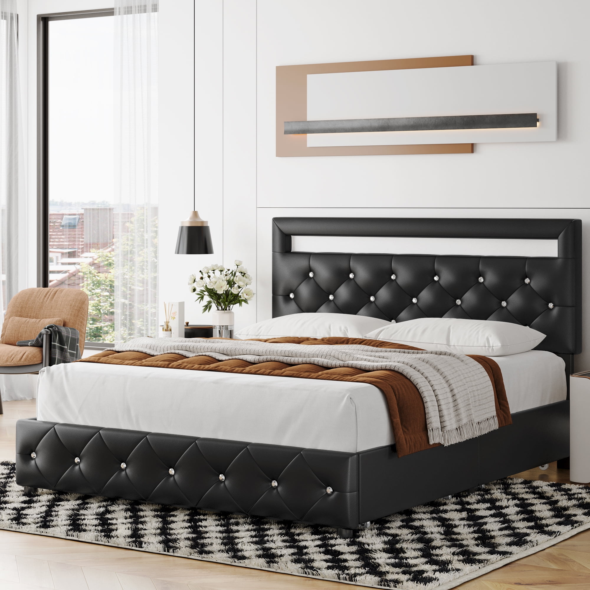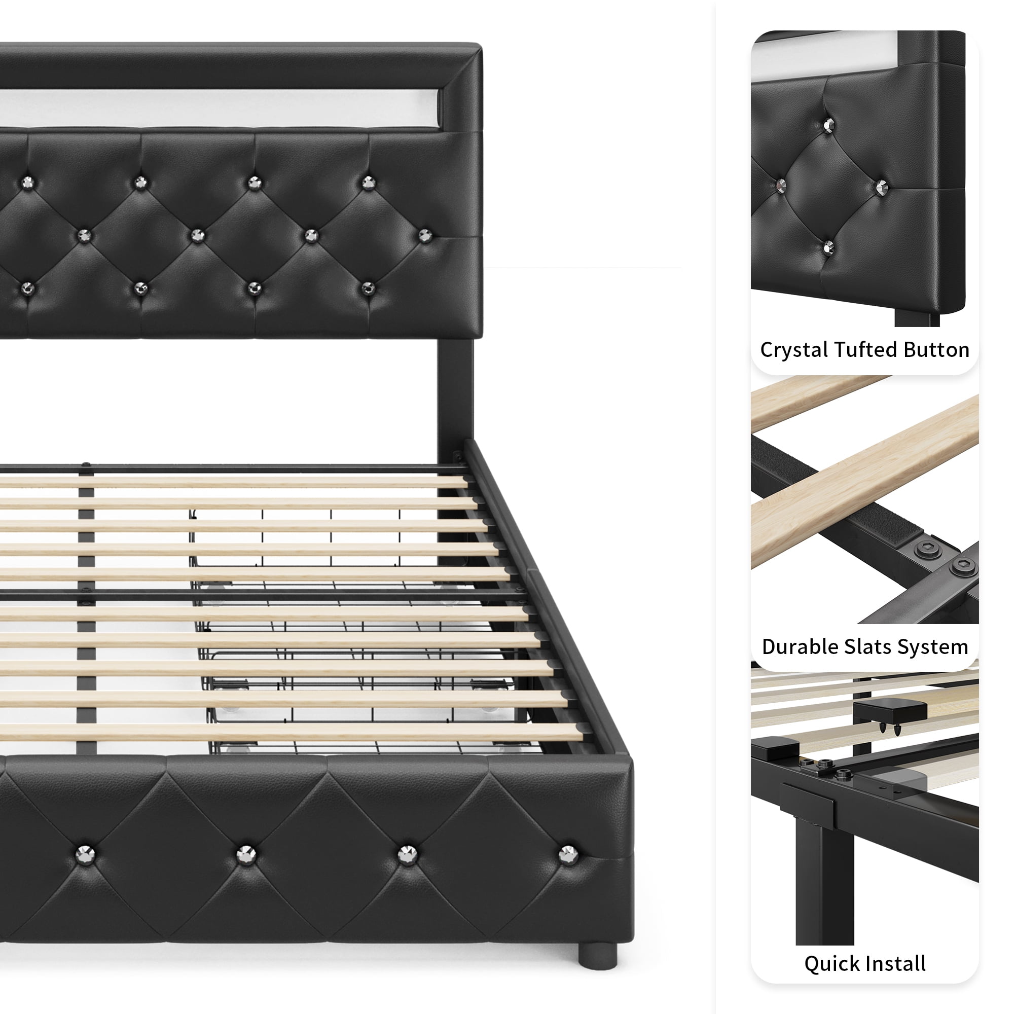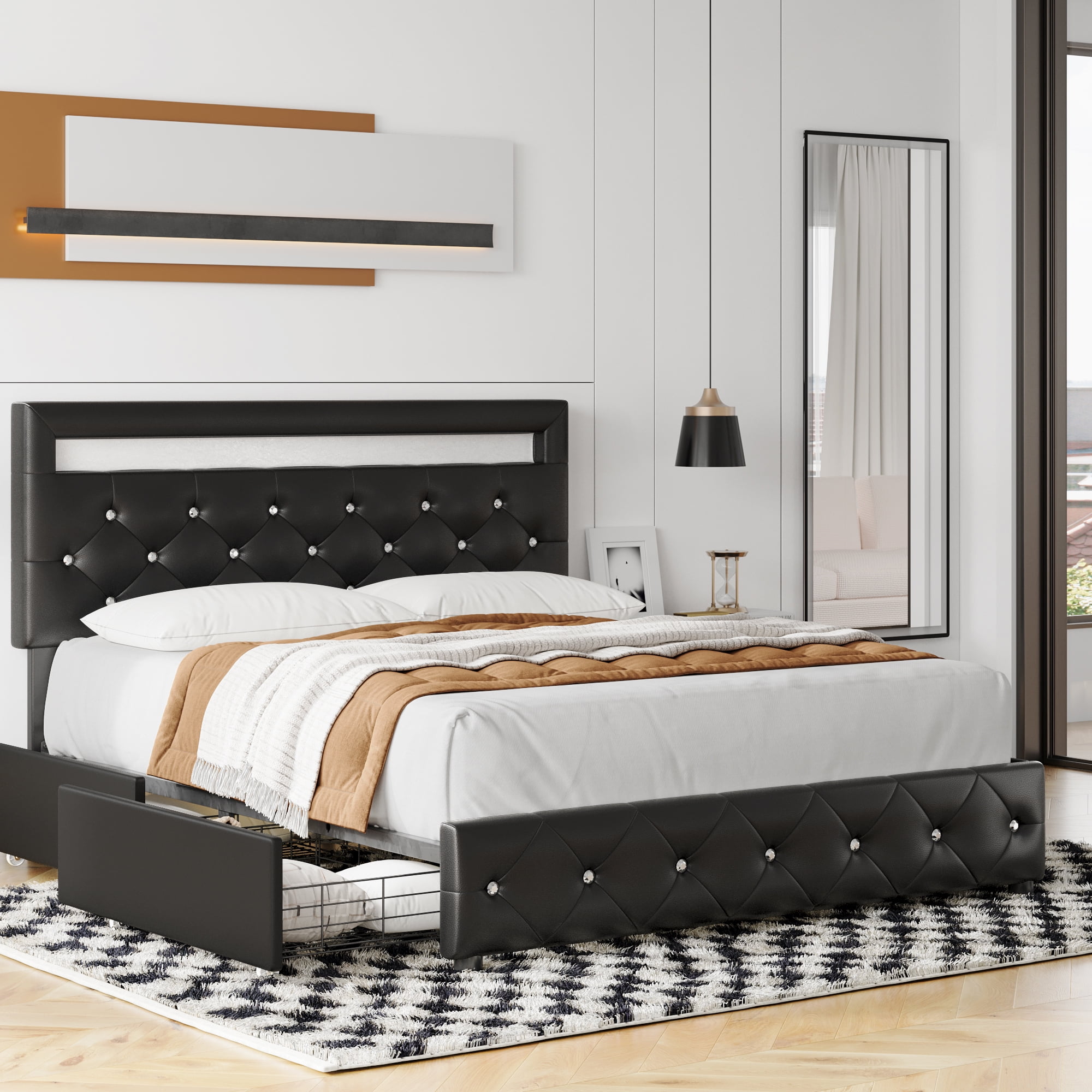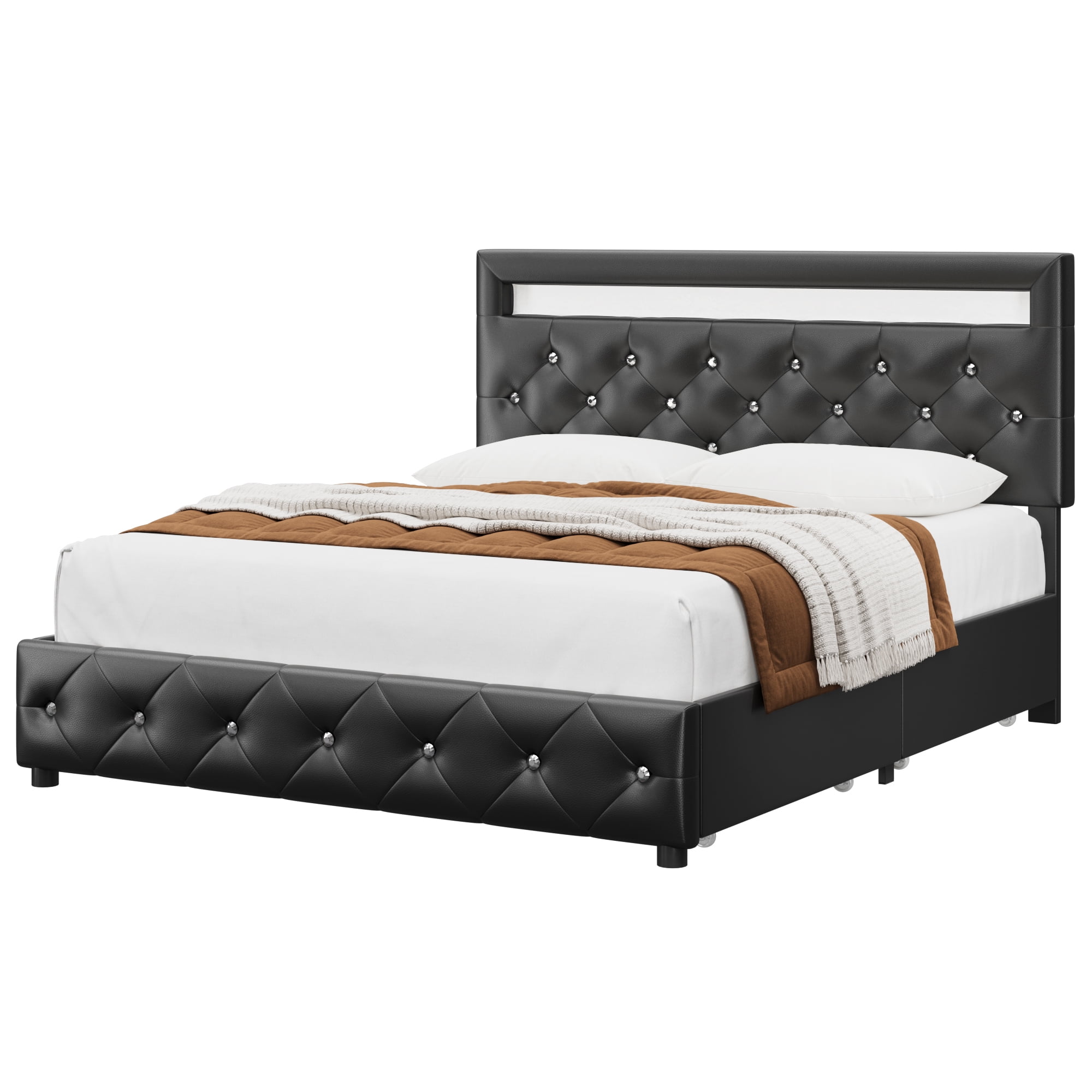 Homfa Queen LED Bed Frame with 4 Storage Drawer, Upholstered Platform Bed with Adjustable Crystal Button Tufted Headboard, Black