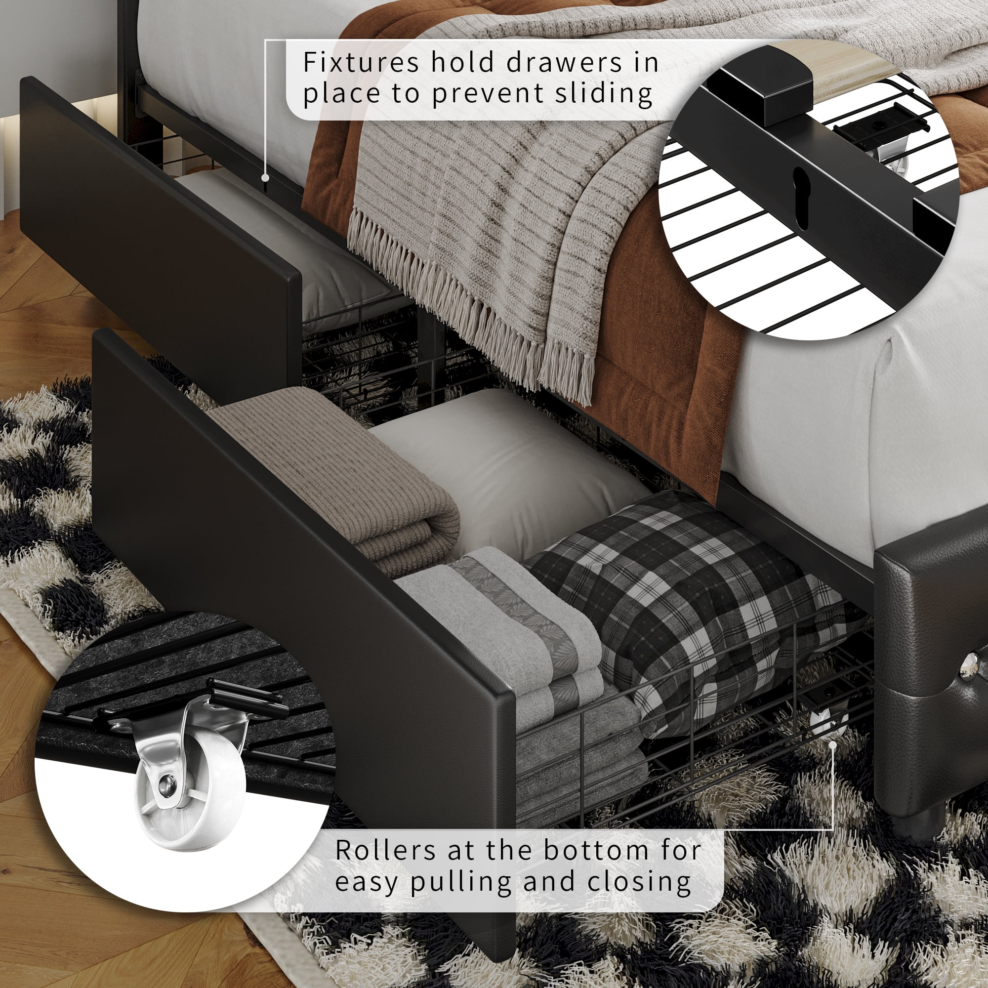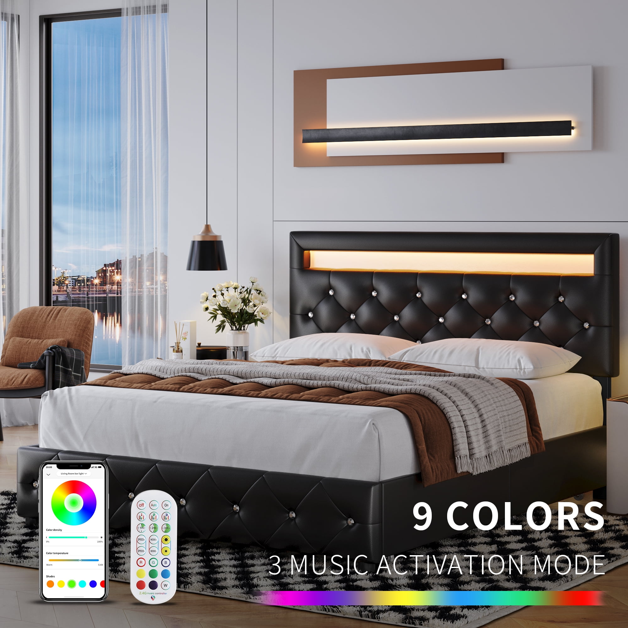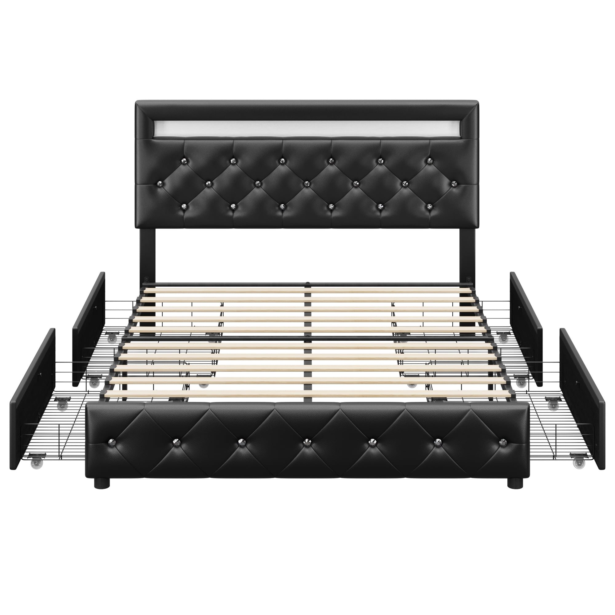 Features 【Headboard with LED Lights】The LED light can be controlled remotely or via a mobile app, with a choice of 9 colors and 3 music activated modes. 【Bed with 4 Storage Drawers】4 large capacity storage drawers with smooth wheels are equipped underneath the bed frame to easily store a variety of linens, clothing and more. 【Adjustable Headboard】The headboard has 2 height adjustments to fit mattresses from 10-12 inches. 【Sturdy and Durable】The bed frame is supported by sturdy solid wood slats. Weight capacity up to 800 lbs and no box spring needed. 【Quiet & Noise Free】We use silent strips under all slats to prevent squeaking from the friction between the wooden slats and the metal frame, bring you every quiet night. 【Easy to Assemble】With the help of all mounting hardware and detailed instructions, 2 adults can assemble it easily in 1 hour. Quality customer service saves you from the worry of lost and damaged parts. 【24/7 Customer Service】We provide quality customer support, if you have any questions, please email us and we will reply within 24 hours. Specification Bed Size: Queen Color: Black Material: Wood, PU Leather, Steel Headboard Fabric: PU Leather Item Dimensions: 85″L x 64.6″W x 44.1″H Inner Drawer Size: 31.5″ x 23.6″ x 5.5″ Item Weight: 112 lbs Weight Capacity: 800 lbs Recommended Mattress Thickness: 10-12″ Number of Storage Drawers: 4 Assembly Required: Yes Package Contents 1 x Queen Size LED Bed Frame 1 x Assembly Kit 1 x Instruction