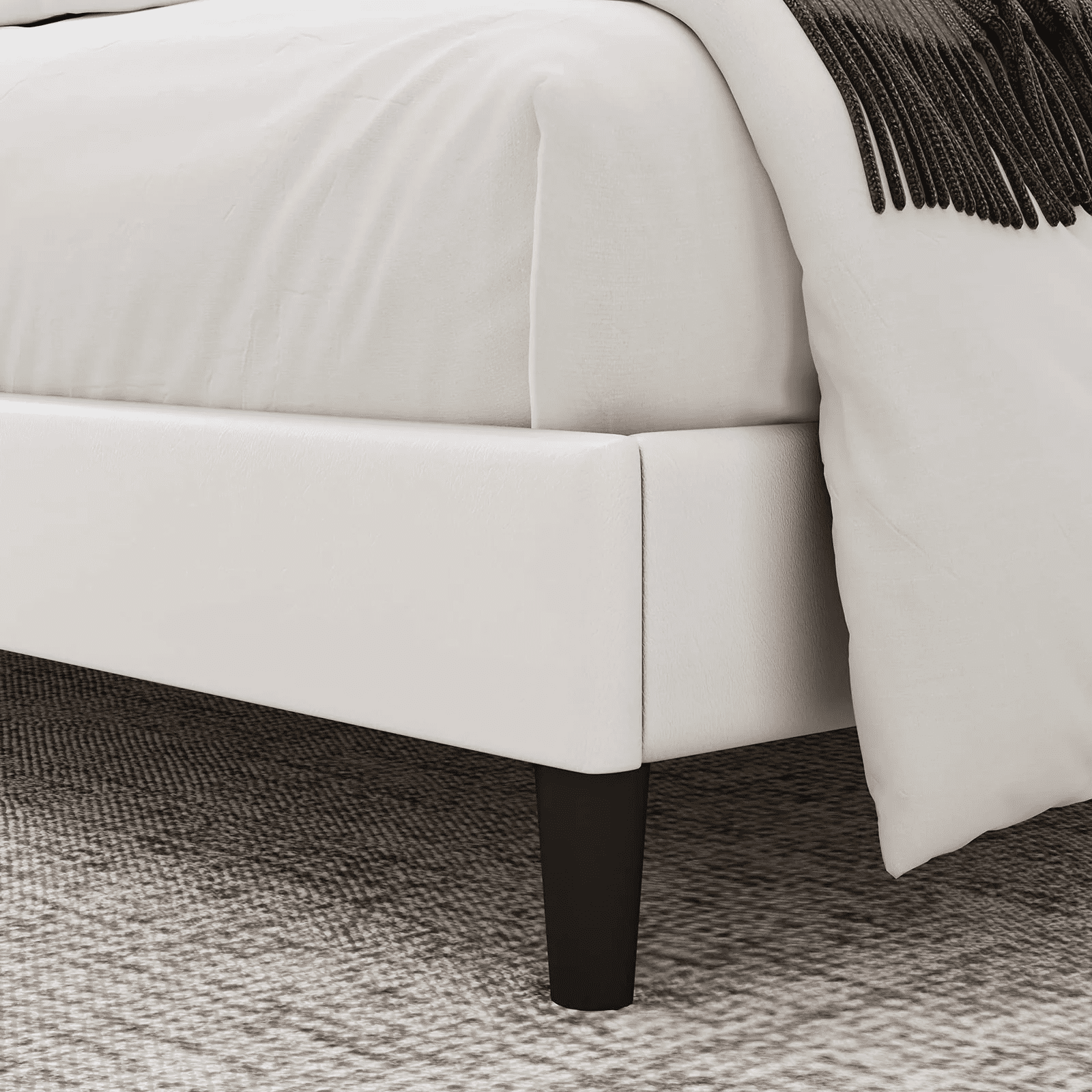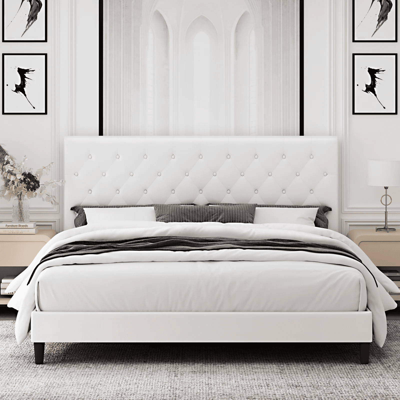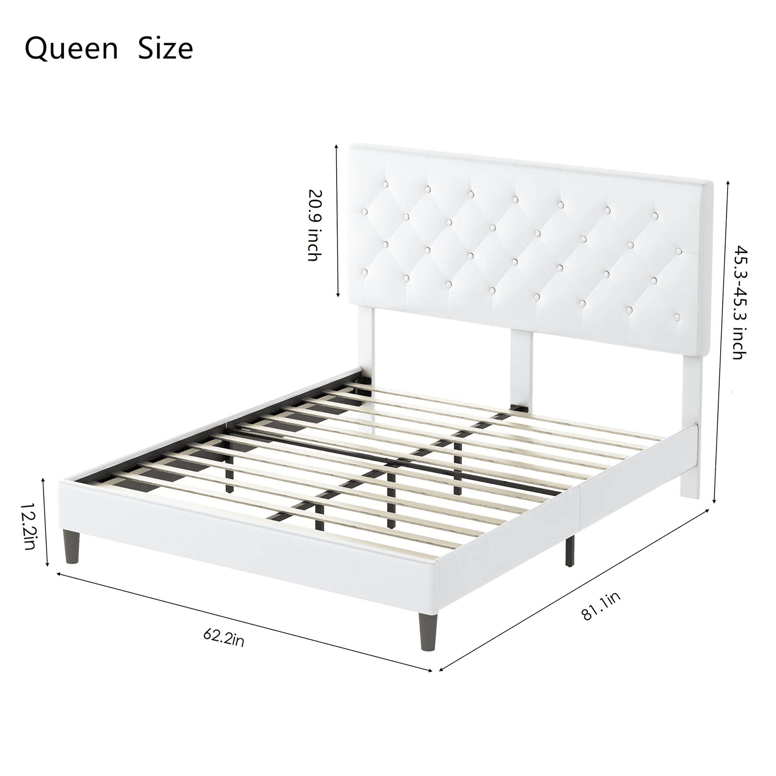 Features 【Top Faux Leather】A classic tufted leather material that can seamlessly match any bedroom design, the top faux leather platform bed frame will have you feeling sheltered in comfort and luxury and is easy to clean, keep hygienic, and noise-free. 【Sturdy Structure】The queen size upholstered bed frame only uses high-quality materials and mature manufacturing technology; post-style legs provide stability, the wood frame structure contributes to a feeling of unparalleled stability, and the anti-floor scratch design and soft sponge padding add comfort and longevity. 【Suitable for 10-12 inch Mattress】The classic button-tufted headboard can be adjusted from 43.3″ to 45.3″ and can be adapted to mattresses of different heights. 【No Box Spring Needed】The low-profile platform bed frame uses durable wood slats to support and extend the life of your mattress without the need for a box spring. The upholstered platform bed easily supports up to 800 lbs. and assembles in just minutes. 【Product Dimensions】The bed frame’s slats are spaced 3.3 inches apart. Ships in one box. Simple assembly required. Specifications Frame & Material: Manufactured Wood Upholstery Material: Faux leather Faux Leather Type: PU Color: White Size: Queen Dimensions: 81.1″ L x 62.2″ W x 43.3″-45.3″ H Weight Capacity (lb): 800 Lbs Suitable Mattress Height: 10-12 inch Package Contents 1 x Faux Leather Upholstered Bed Frame 1 x Assembly Kit 1 x Instructions NOTE: Mattress sold separately. Everything you need for assembly comes zipped up in a compartment behind the headboard for convenience.